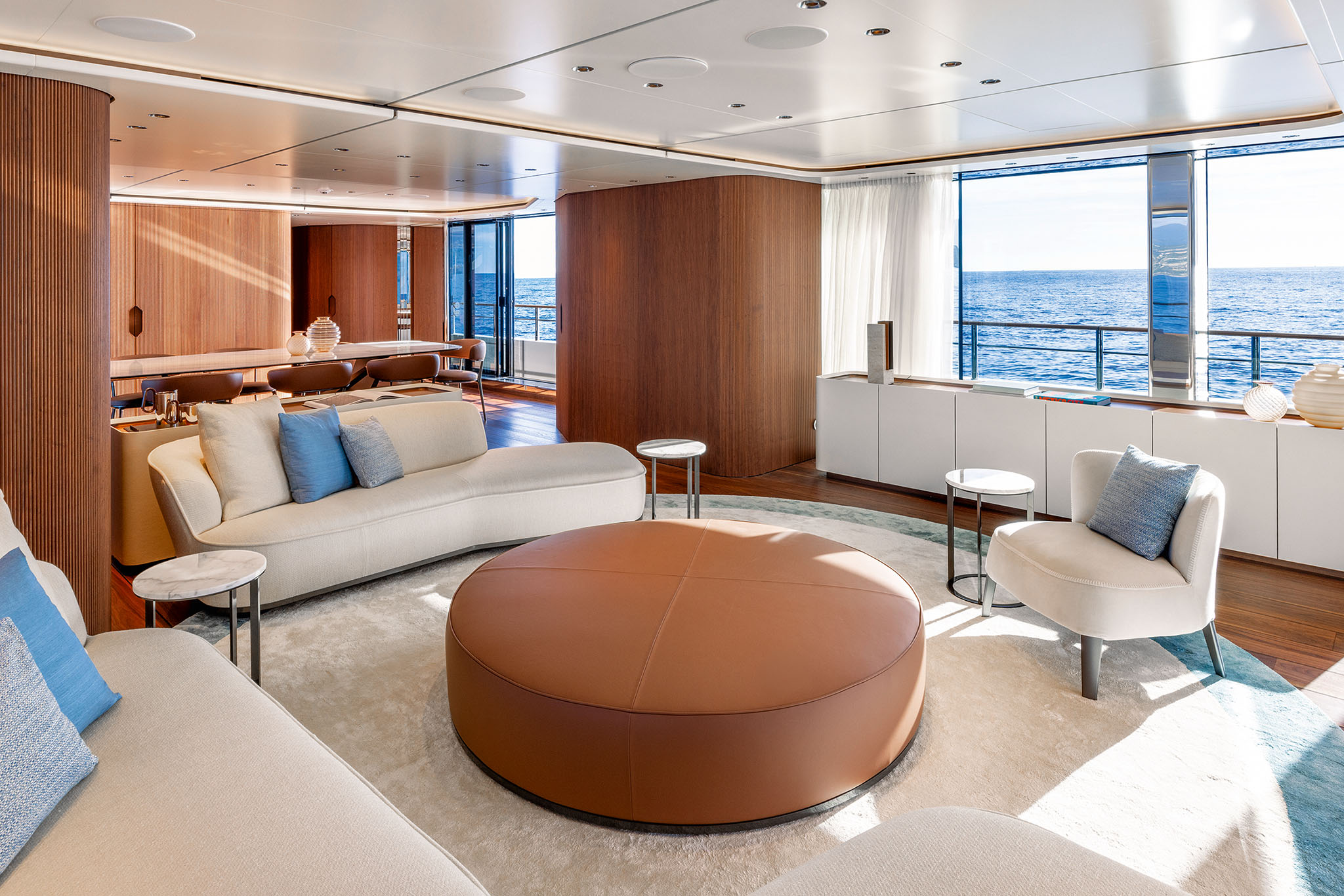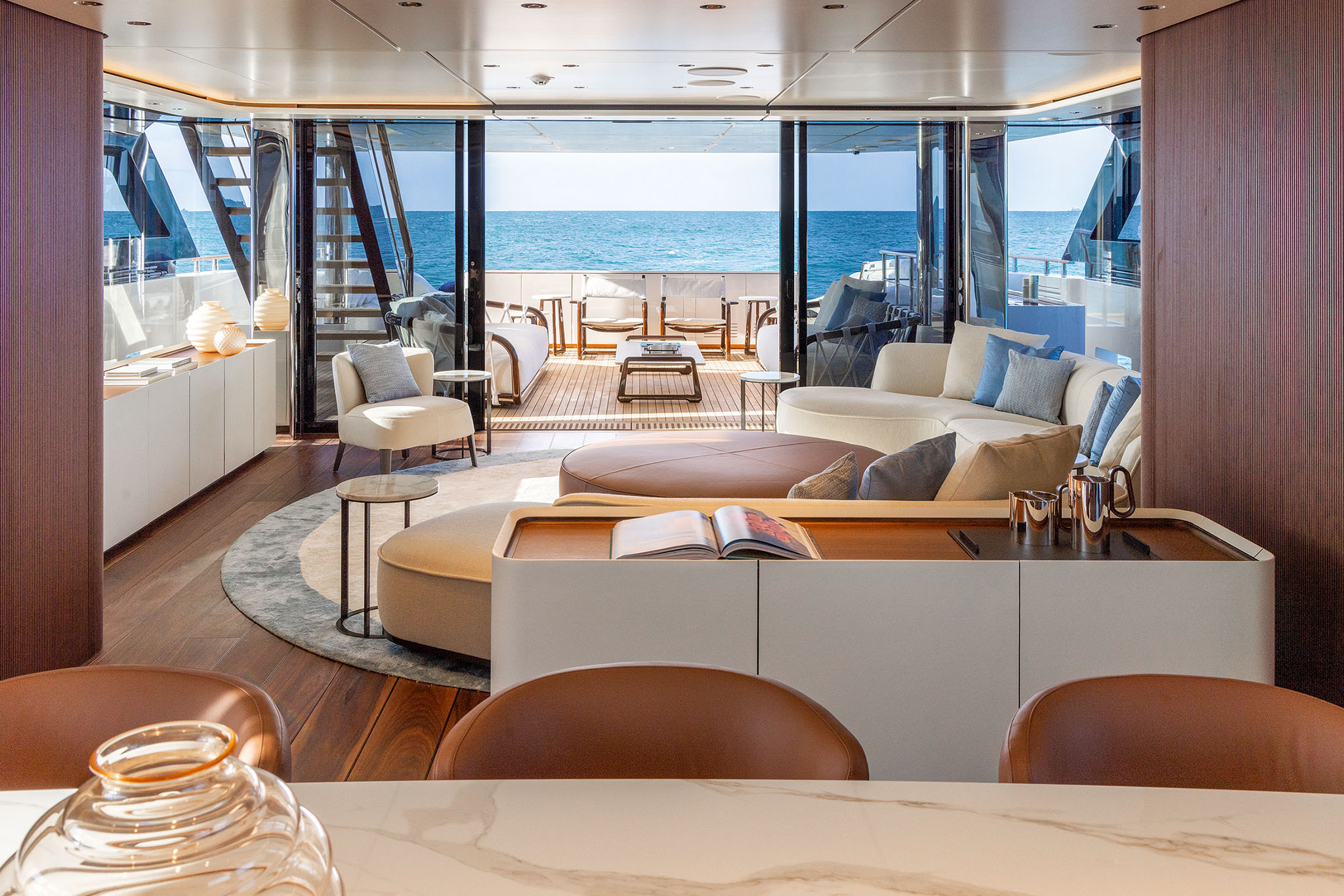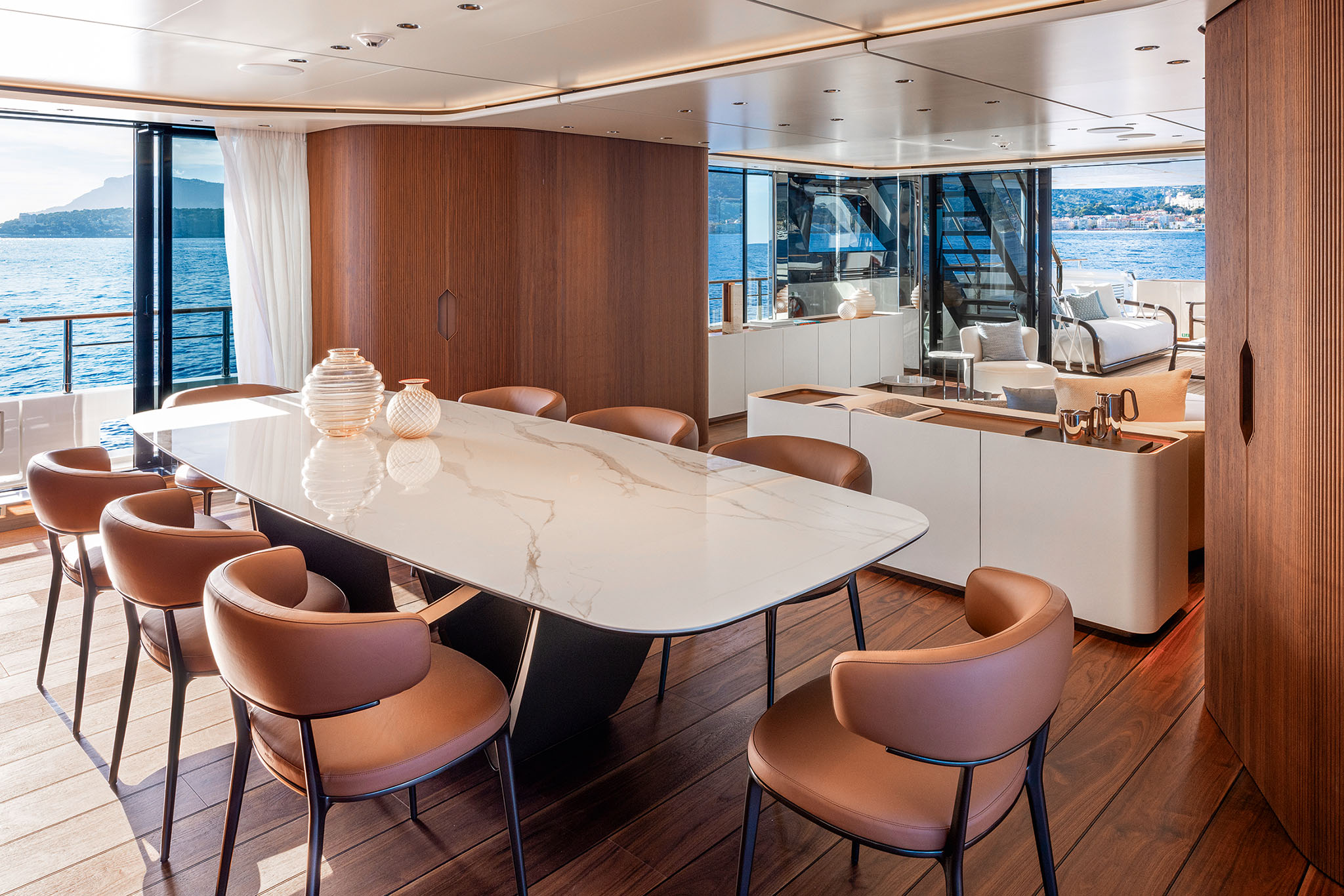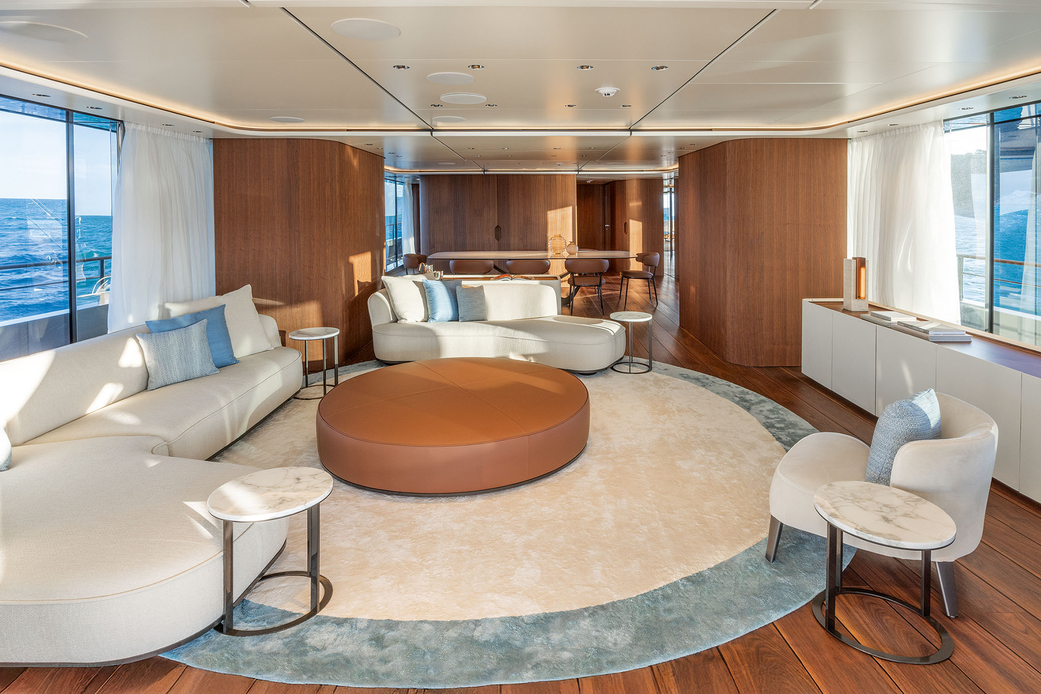 The interior spaces for this substantial upgrade has been created with a radical restyling. The main deck lounge can be configured with two different layouts: one has the dining area aft and the lounge midships, while the alternative layout is more traditional, with the lounge area and generous sofas in the entry area and the dining area in the centre. The large, elegant main salon, which covers over 50m² and has high ceilings, more than 2 metres throughout and over 2.25m at the highest point. High gloss rosewood is the featured wood, paired with black hammered leather elements and lacquered surfaces that reflect the light flooding in through the large side windows