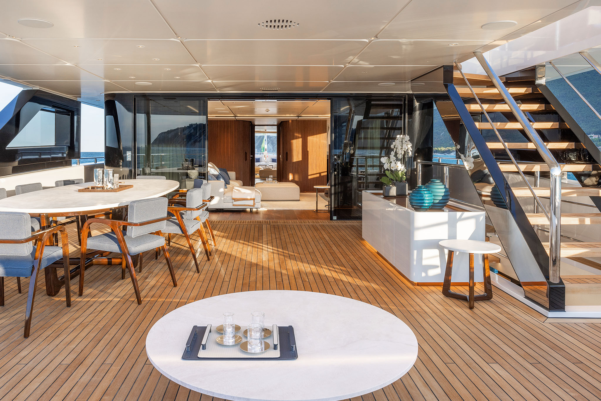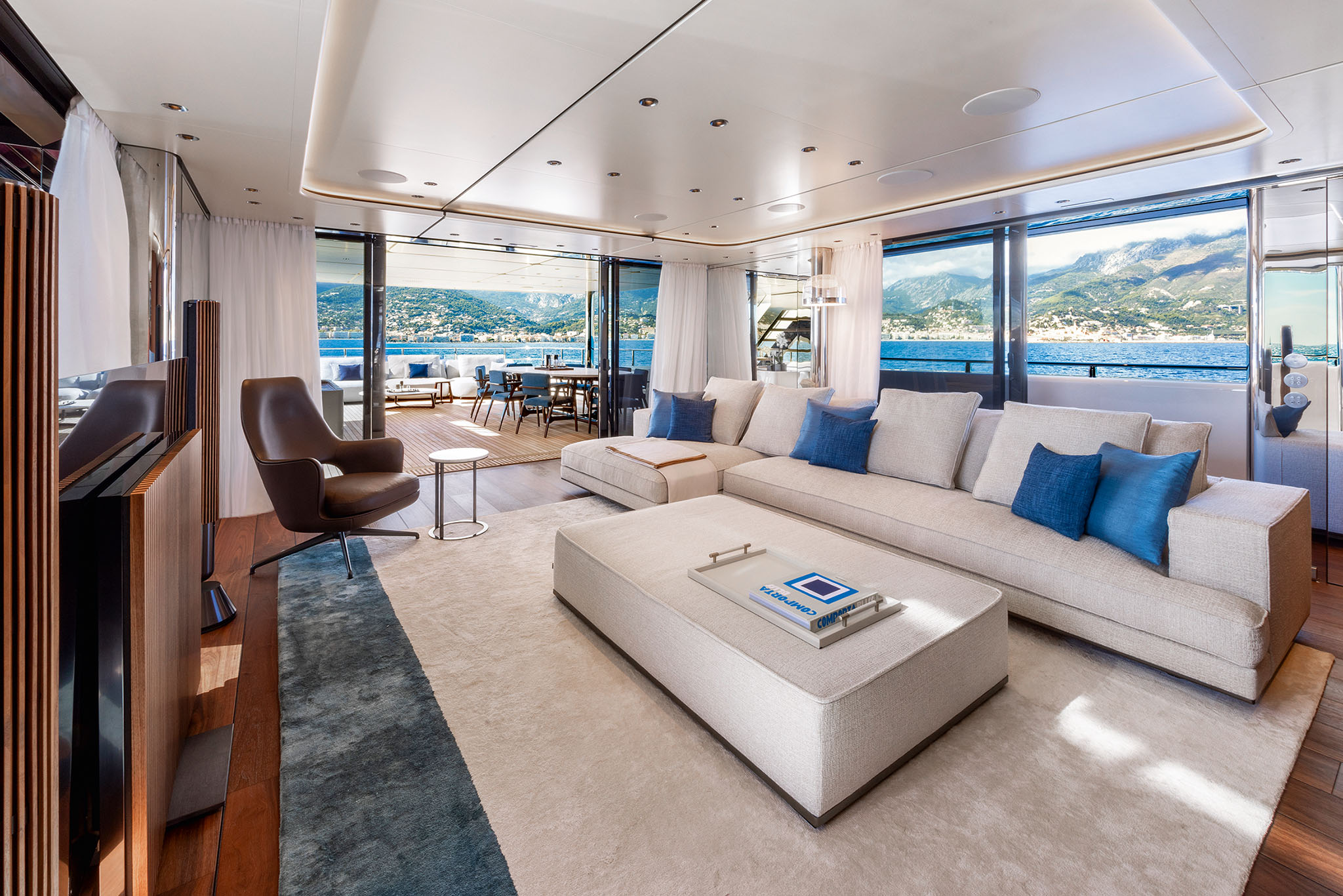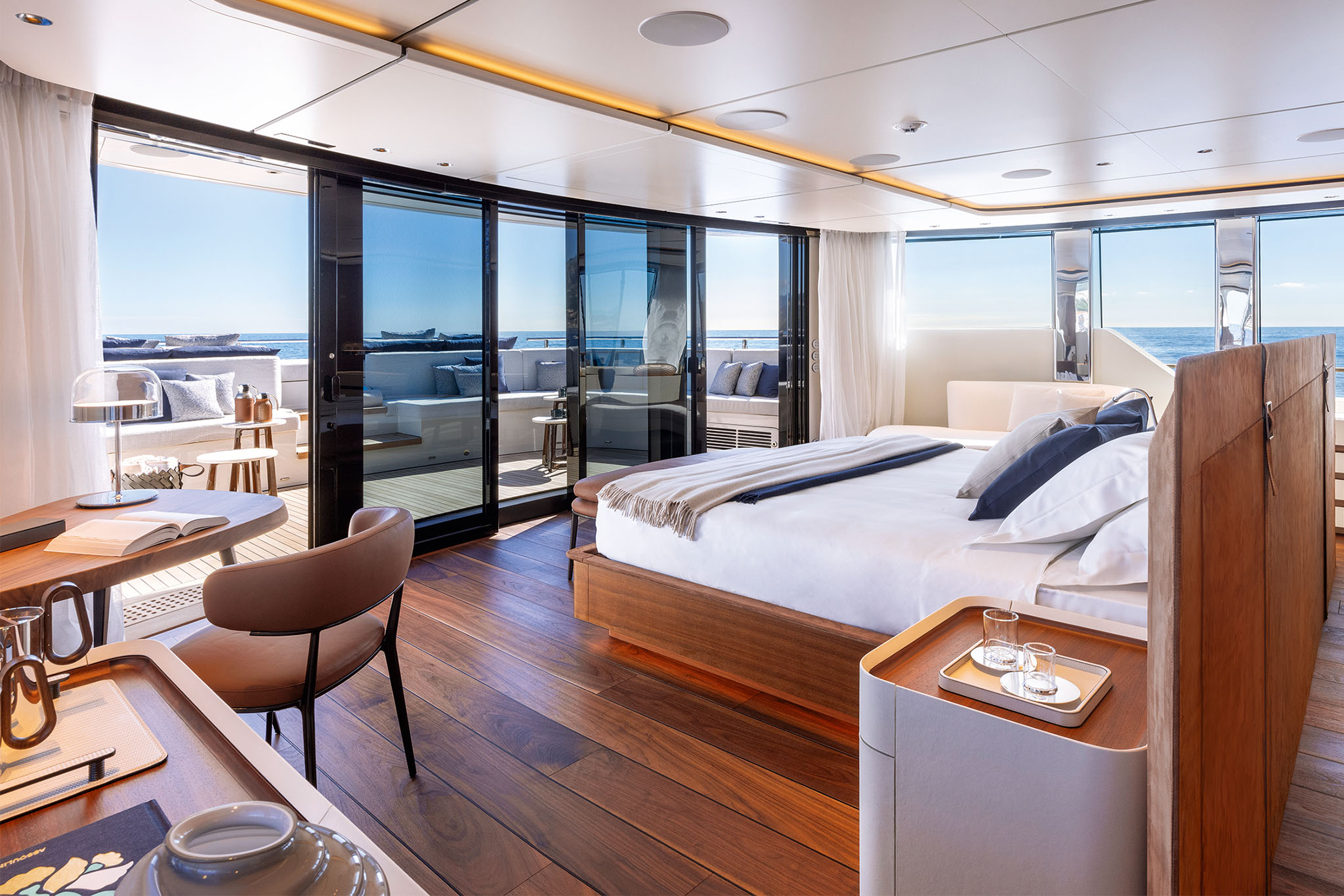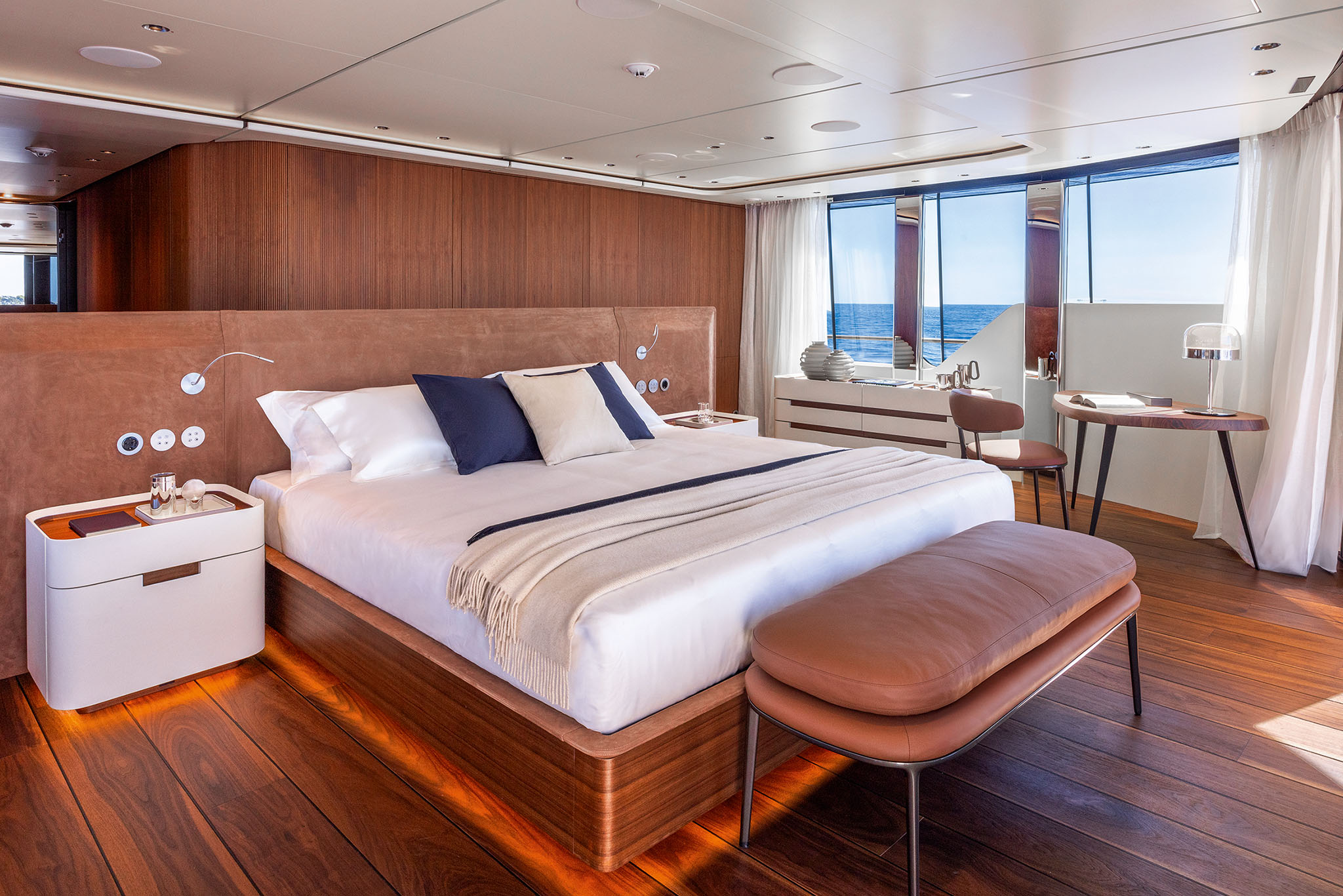 The interior spaces for this substantial upgrade has been created with a radical restyling. The main deck lounge can be configured with two different layouts: one has the dining area aft and the lounge midships, while the alternative layout is more traditional, with the lounge area and generous sofas in the entry area and the dining area in the centre. The large, elegant main salon, which covers over 50m² and has high ceilings, more than 2 metres throughout and over 2.25m at the highest point. High gloss rosewood is the featured wood, paired with black hammered leather elements and lacquered surfaces that reflect the light flooding in through the large side windows
