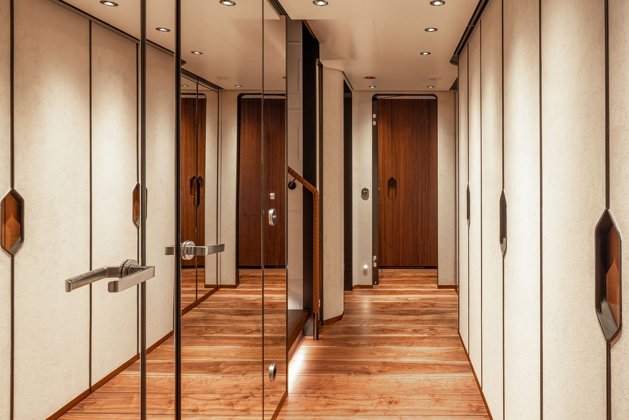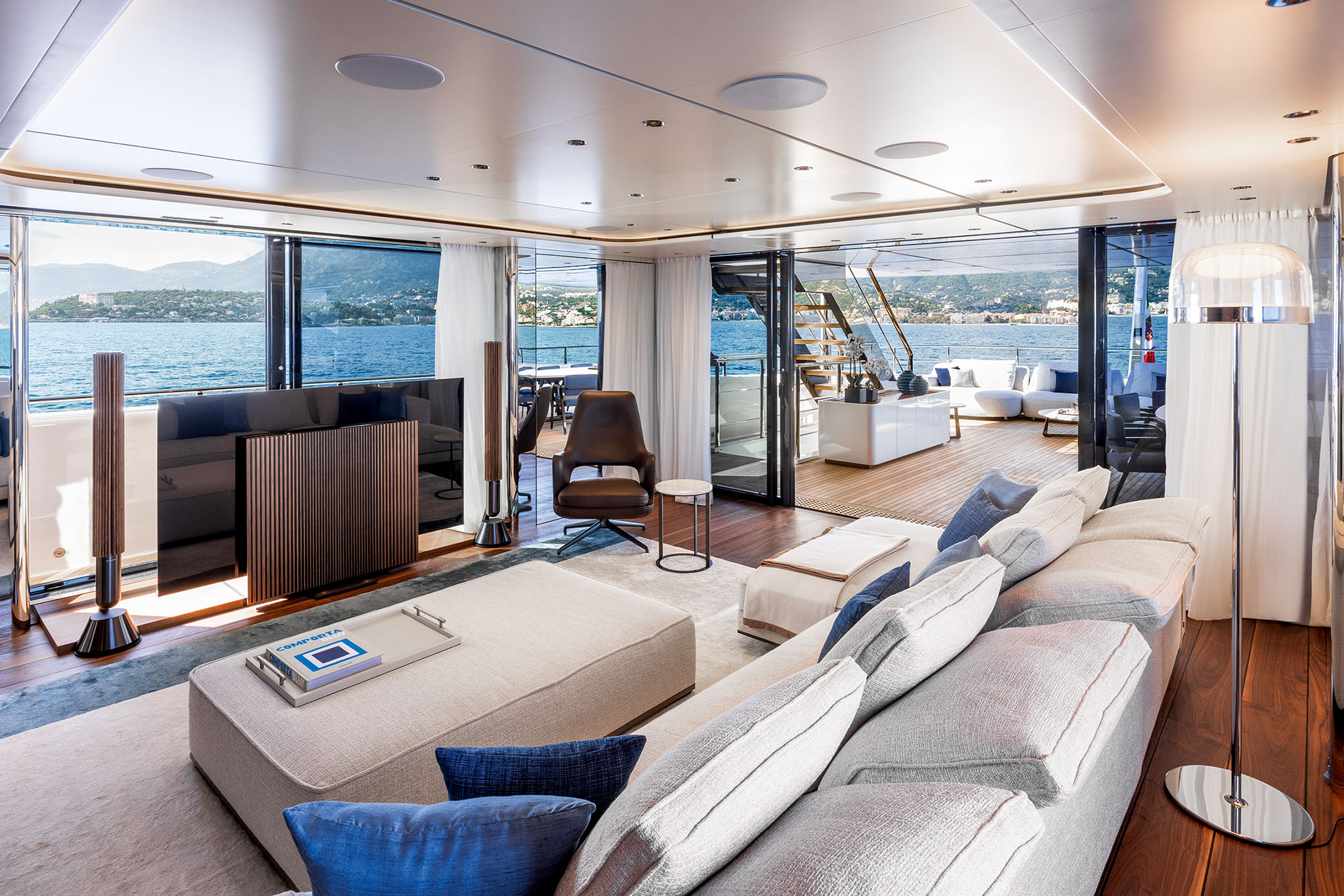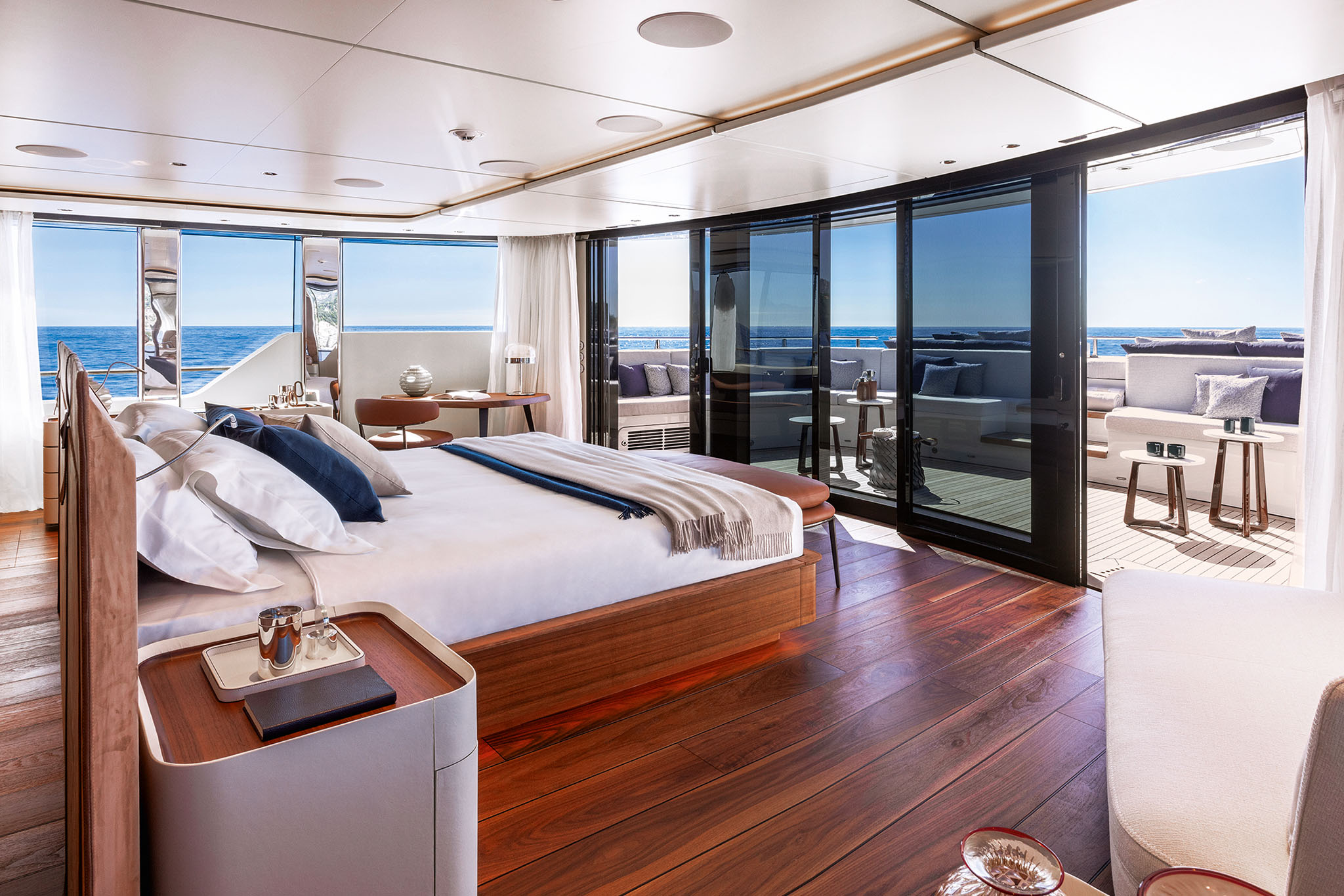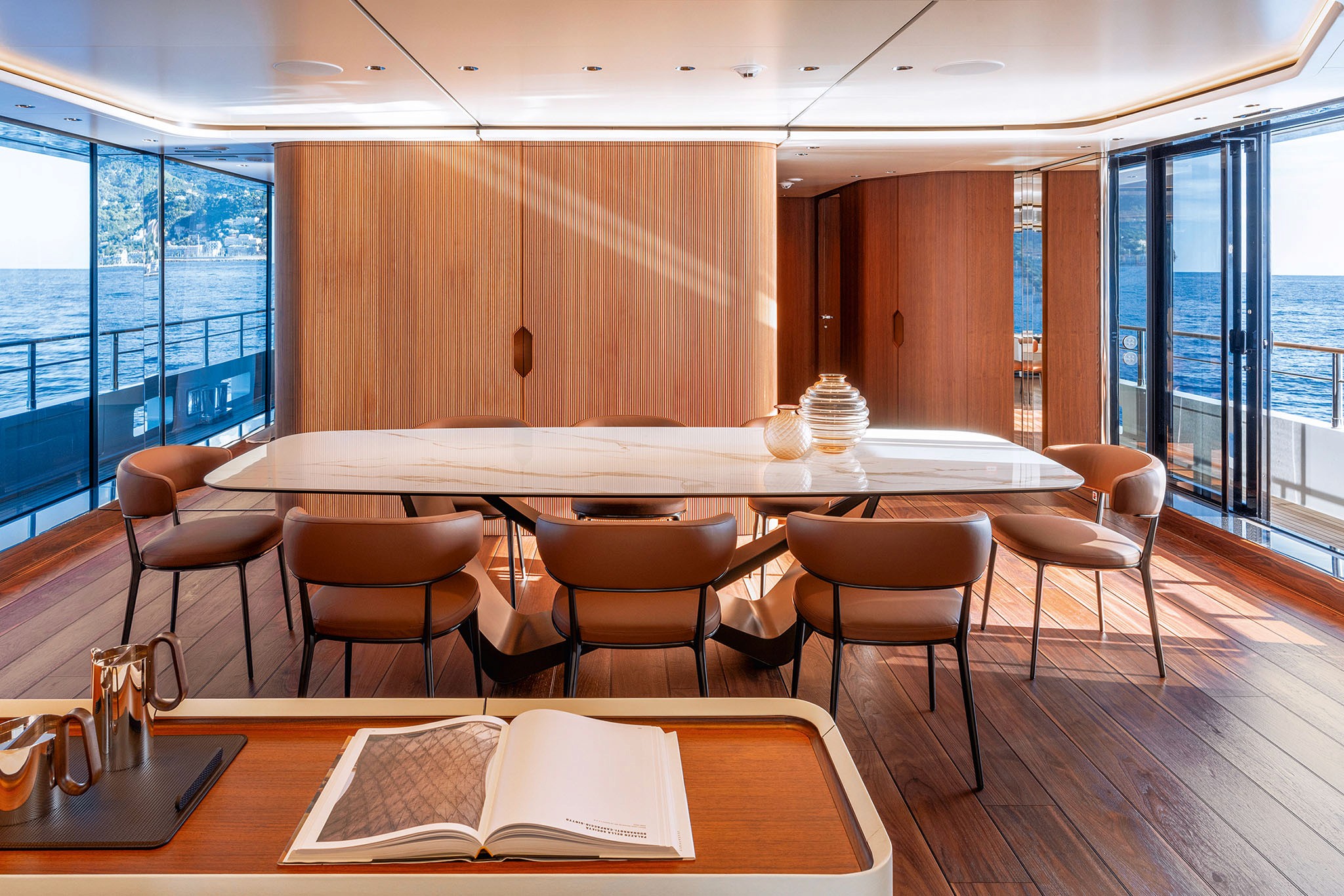 The interior spaces for this substantial upgrade has been created with a radical restyling. The main deck lounge can be configured with two different layouts: one has the dining area aft and the lounge midships, while the alternative layout is more traditional, with the lounge area and generous sofas in the entry area and the dining area in the centre. The large, elegant main salon, which covers over 50m² and has high ceilings, more than 2 metres throughout and over 2.25m at the highest point. High gloss rosewood is the featured wood, paired with black hammered leather elements and lacquered surfaces that reflect the light flooding in through the large side windows