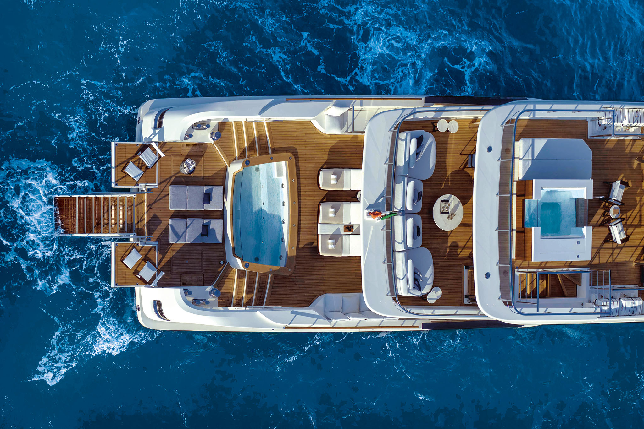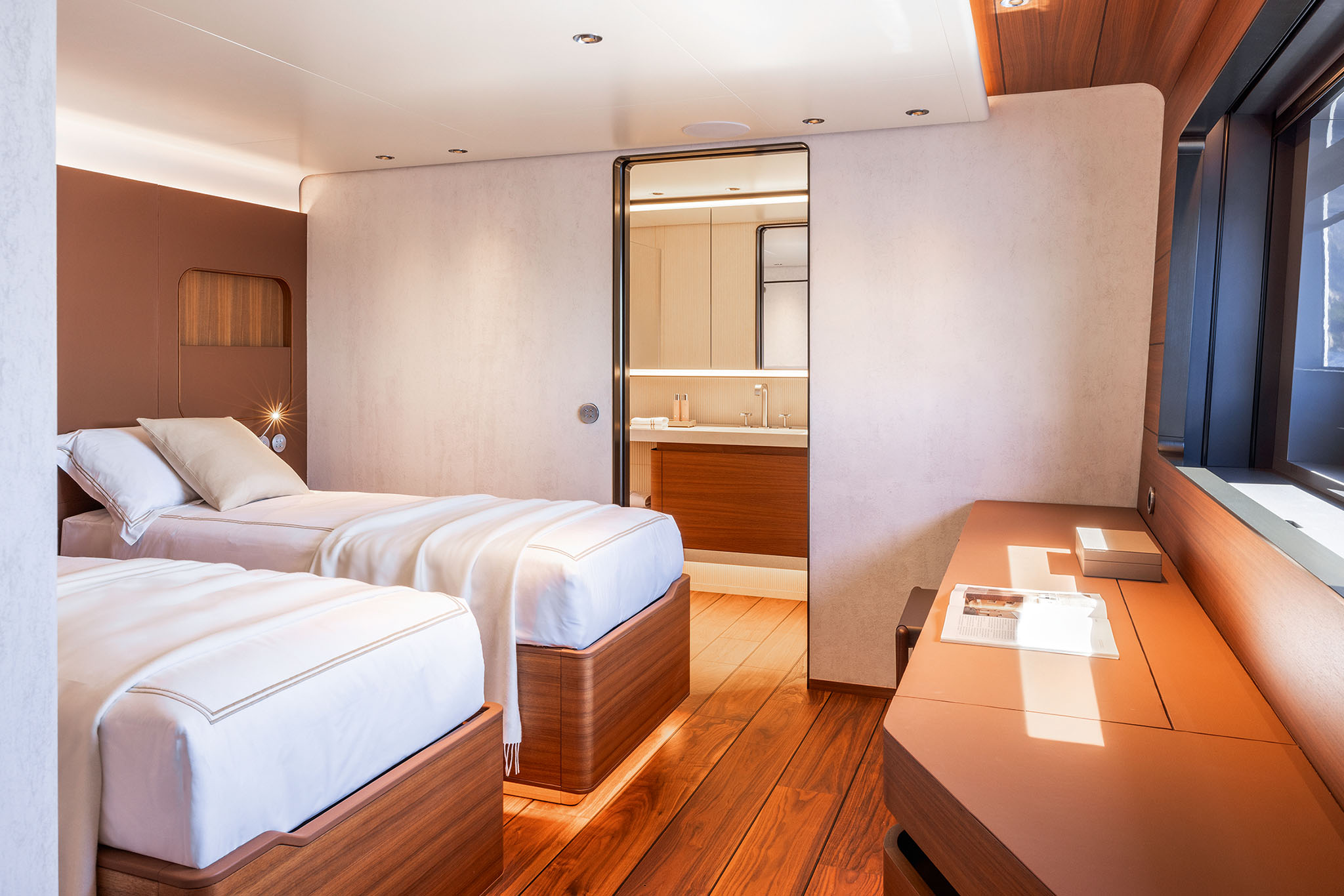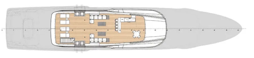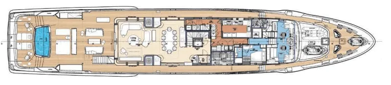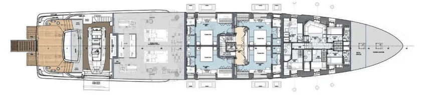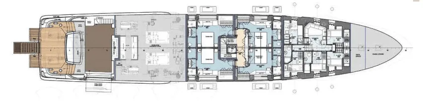 The master suite has been re-designed to include a new wardrobe in the entrance area and larger windows that let in natural light and add more to the panoramic view. Accommodation comprises a sumptuous five double cabin layout for ten plus three crew cabins for five crew. The lower deck is devoted entirely to guests and crew. The guest area has four cabins consisting of two mirror-image VIP cabins aft and two guest cabins forward, one of which fitted with separable and pullman beds. All the suites on the lower deck have an en-suite bathroom.