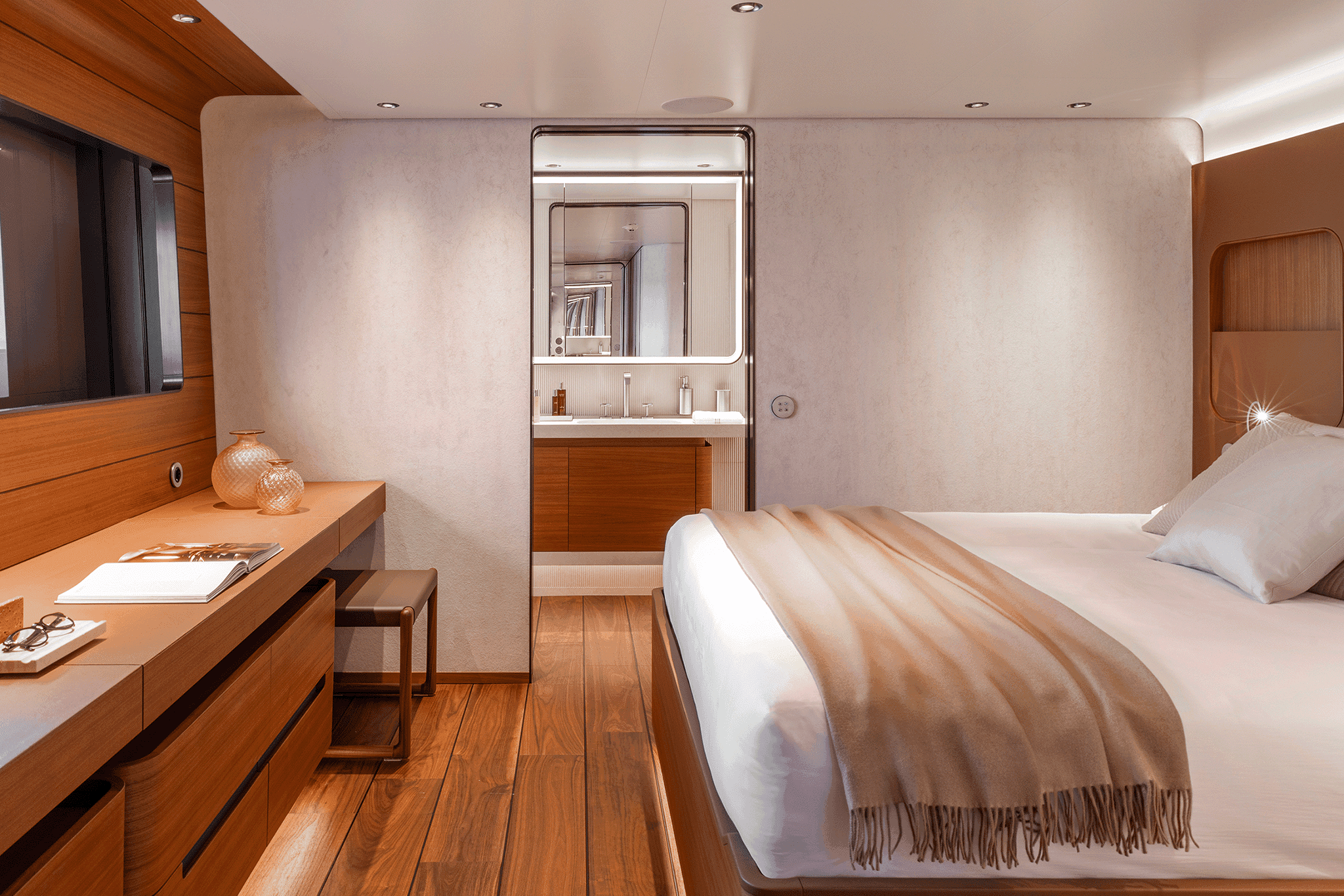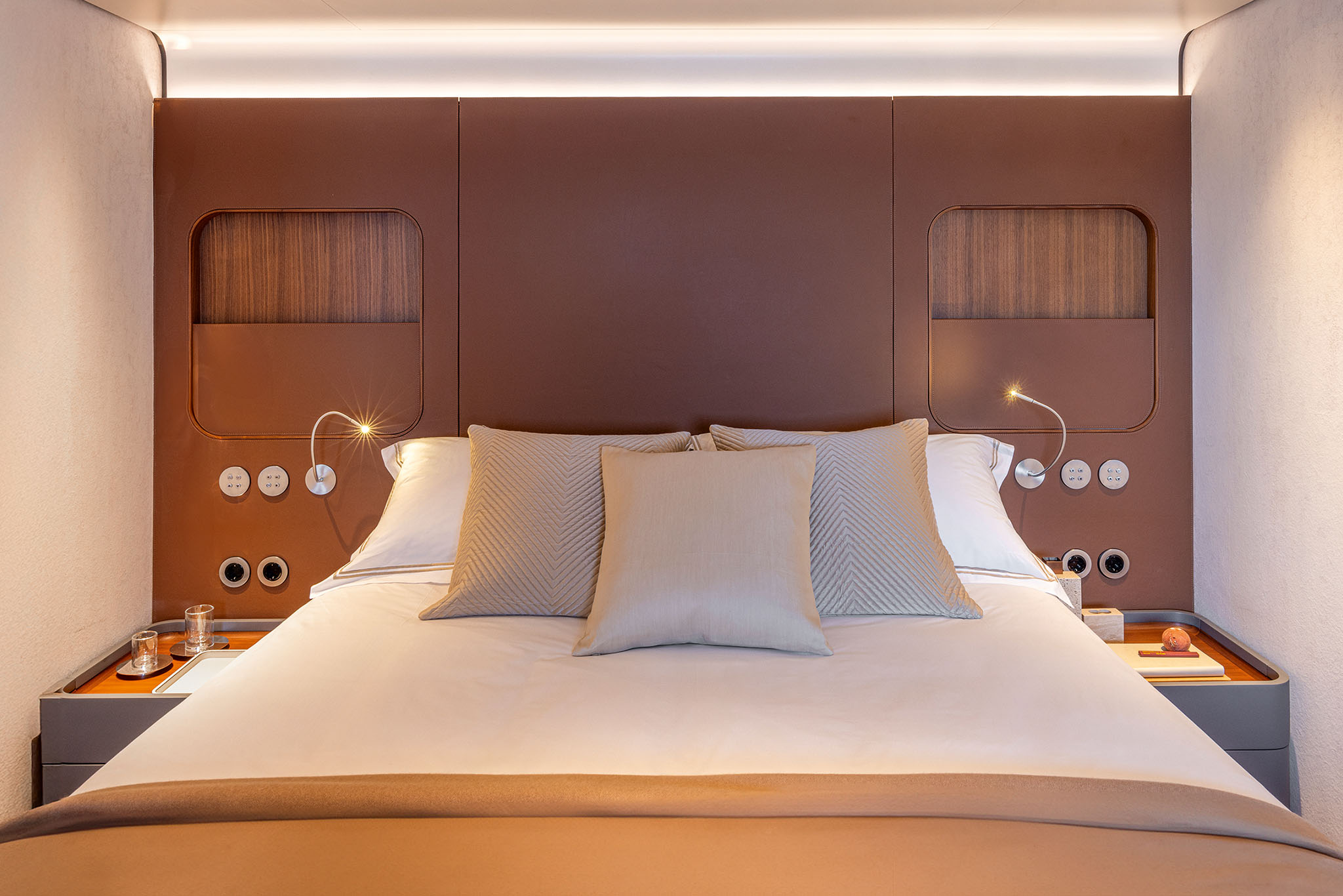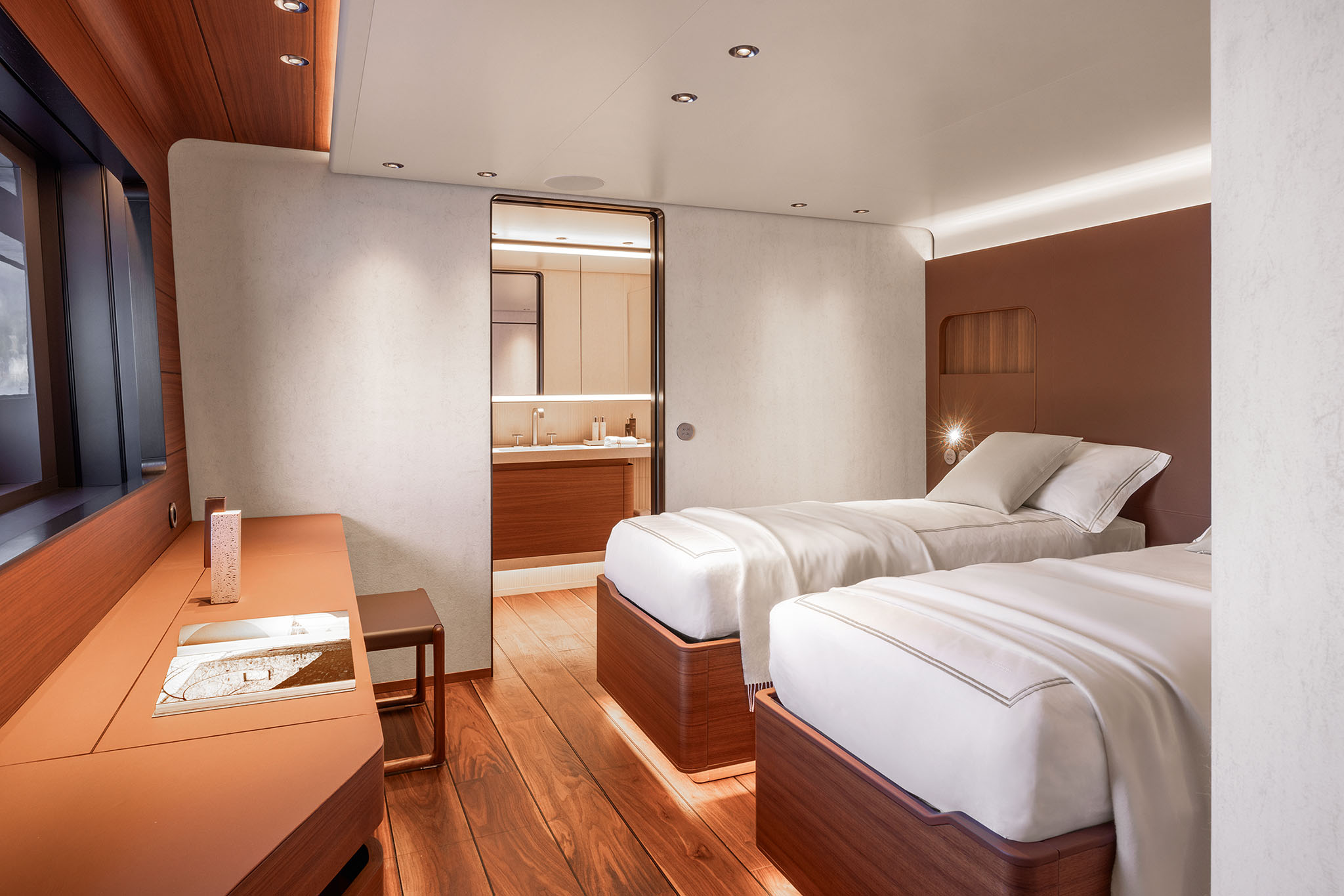 The master suite has been re-designed to include a new wardrobe in the entrance area and larger windows that let in natural light and add more to the panoramic view. Accommodation comprises a sumptuous five double cabin layout for ten plus three crew cabins for five crew. The lower deck is devoted entirely to guests and crew. The guest area has four cabins consisting of two mirror-image VIP cabins aft and two guest cabins forward, one of which fitted with separable and pullman beds. All the suites on the lower deck have an en-suite bathroom.