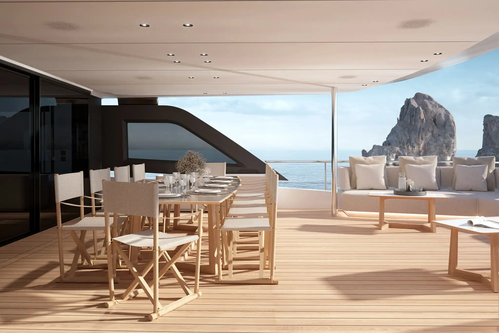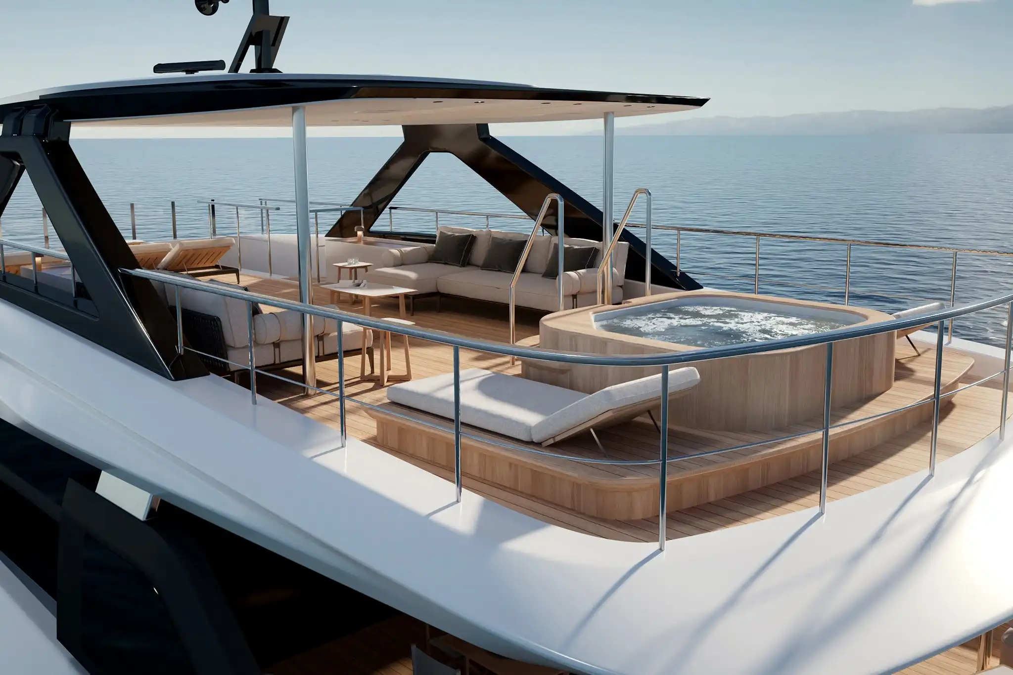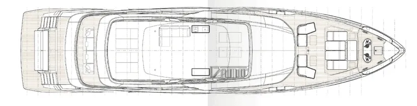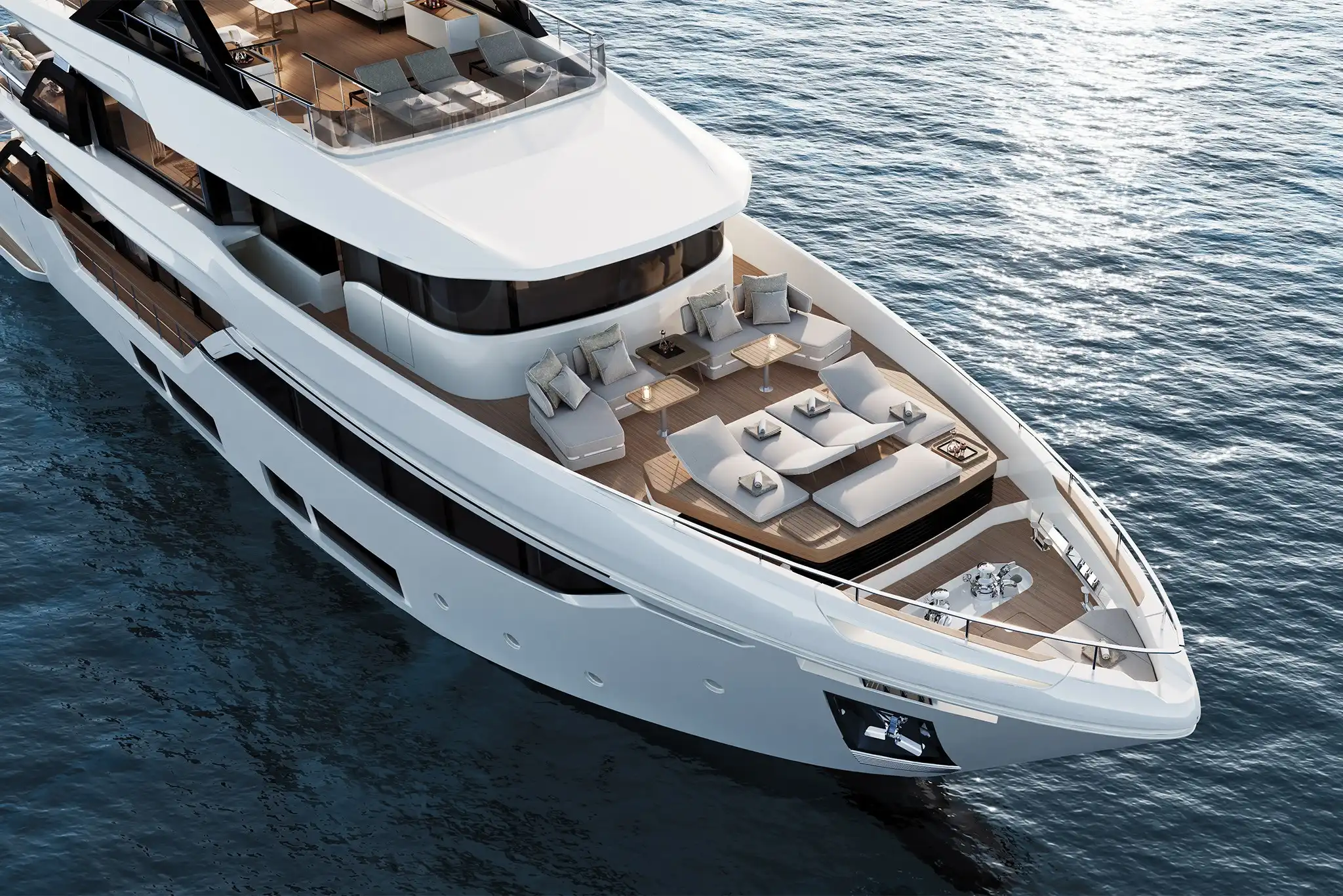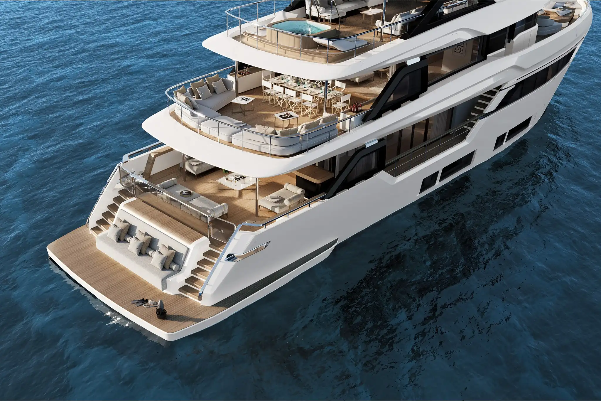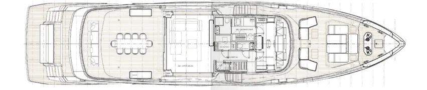The extra size of this model allows for more extended deck areas and tiered aft spaces that creates a closer connection between outdoor lounge areas and interior spaces, a clear nod to the demands of new market trends.