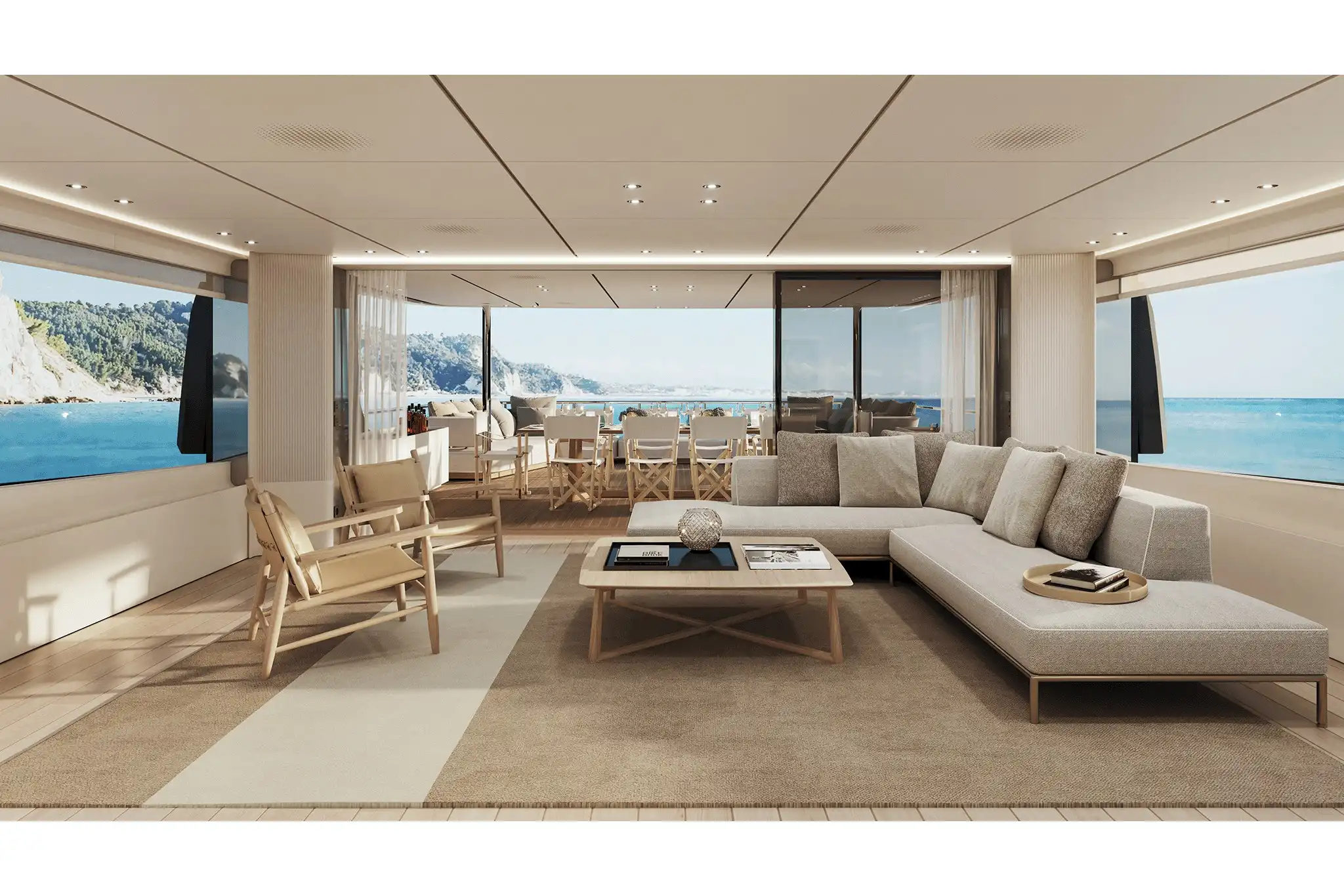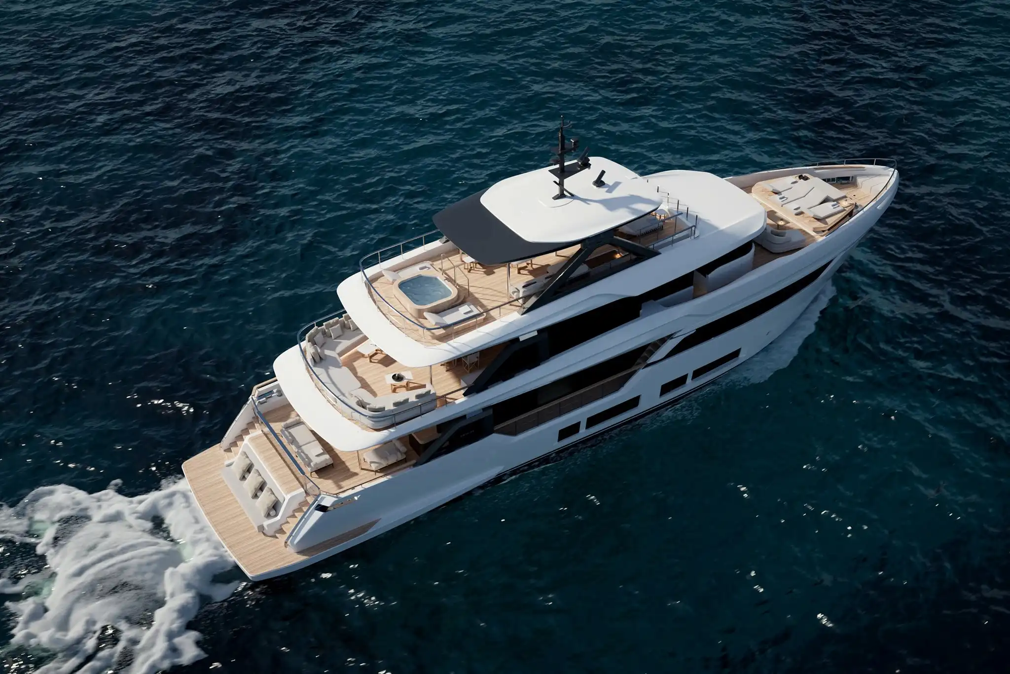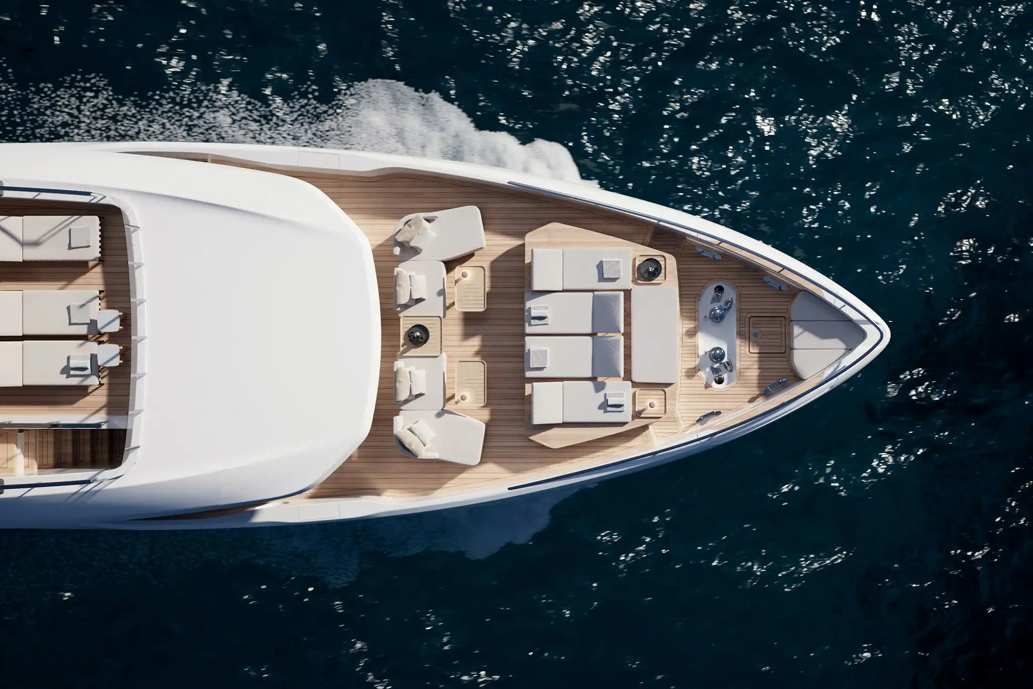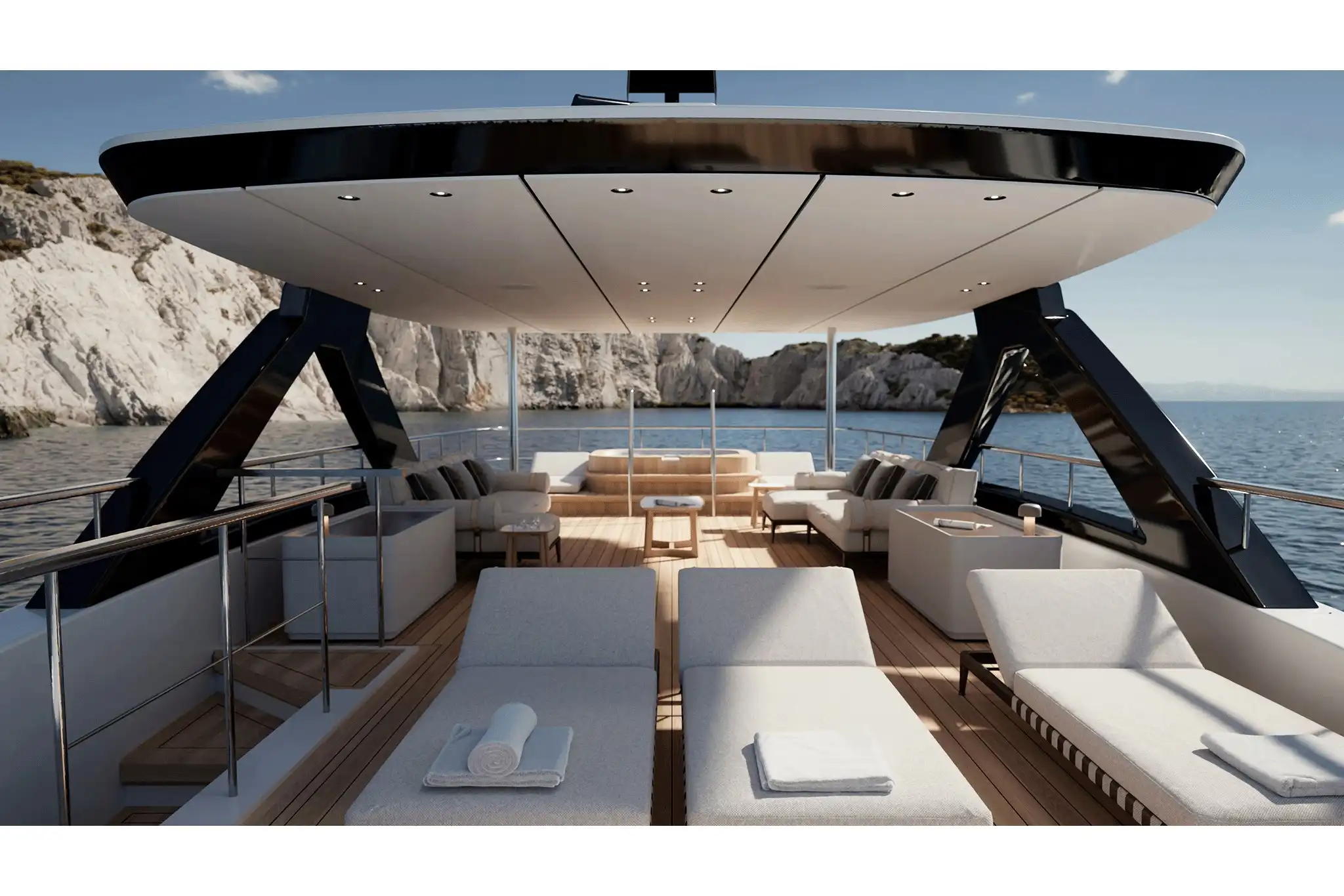 The extra size of this model allows for more extended deck areas and tiered aft spaces that creates a closer connection between outdoor lounge areas and interior spaces, a clear nod to the demands of new market trends.
