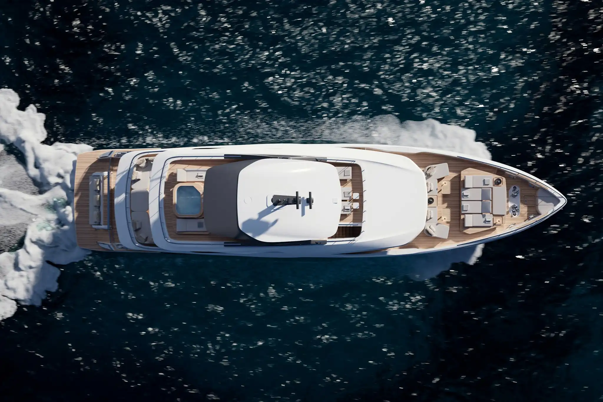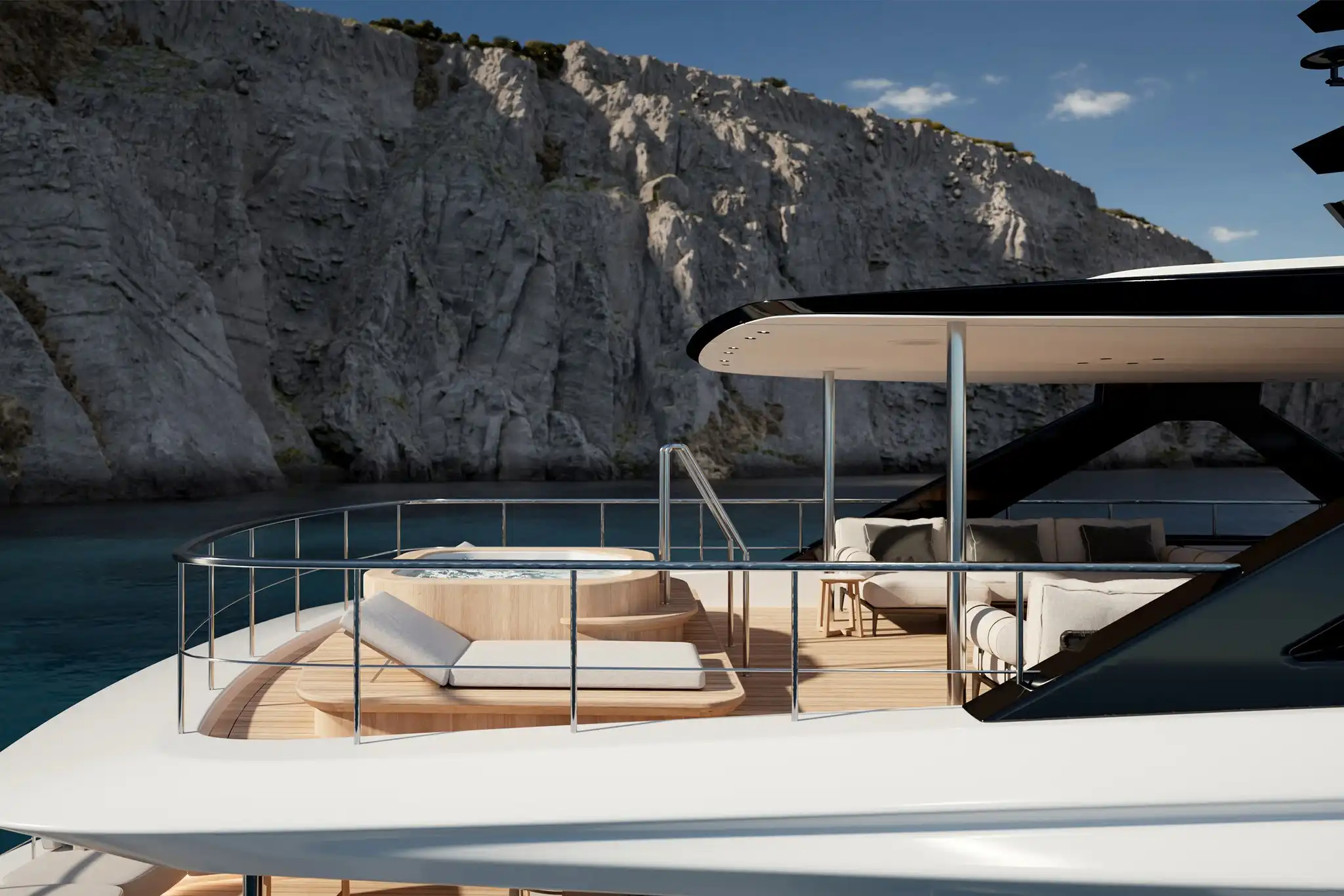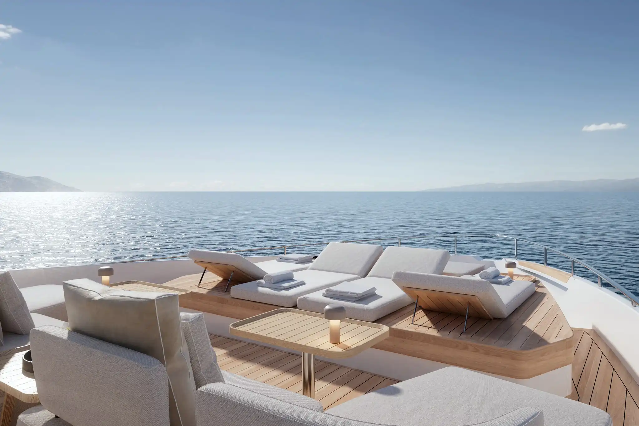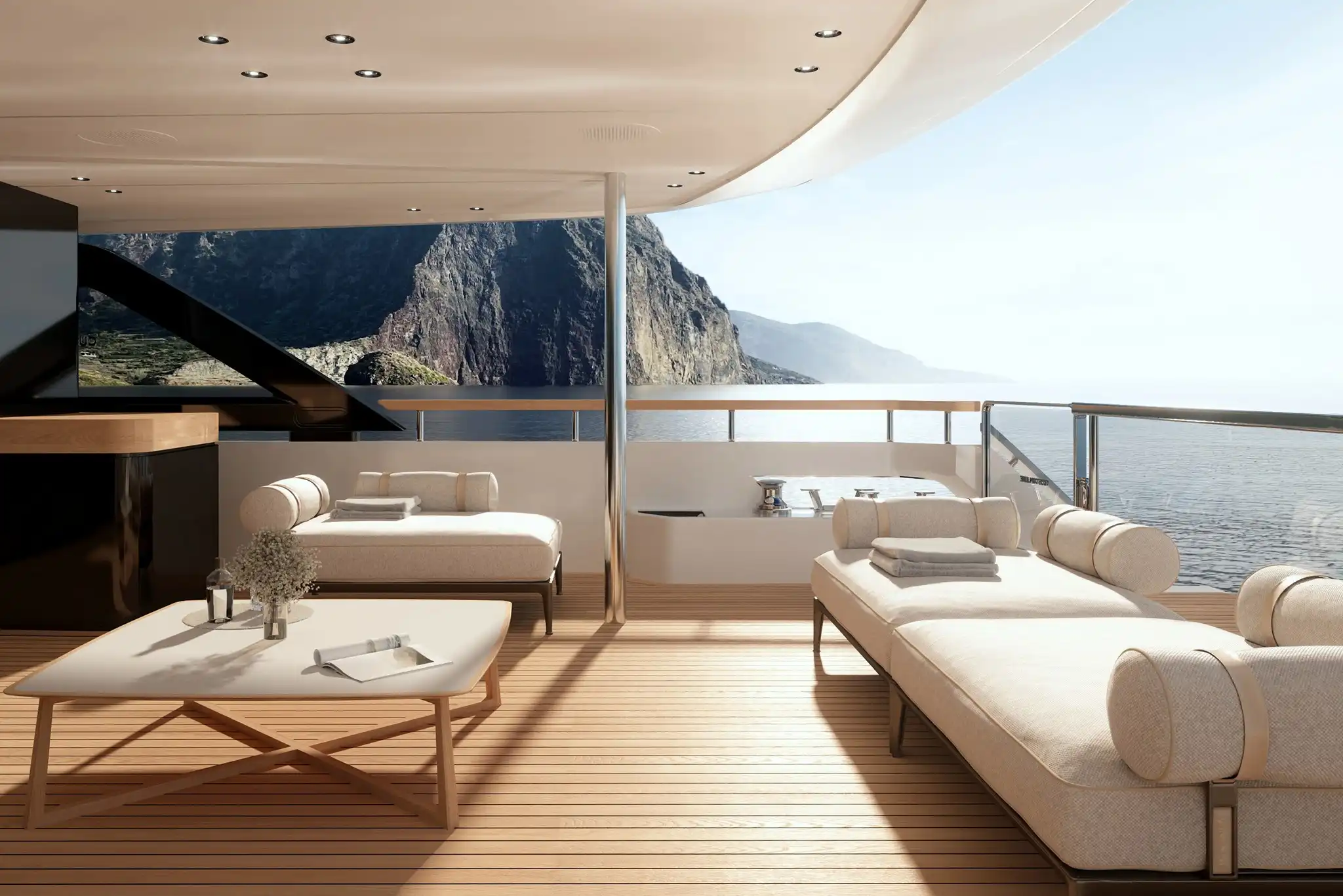 The extra size of this model allows for more extended deck areas and tiered aft spaces that creates a closer connection between outdoor lounge areas and interior spaces, a clear nod to the demands of new market trends.