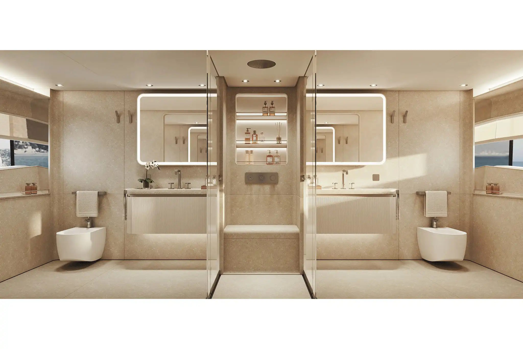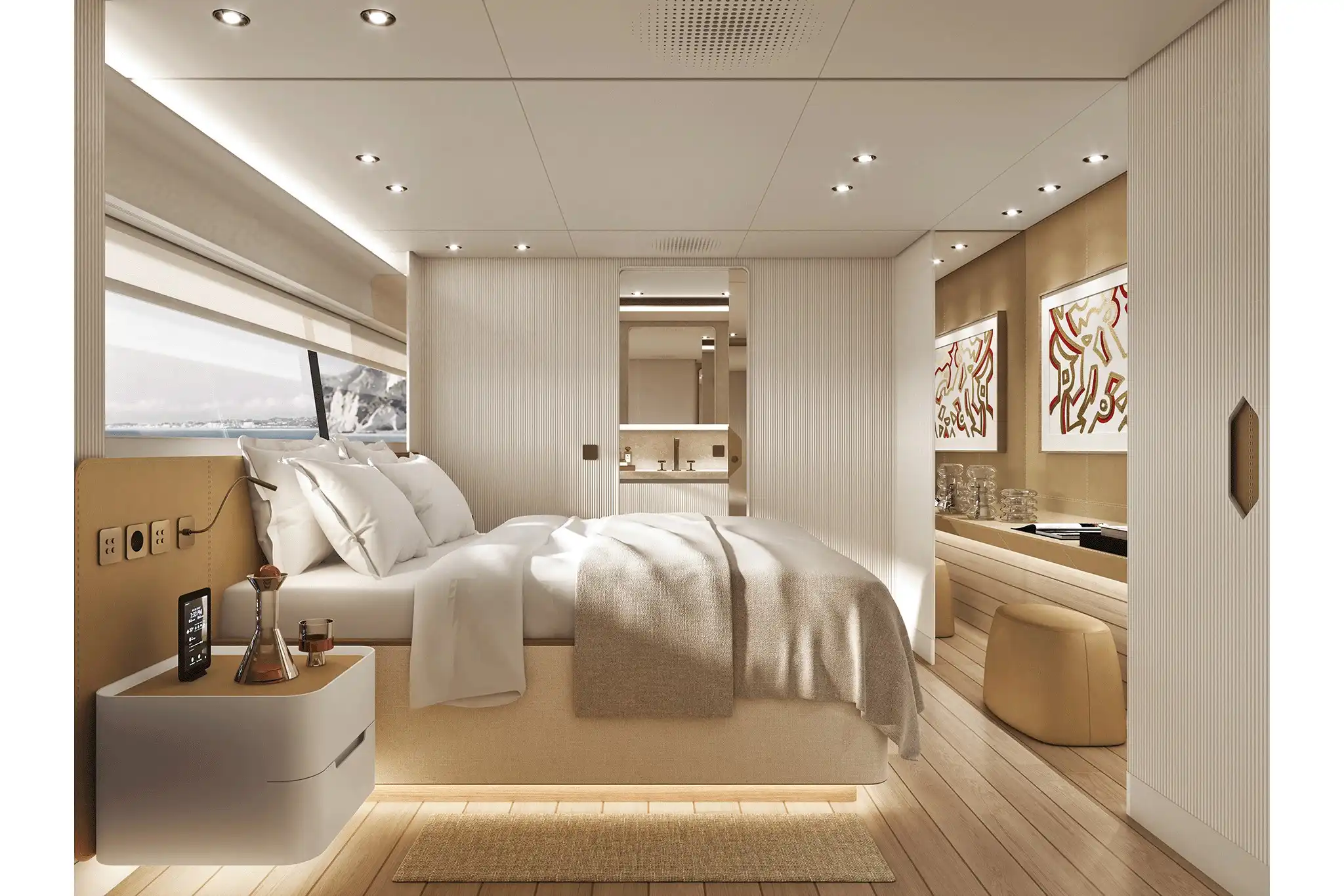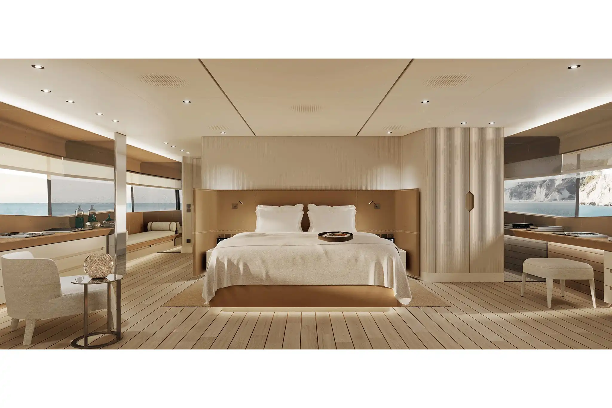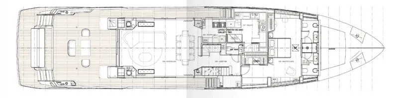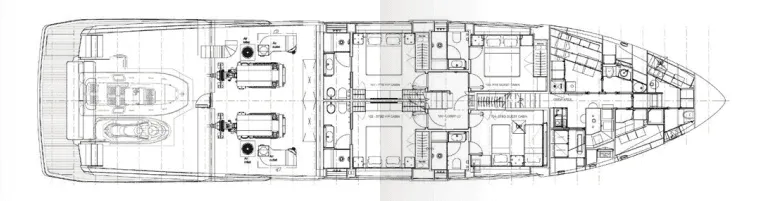 The master suite has been re-designed to include a new wardrobe in the entrance area and larger windows that let in natural light and add more to the panoramic view. Accommodation comprises a sumptuous five double cabin layout for ten plus three crew cabins for five crew. The lower deck is devoted entirely to guests and crew. The guest area has four cabins consisting of two mirror-image VIP cabins aft and two guest cabins forward, one of which fitted with separable and pullman beds. All the suites on the lower deck have an en-suite bathroom.