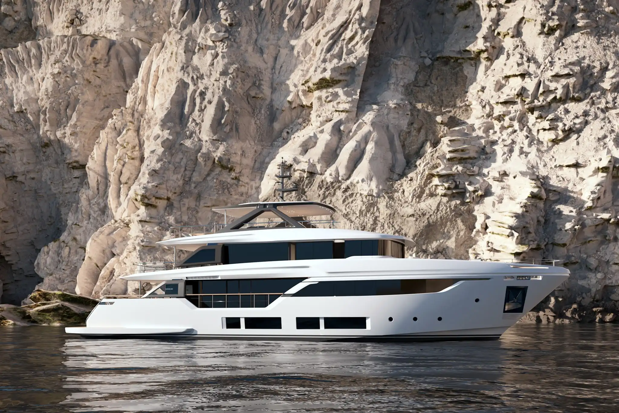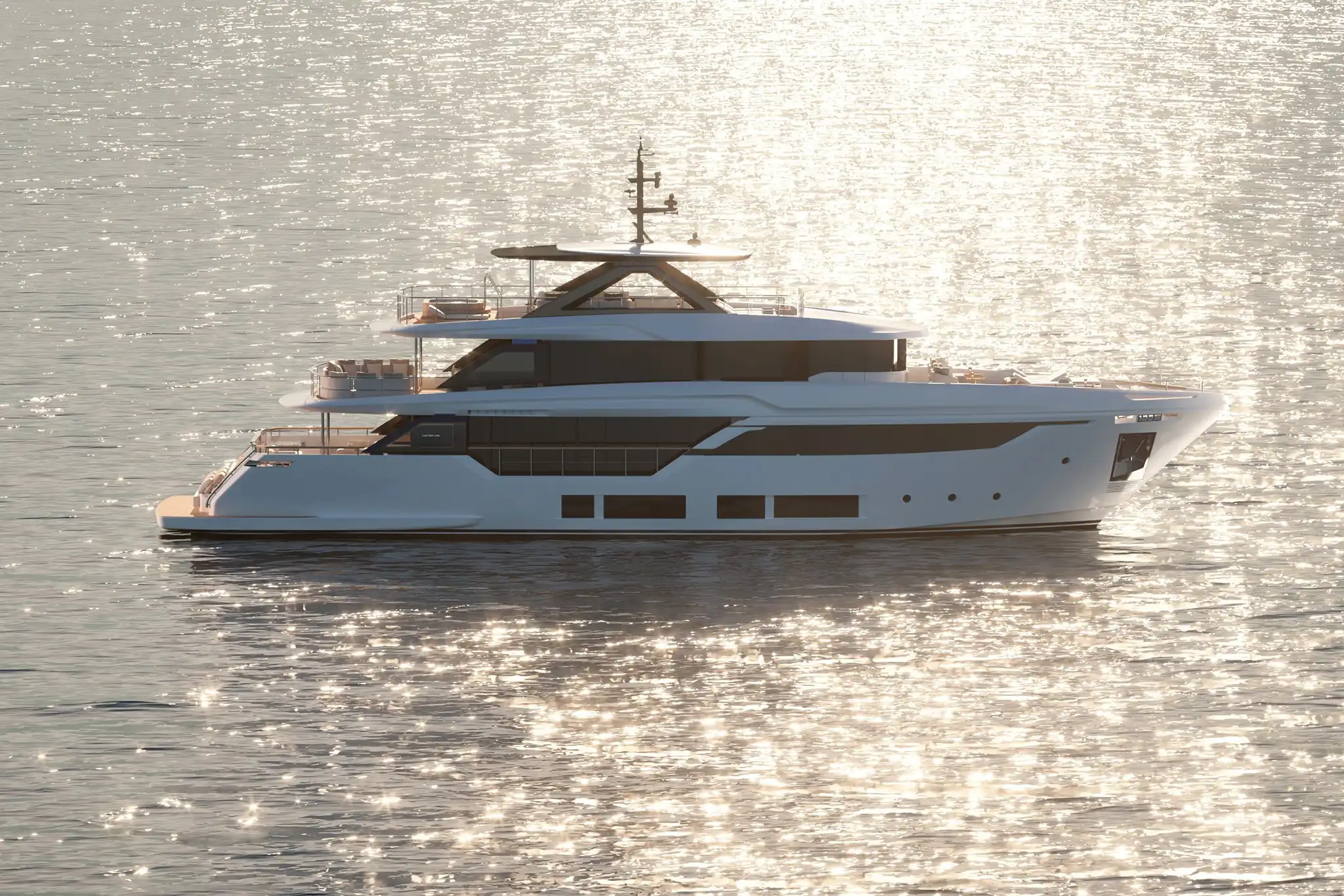 The highly acclaimed Custom Line Navetta 33 has graced our oceans since its debut in 2017, but at the Ferretti Group office, they listen to our customers’ input. When the market is just ready, the Ferretti Group are always perfectly placed to incorporate all the new design and technical features that they have carefully noted from their clients. Welcome to the new Custom Line Navetta 35, the project proudly debuted at the 2025 Monaco Yacht Show. It carries forward the spirit of its predecessor, adding more volume and contemporary detailing. The new upgraded 35 (34.5m and a 7.7m beam) is a modern, updated interpretation of the elegant 33. Her performance is on the button too with a 15-knot top speed and a perfect 12-knot cruise.