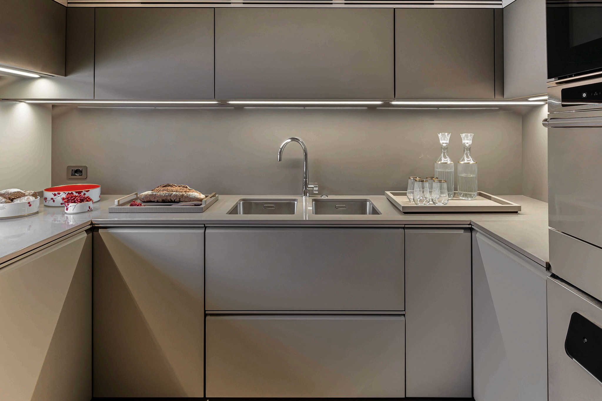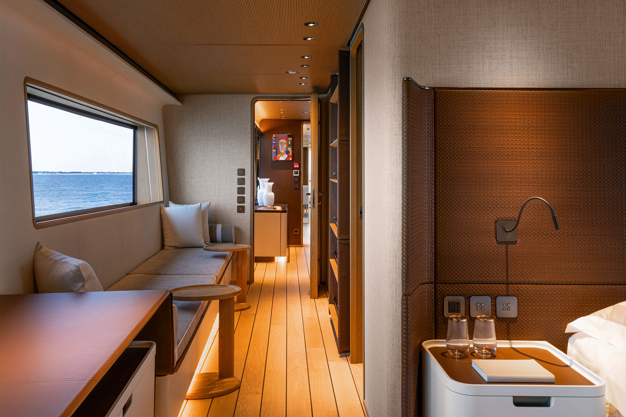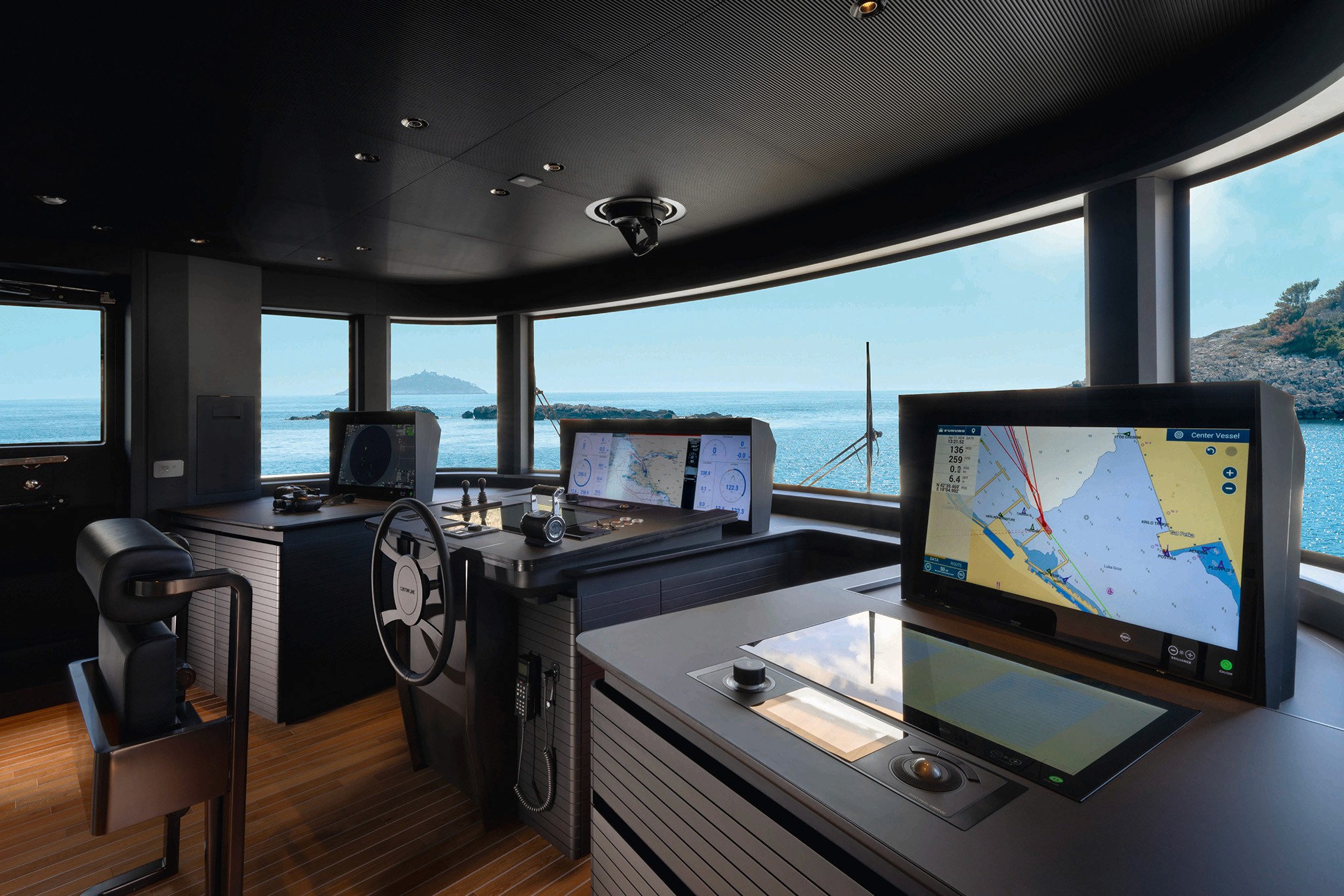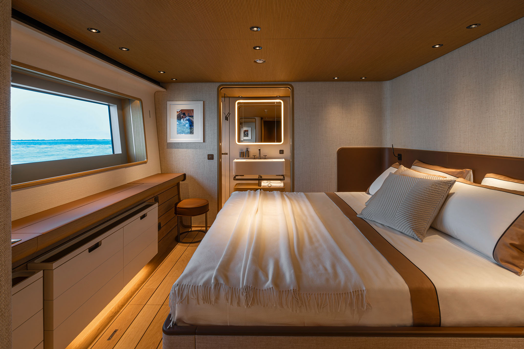 The master suite has been re-designed to include a new wardrobe in the entrance area and larger windows that let in natural light and add more to the panoramic view. Accommodation comprises a sumptuous five double cabin layout for ten plus three crew cabins for five crew. The lower deck is devoted entirely to guests and crew. The guest area has four cabins consisting of two mirror-image VIP cabins aft and two guest cabins forward, one of which fitted with separable and pullman beds. All the suites on the lower deck have an en-suite bathroom.