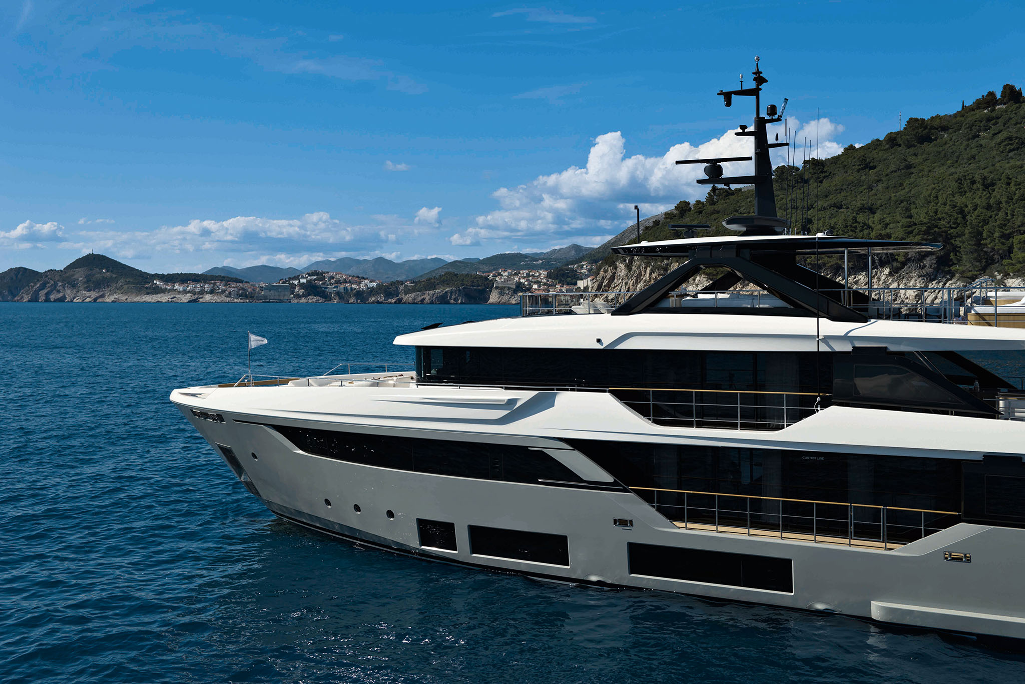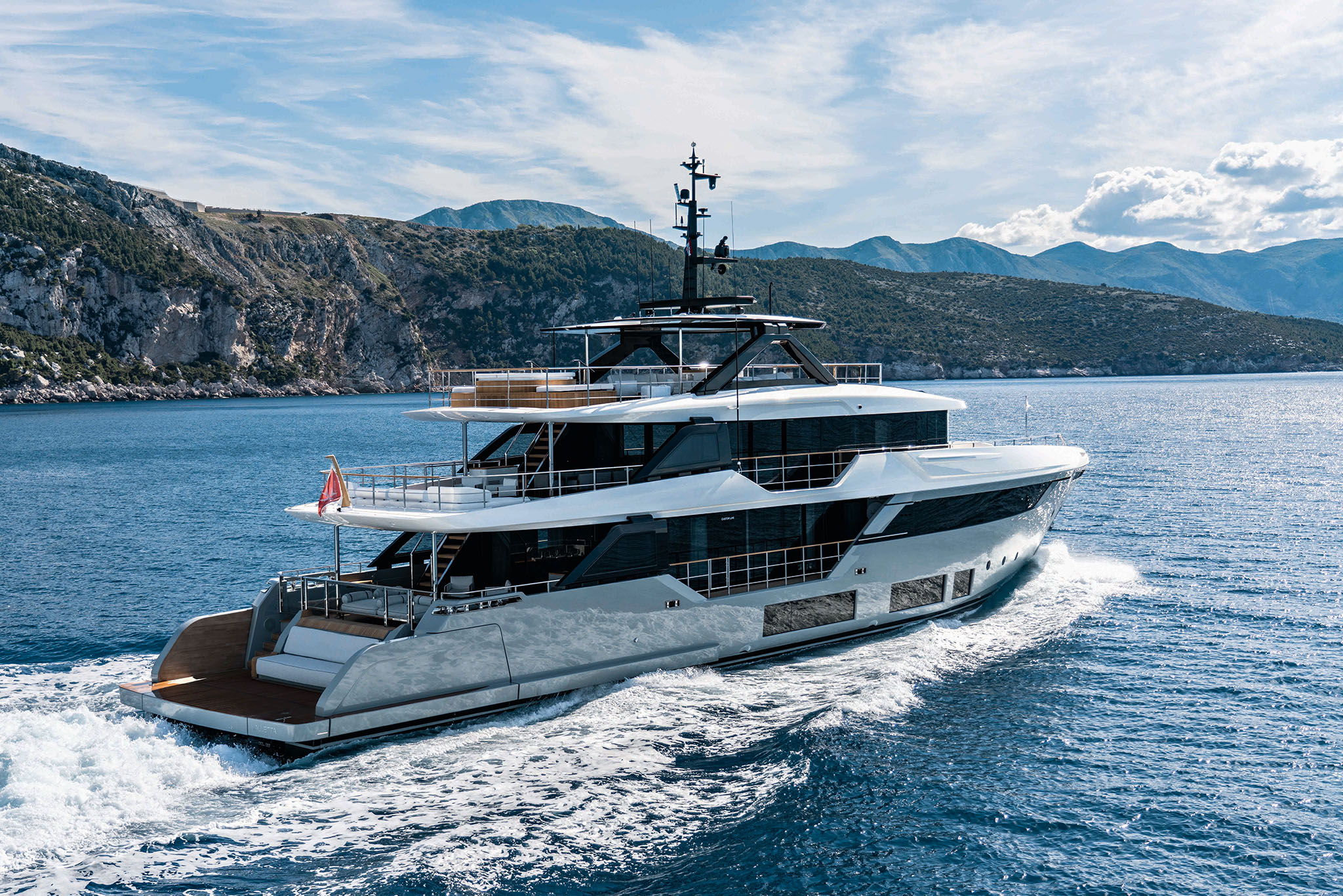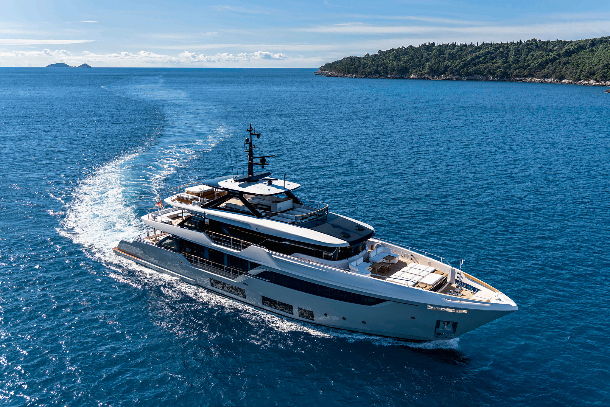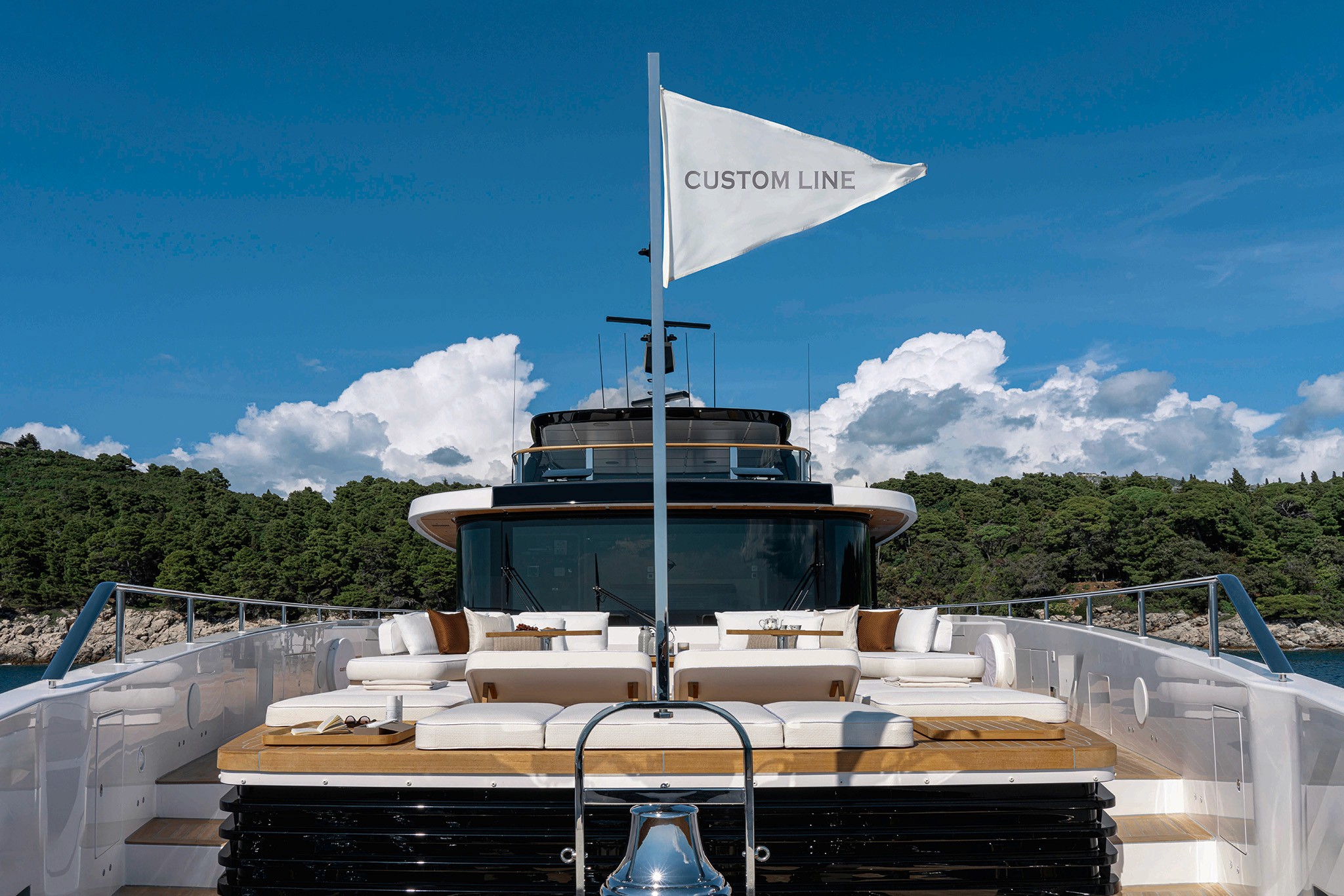 Boasting Custom Line's innovative hi-tech hull design, the Navetta 38 ensures long-distance cruising with minimal fuel consumption and exceptional performance. Twin 1,400 hp MAN units propel the yacht to a top speed of 15 knots, covering a range of 2,800 nautical miles at an economical cruising speed of 10 knots (preliminary data).