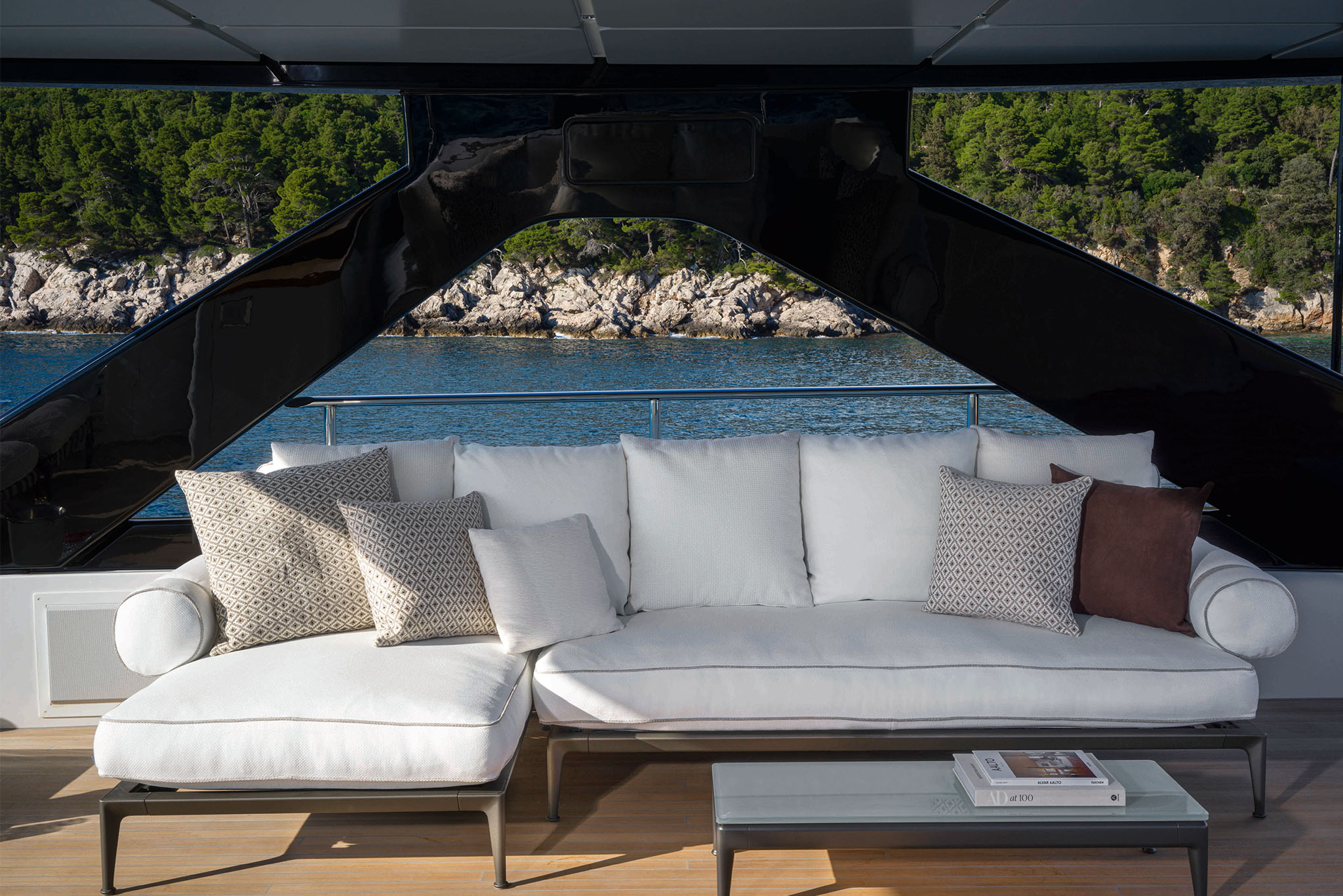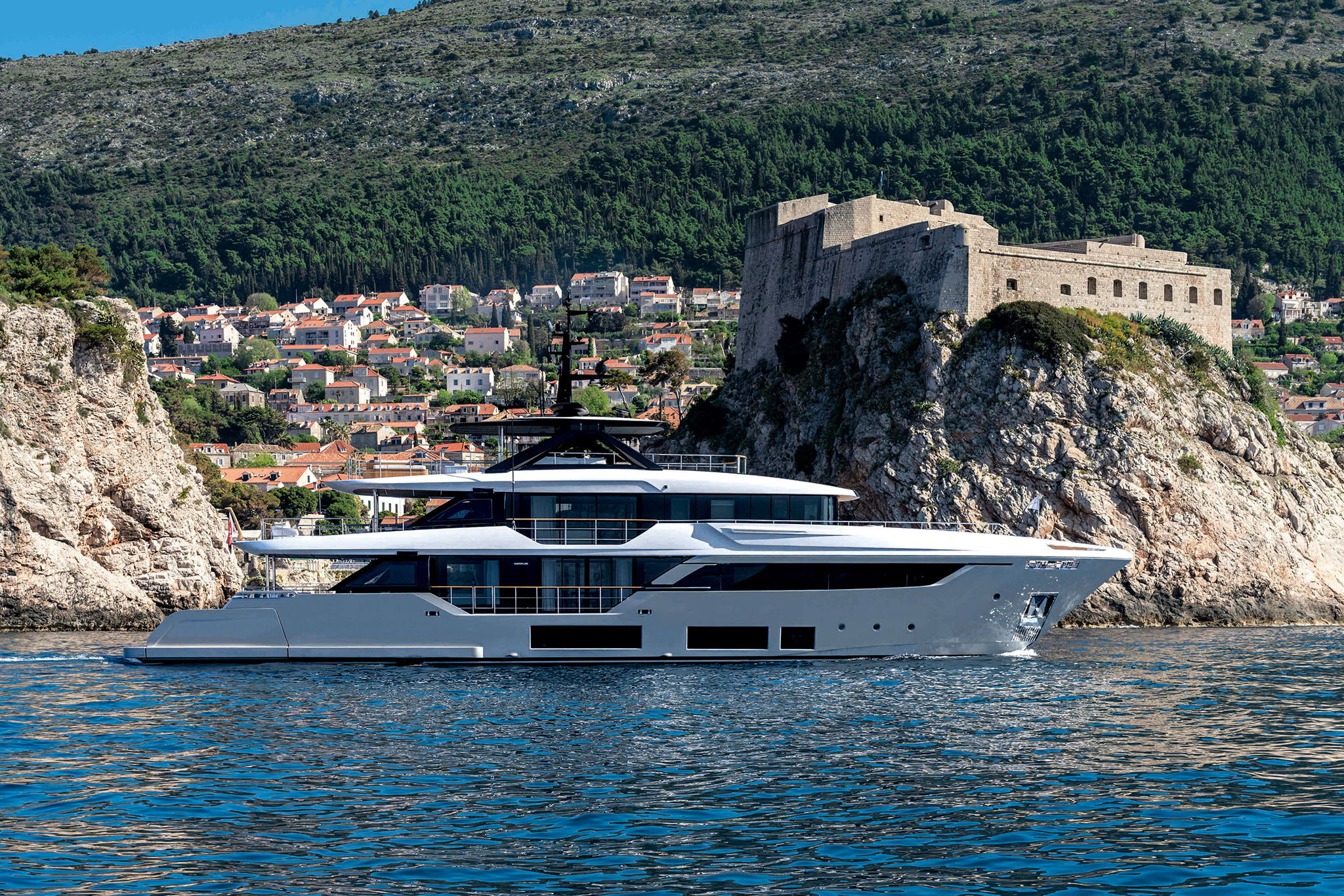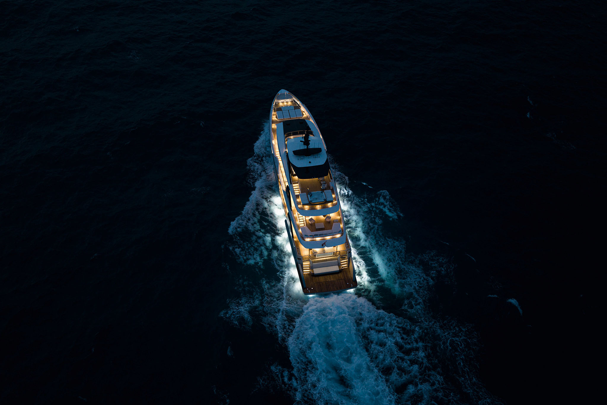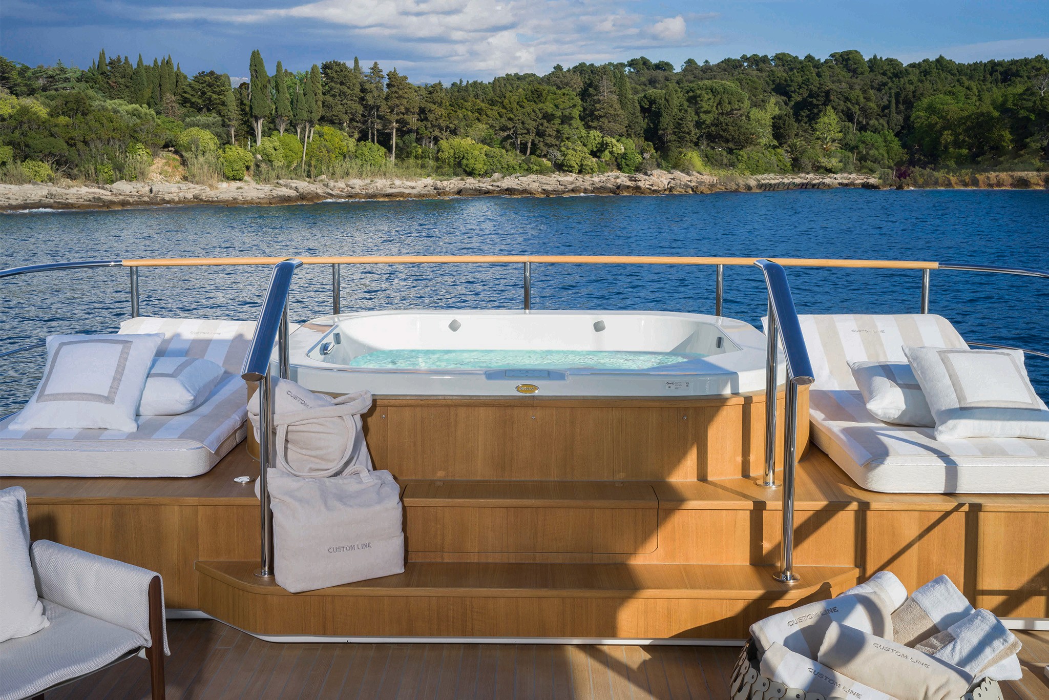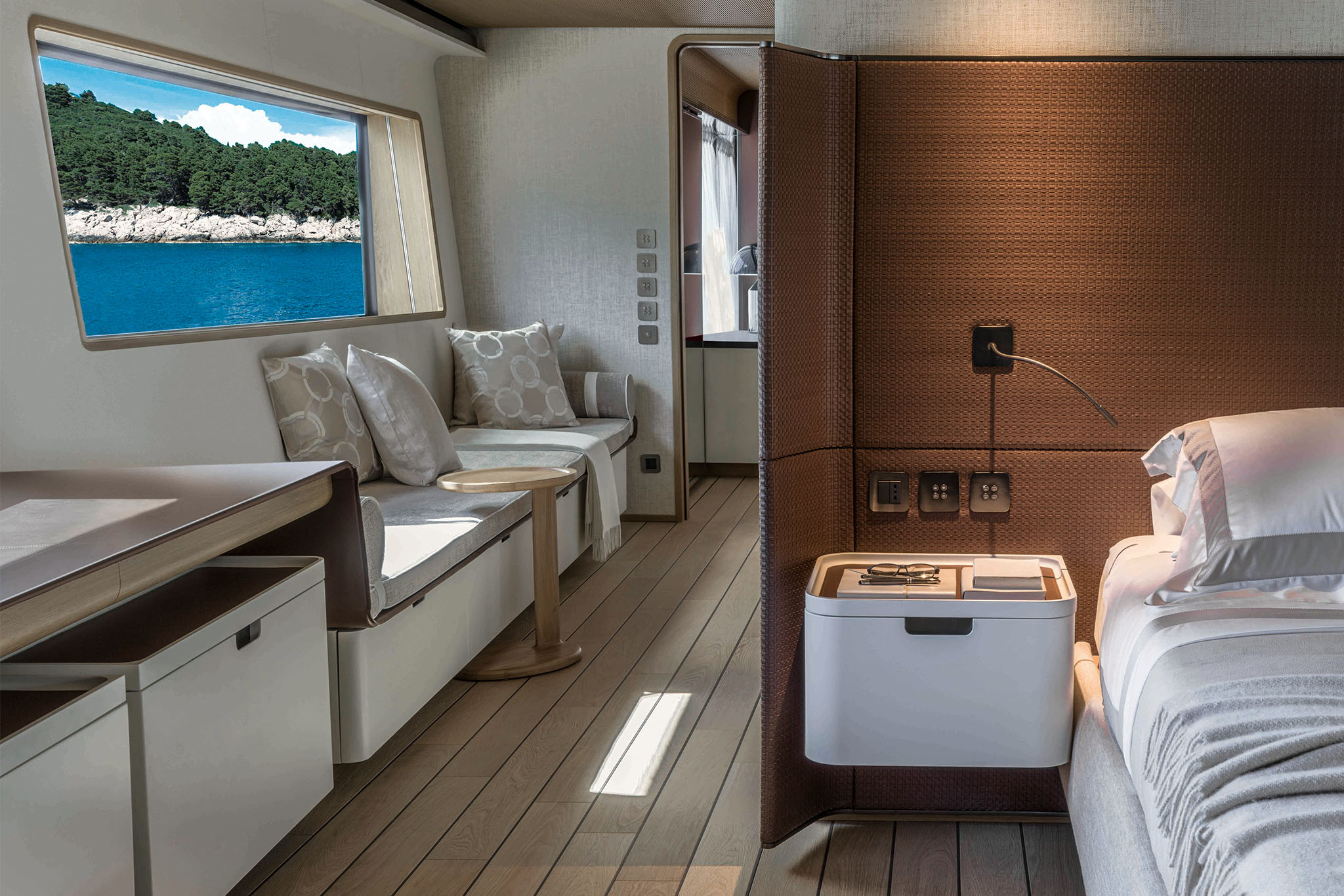 Boasting Custom Line's innovative hi-tech hull design, the Navetta 38 ensures long-distance cruising with minimal fuel consumption and exceptional performance. Twin 1,400 hp MAN units propel the yacht to a top speed of 15 knots, covering a range of 2,800 nautical miles at an economical cruising speed of 10 knots (preliminary data).