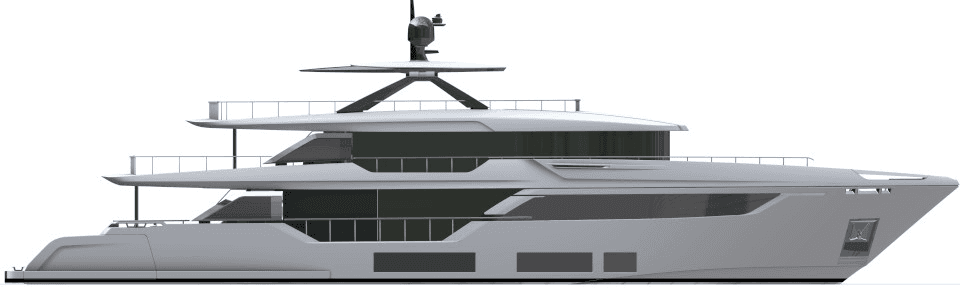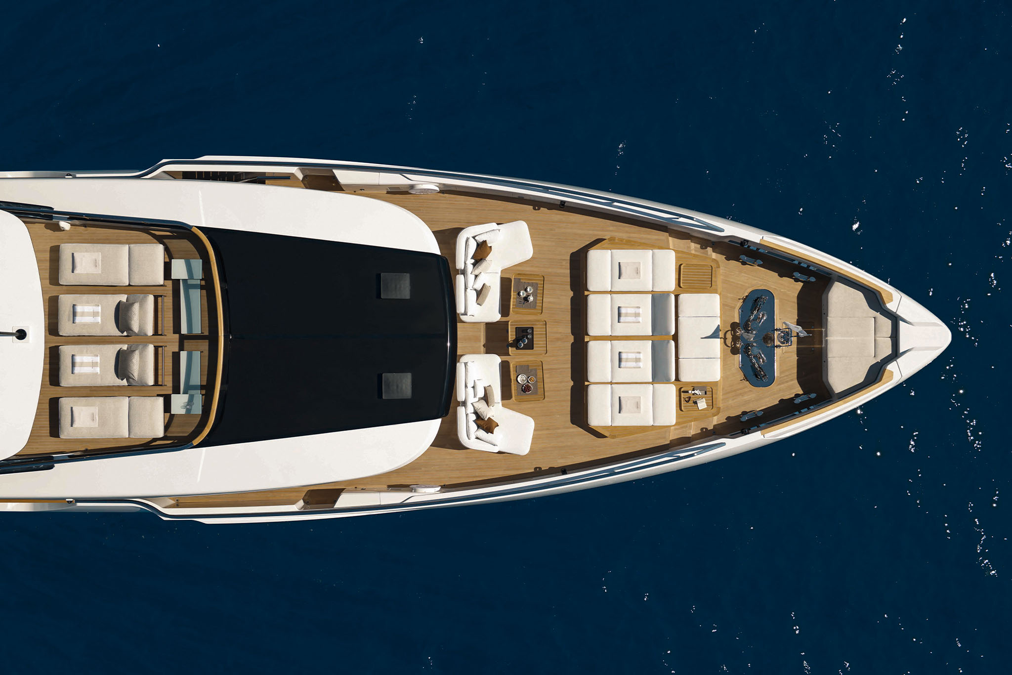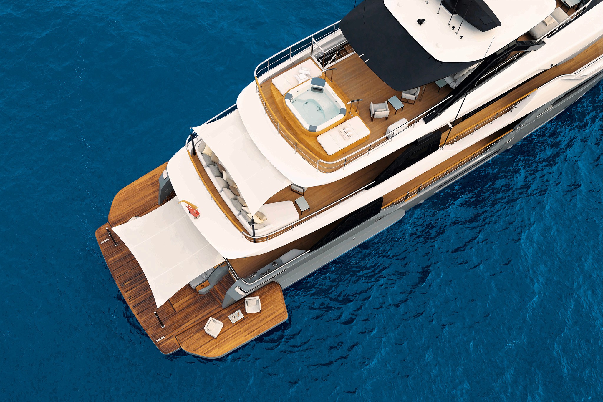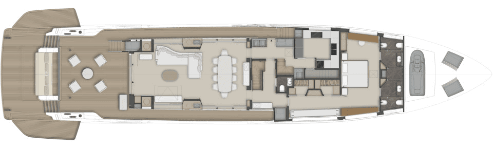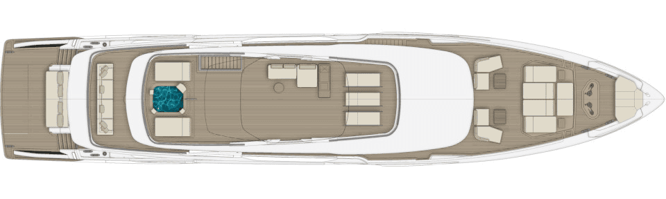Opening the two side terraces further enhances the beach area, extending it to a massive 70m2 with a full length of 15 meters. The enlarged sun deck becomes an inviting oasis for relaxation, featuring a spectacular aft sea-view jacuzzi with sunpad, a bow sun lounge area, and formal al fresco dining. The impressive sky lounge takes centre stage on the upper deck.