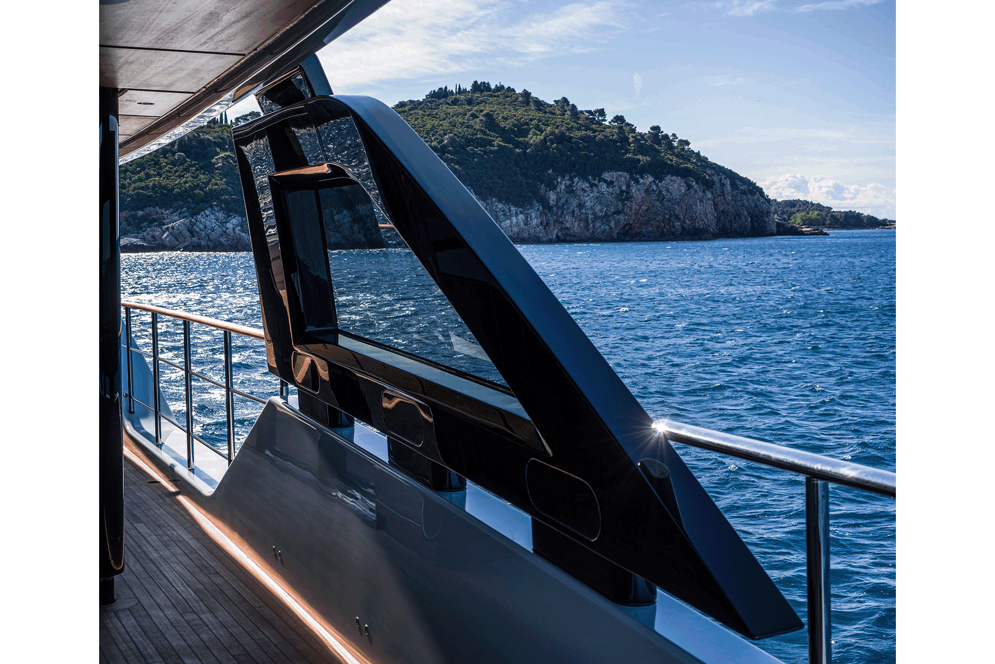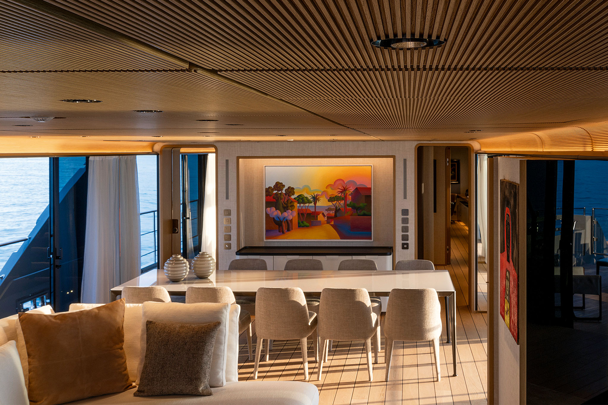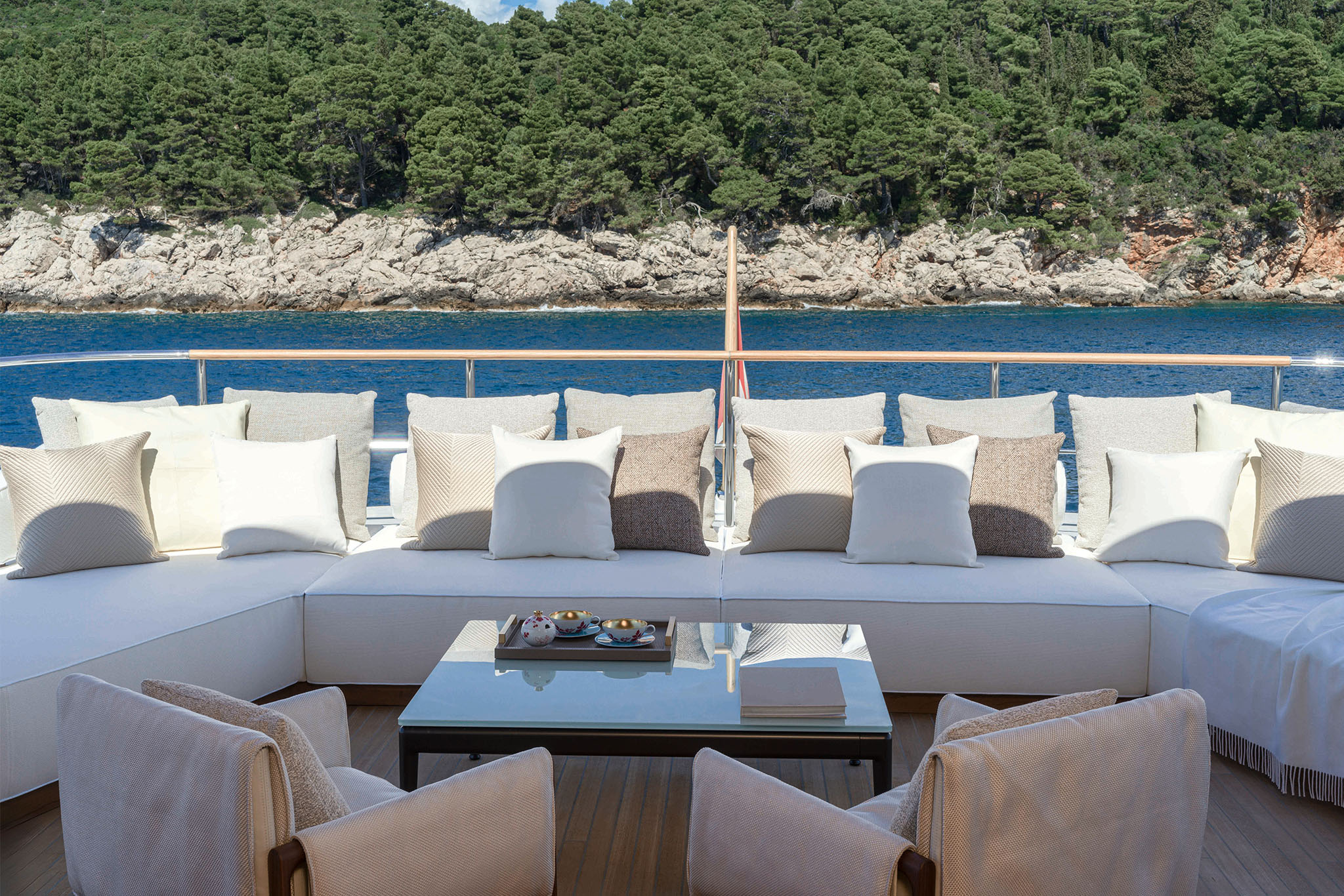 Opening the two side terraces further enhances the beach area, extending it to a massive 70m2 with a full length of 15 meters. The enlarged sun deck becomes an inviting oasis for relaxation, featuring a spectacular aft sea-view jacuzzi with sunpad, a bow sun lounge area, and formal al fresco dining. The impressive sky lounge takes centre stage on the upper deck.
