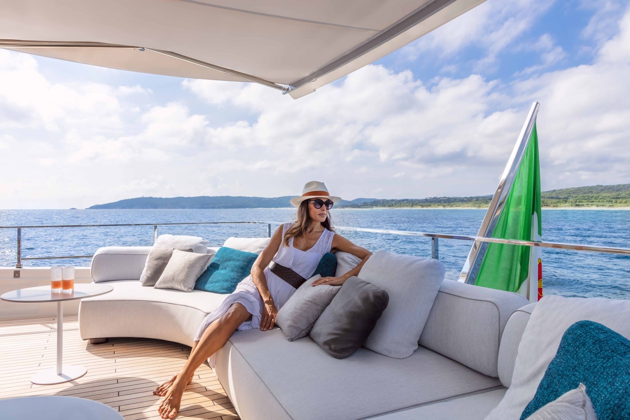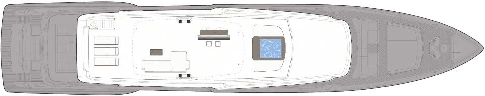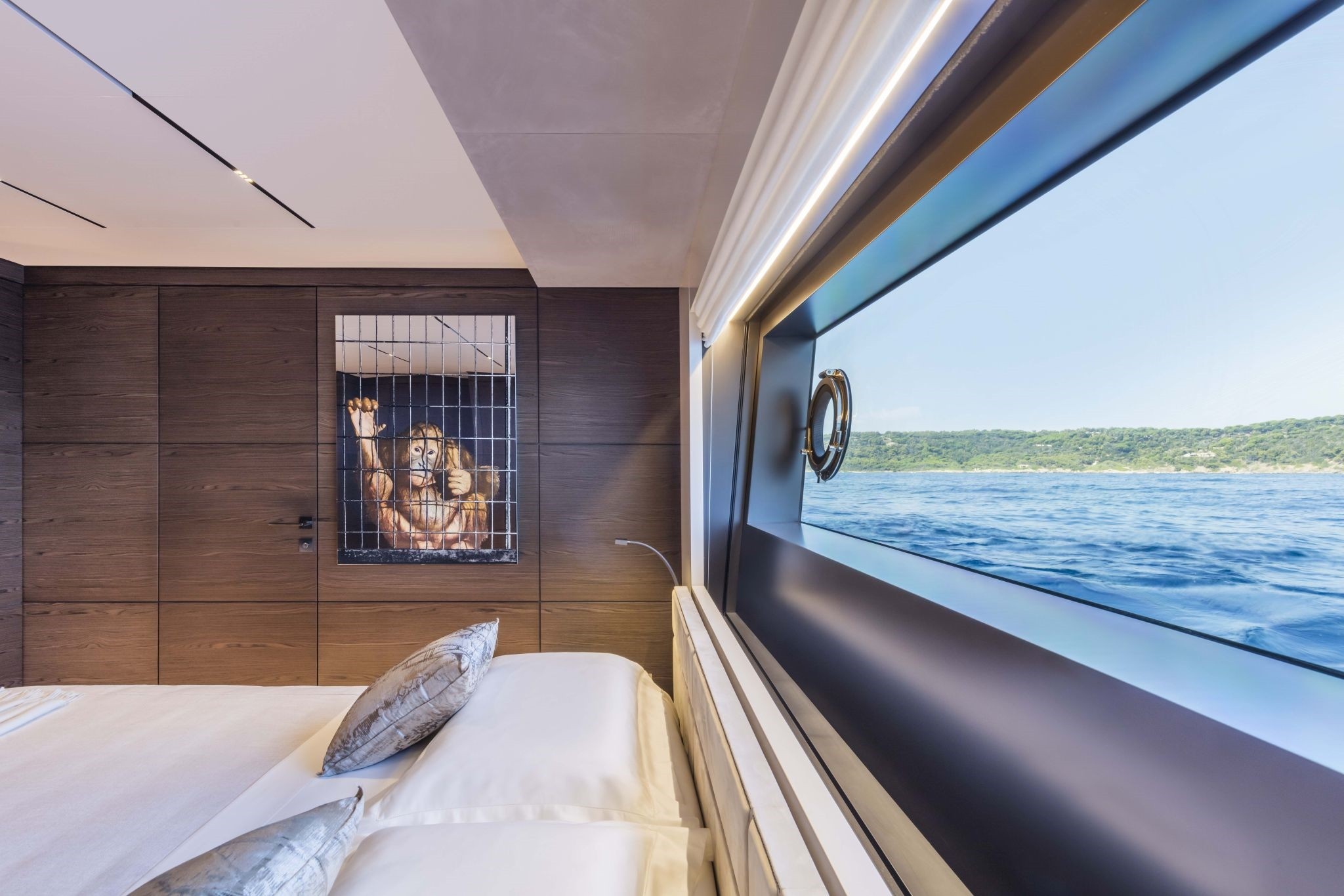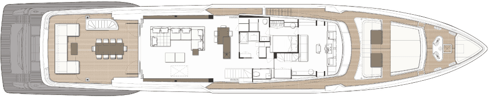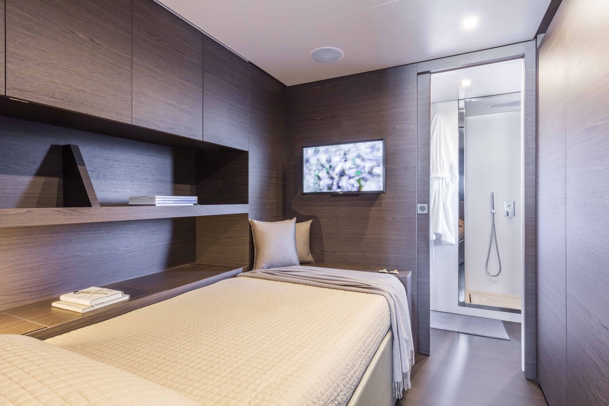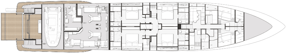 The master suite has been re-designed to include a new wardrobe in the entrance area and larger windows that let in natural light and add more to the panoramic view. Accommodation comprises a sumptuous five double cabin layout for ten plus three crew cabins for five crew. The lower deck is devoted entirely to guests and crew. The guest area has four cabins consisting of two mirror-image VIP cabins aft and two guest cabins forward, one of which fitted with separable and pullman beds. All the suites on the lower deck have an en-suite bathroom.
