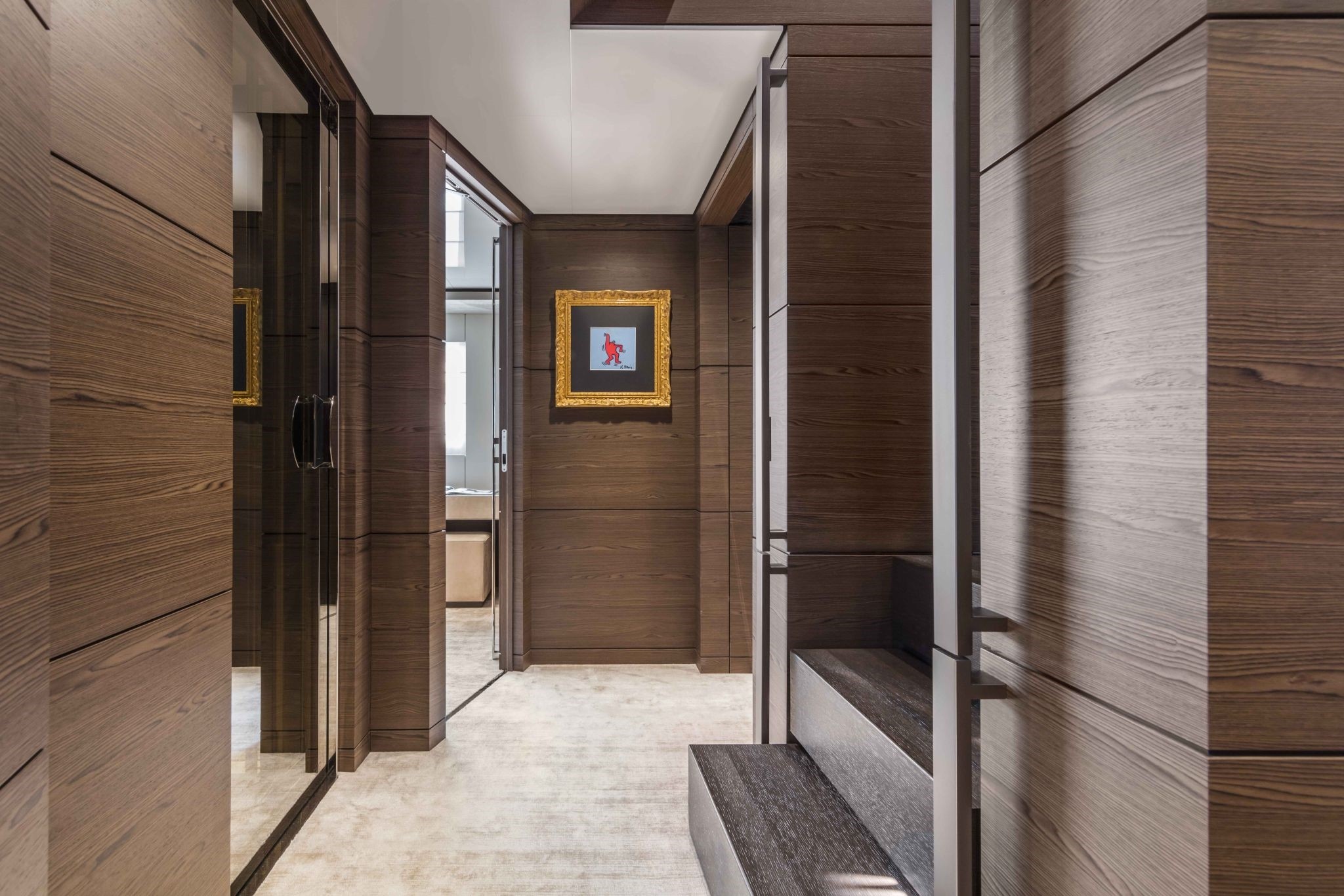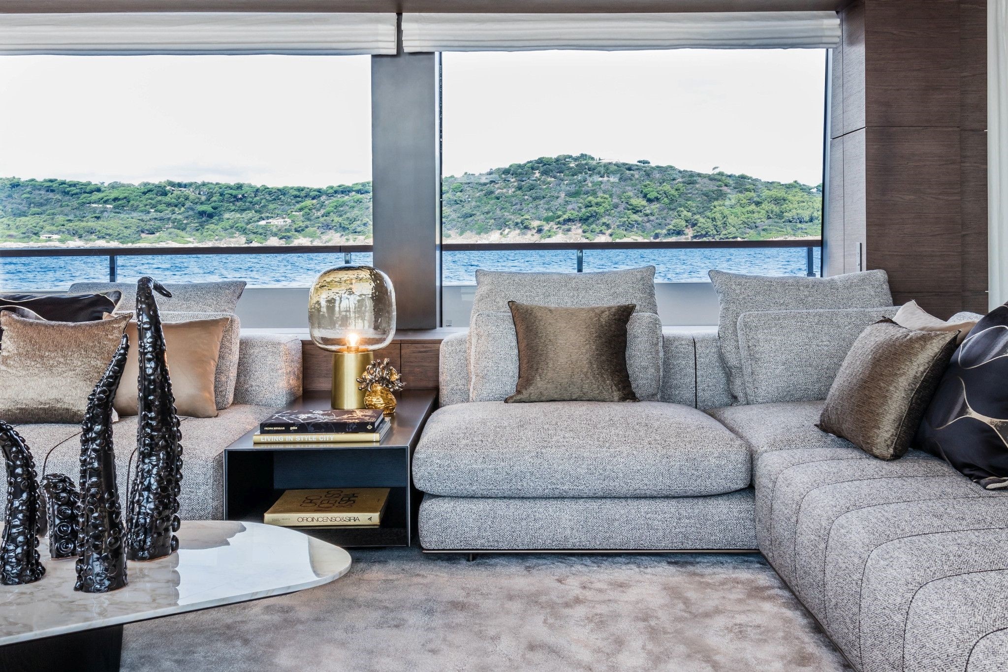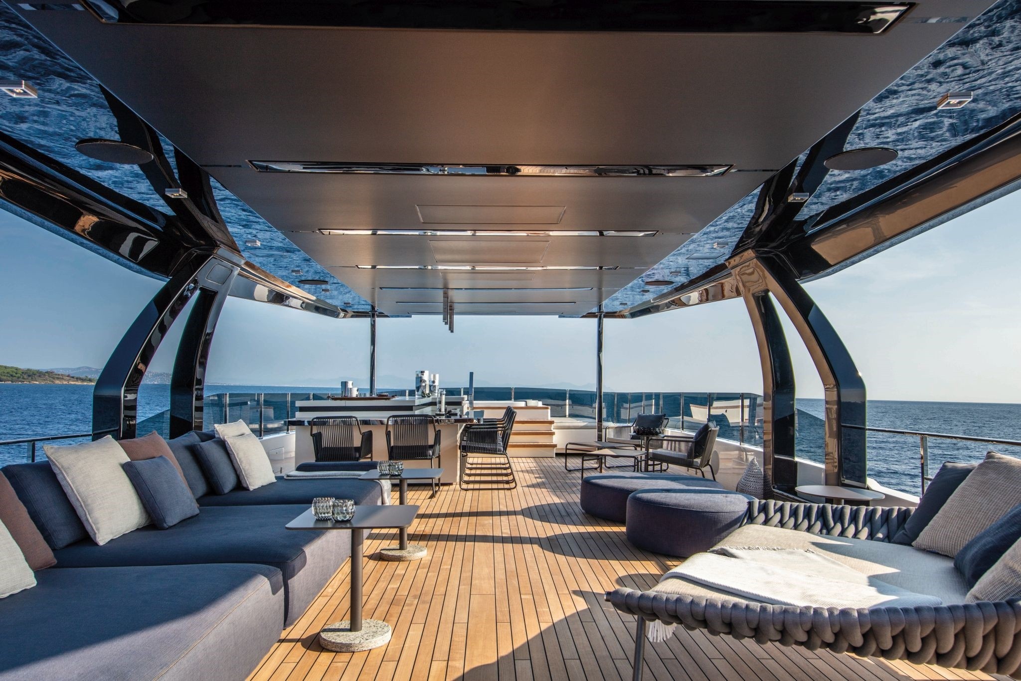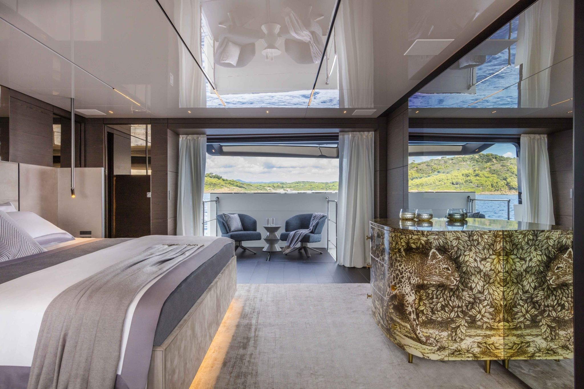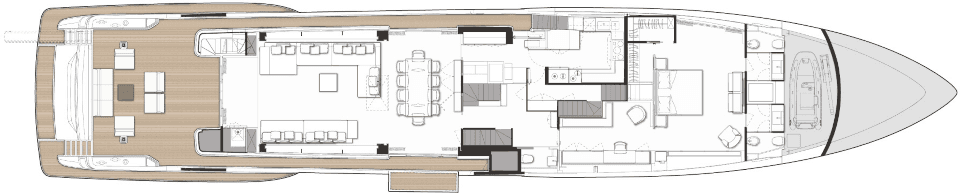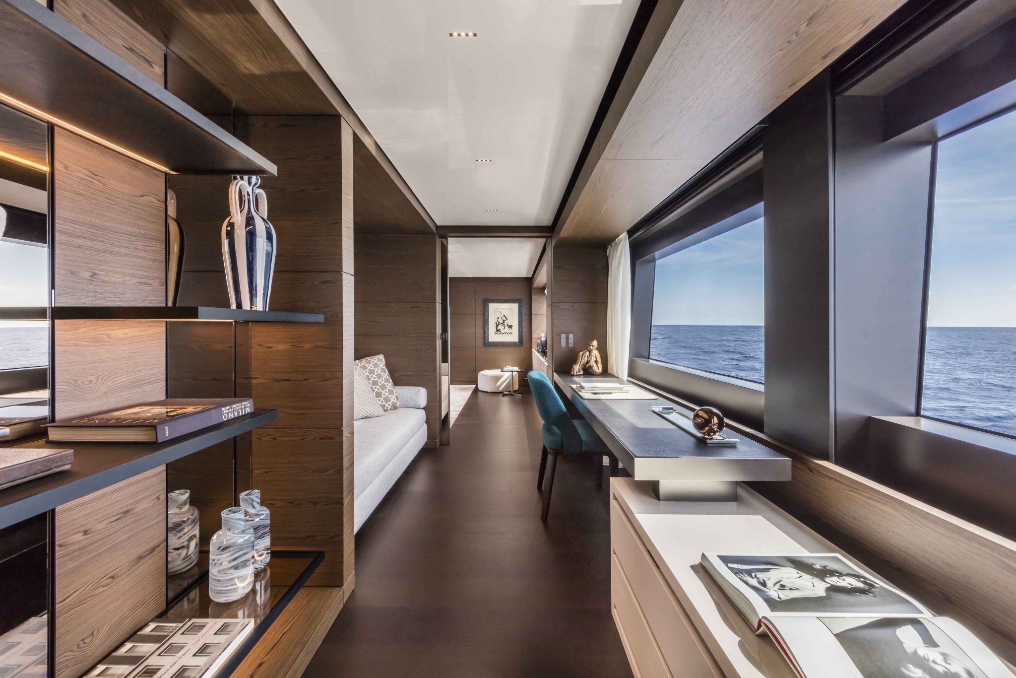 The interior spaces for this substantial upgrade has been created with a radical restyling. The main deck lounge can be configured with two different layouts: one has the dining area aft and the lounge midships, while the alternative layout is more traditional, with the lounge area and generous sofas in the entry area and the dining area in the centre. The large, elegant main salon, which covers over 50m² and has high ceilings, more than 2 metres throughout and over 2.25m at the highest point. High gloss rosewood is the featured wood, paired with black hammered leather elements and lacquered surfaces that reflect the light flooding in through the large side windows
