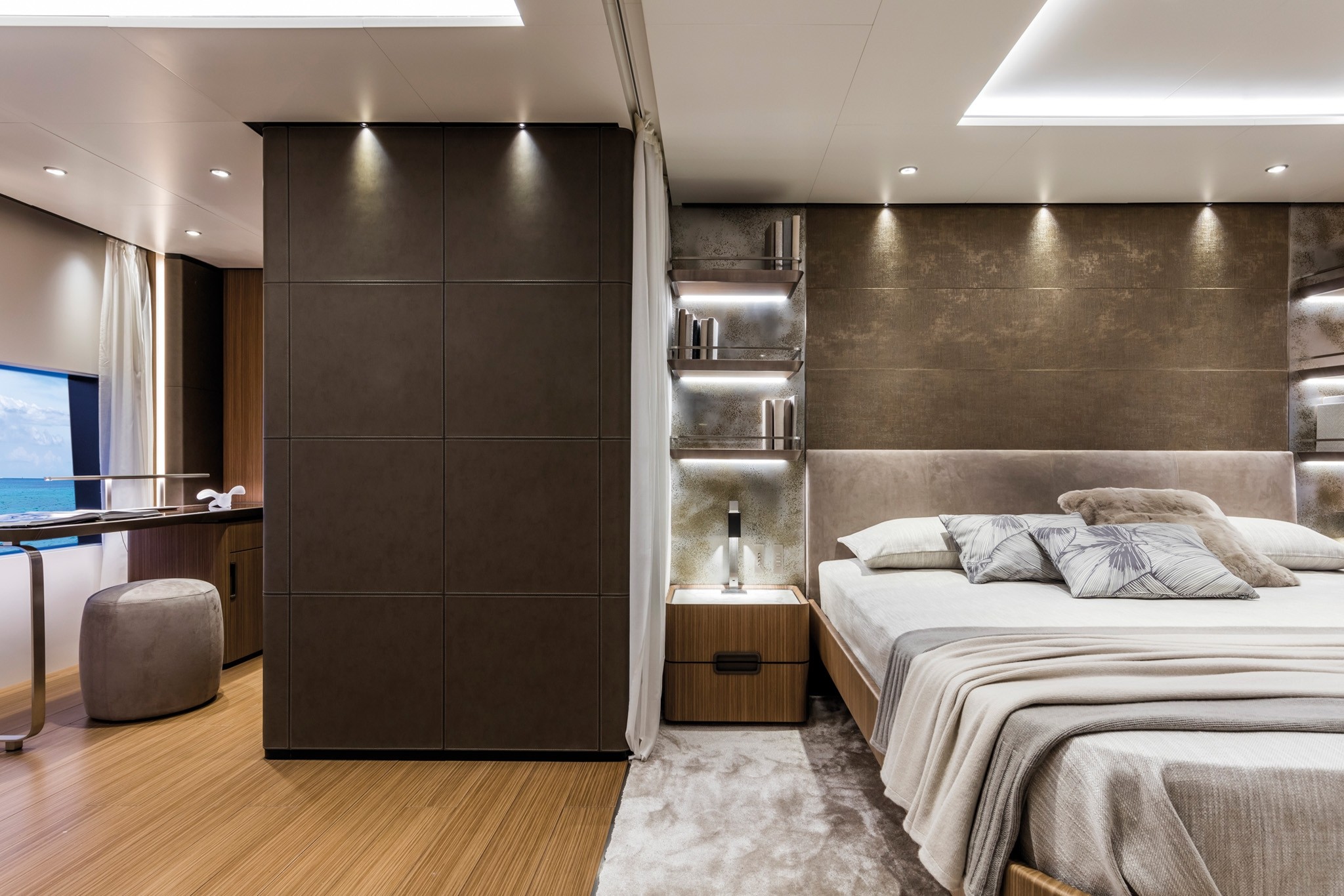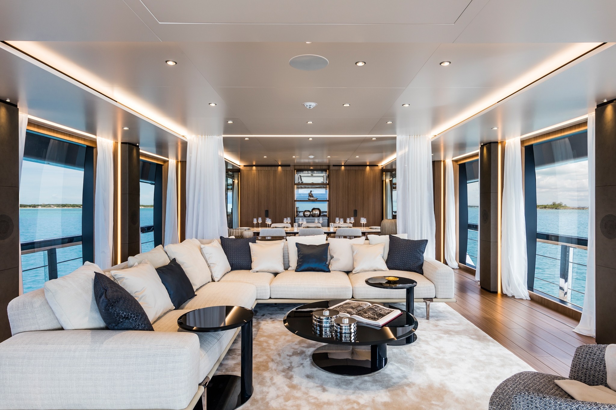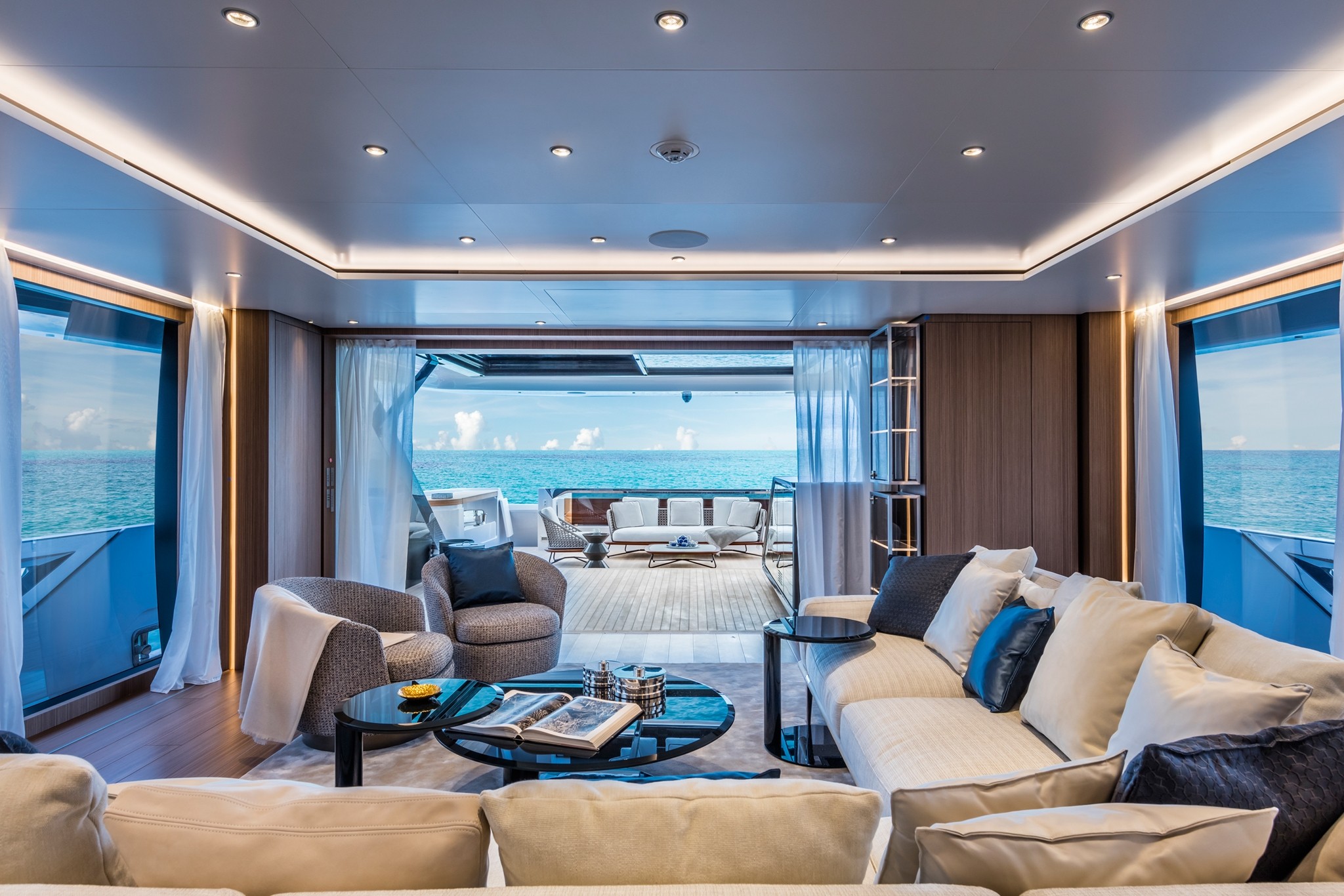 Enjoyment for everyone on board is always the top priority in any Custom Line design, and that's clearly evident in the magnificent new Custom Line Saetta 120. There are terrific views from wherever you are on this fast cruising, semi-custom superyacht, but particularly the main saloon with its huge windows looking out through cut-down bulwarks.