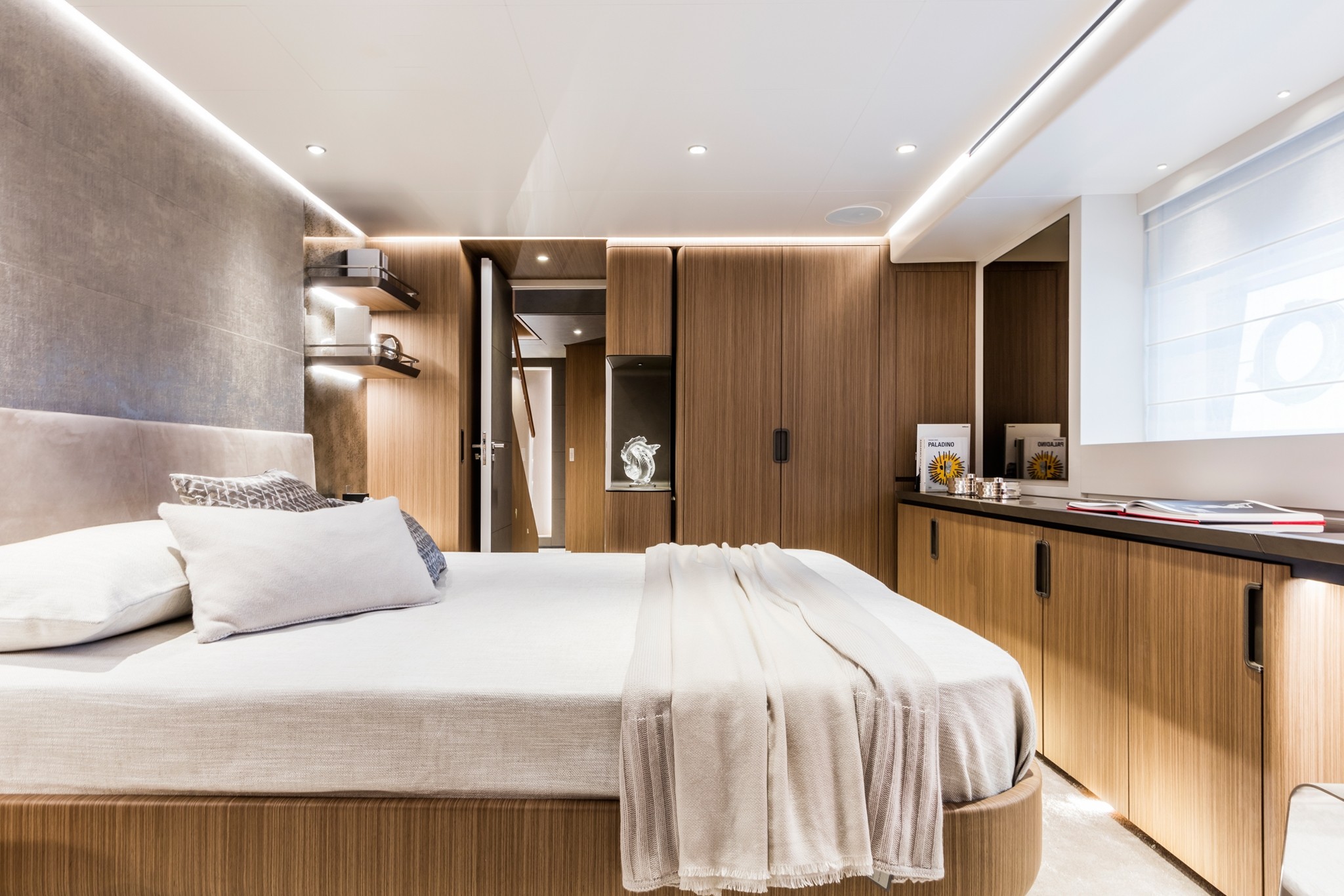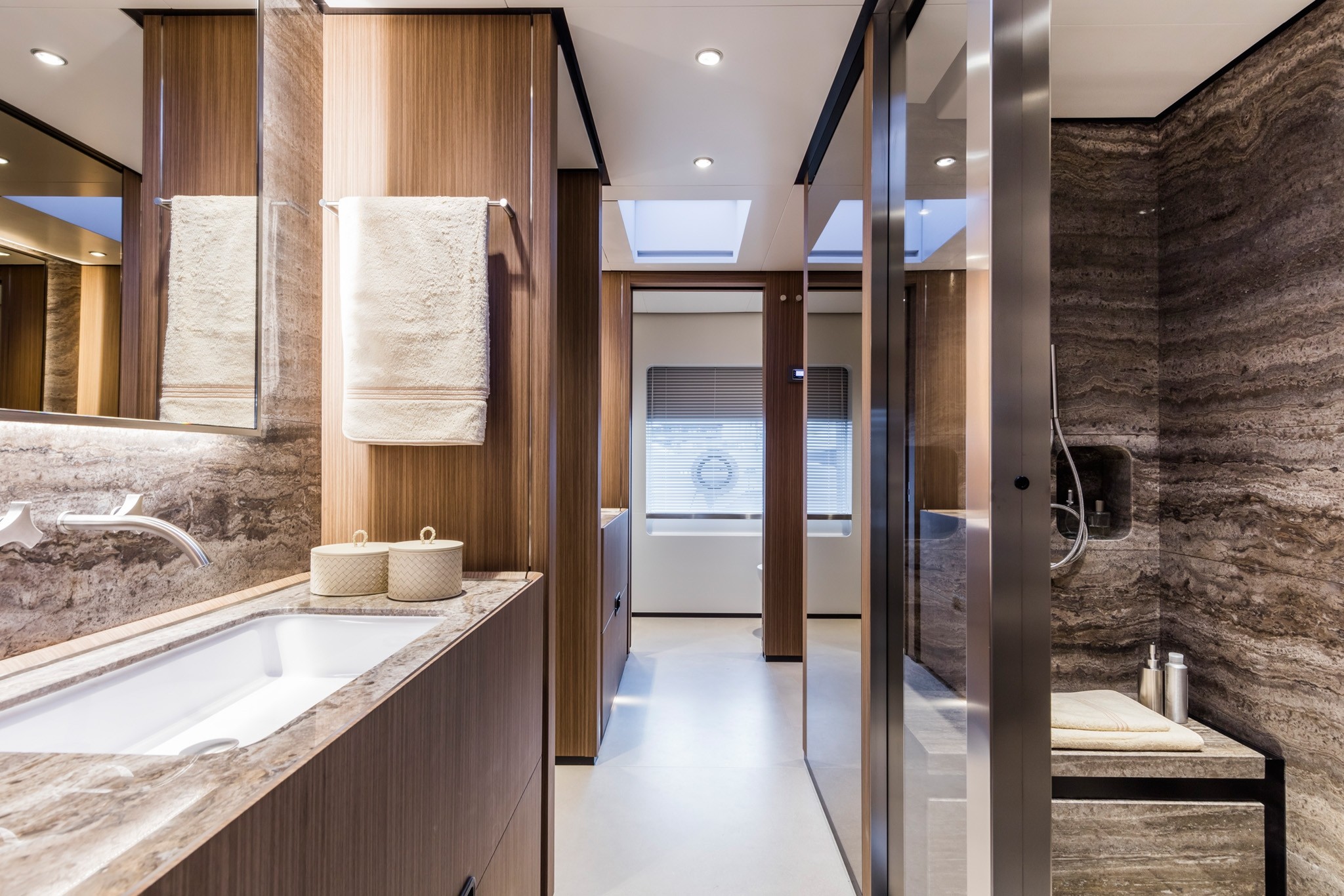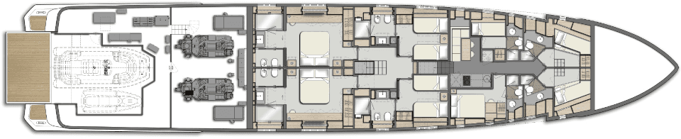 The master suite has been re-designed to include a new wardrobe in the entrance area and larger windows that let in natural light and add more to the panoramic view. Accommodation comprises a sumptuous five double cabin layout for ten plus three crew cabins for five crew. The lower deck is devoted entirely to guests and crew. The guest area has four cabins consisting of two mirror-image VIP cabins aft and two guest cabins forward, one of which fitted with separable and pullman beds. All the suites on the lower deck have an en-suite bathroom.