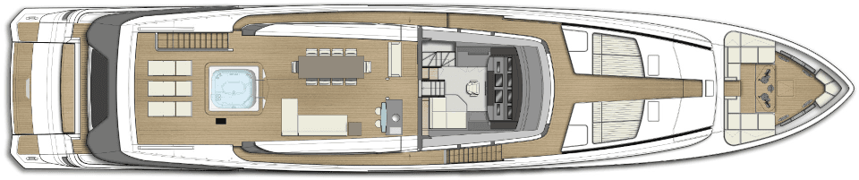 The deck facilities on the Saetta 120 are simply superb. On top, the sundeck enjoys an unusual degree privacy and shelter when under way as it is screened down both sides. It features a spa pool as well as lounging, seating and dining areas.