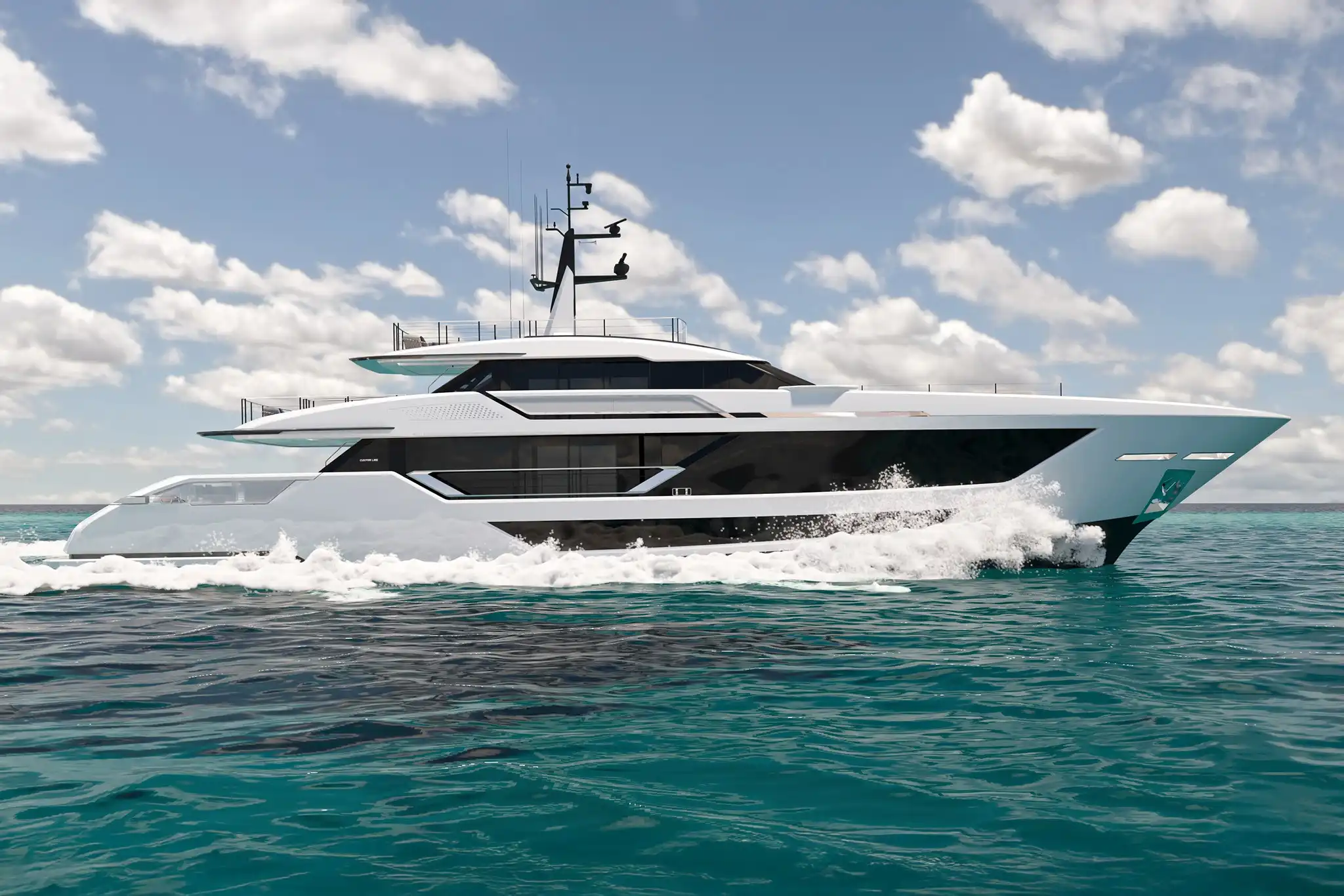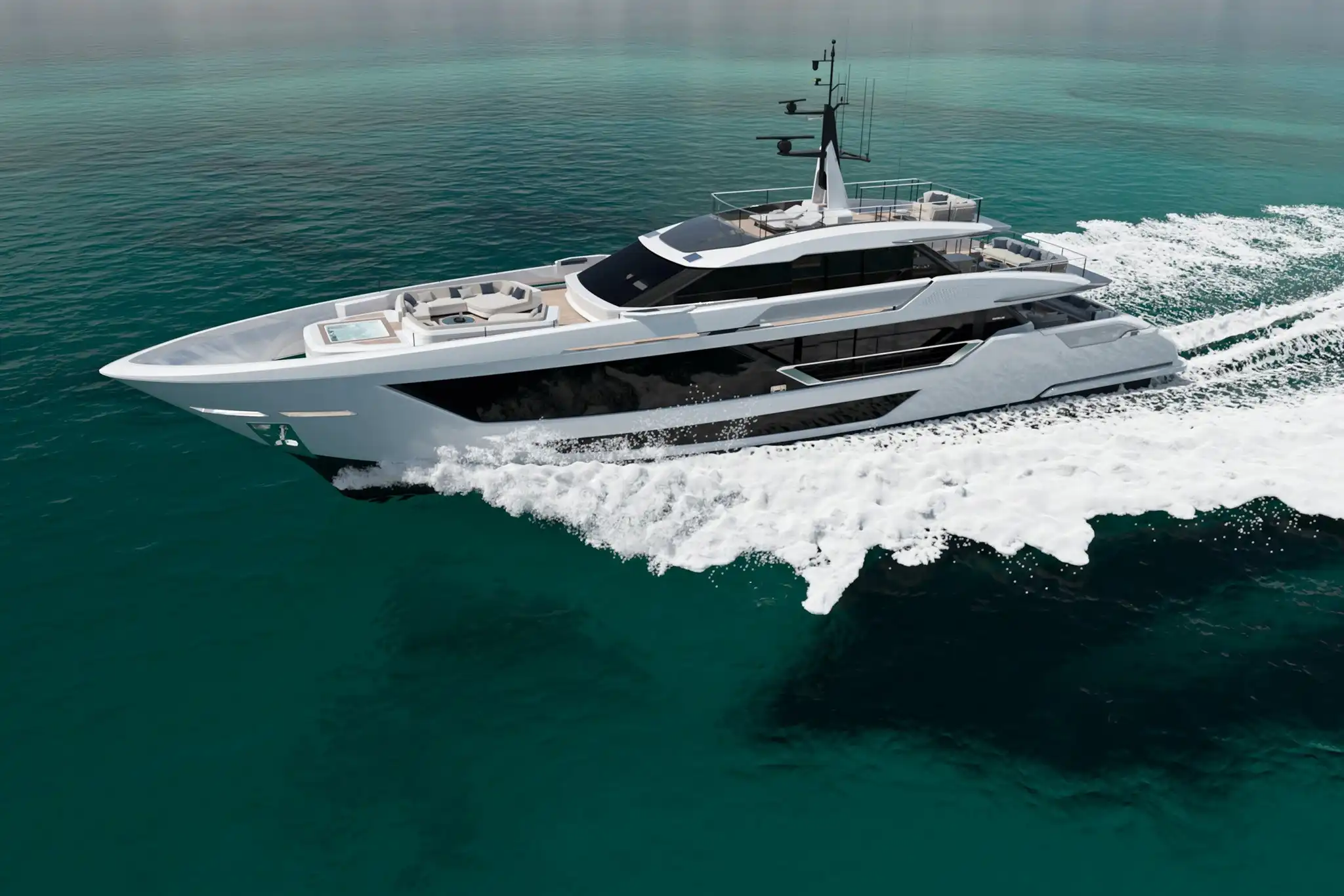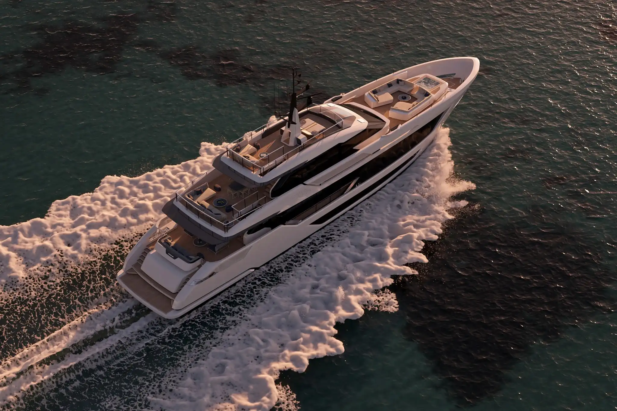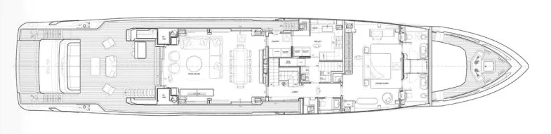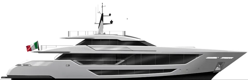 The Custom Line Saetta 128 project standard engine configuration features twin MTU 16V 2000's. This gives the yacht a top speed of 22.5-knots.