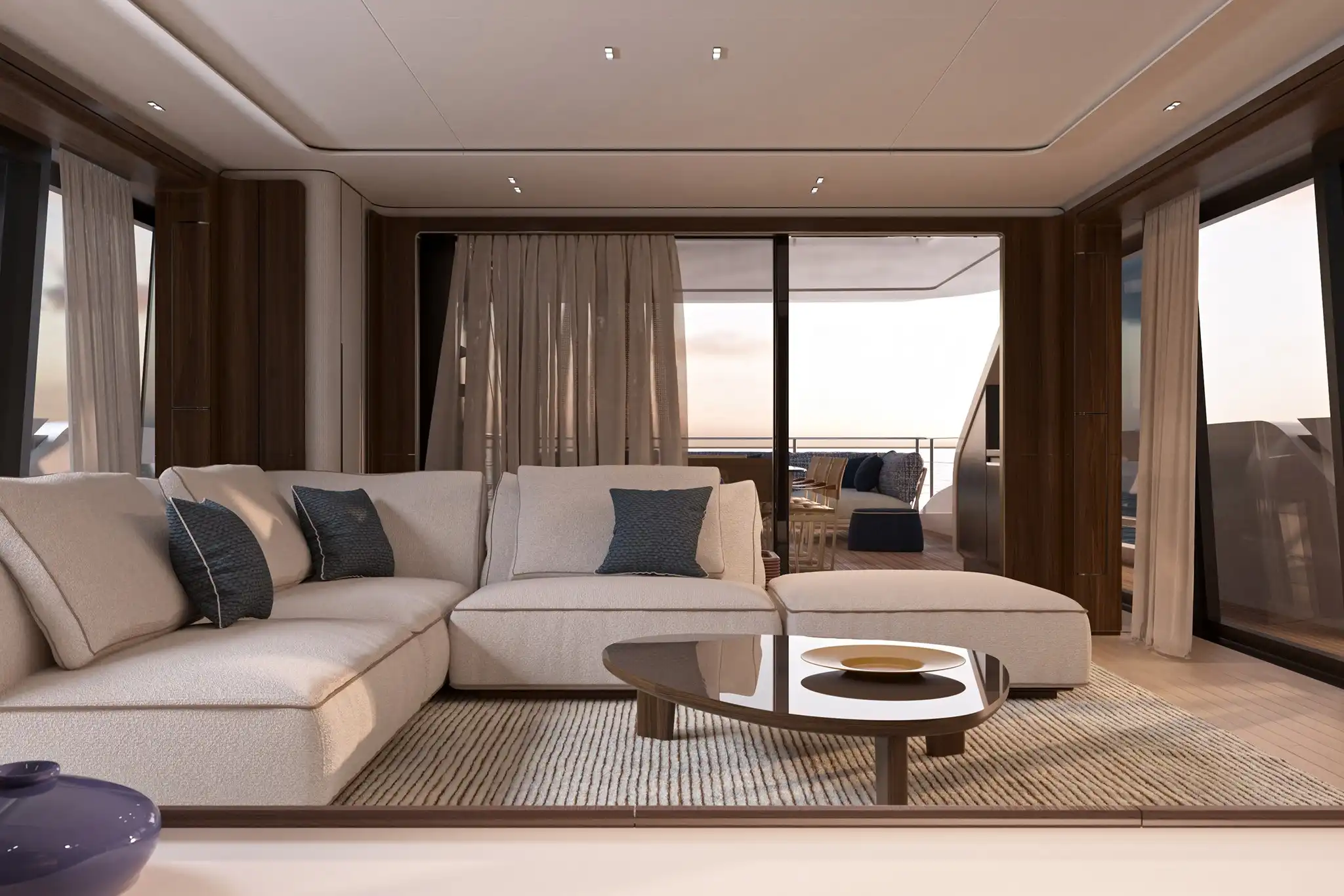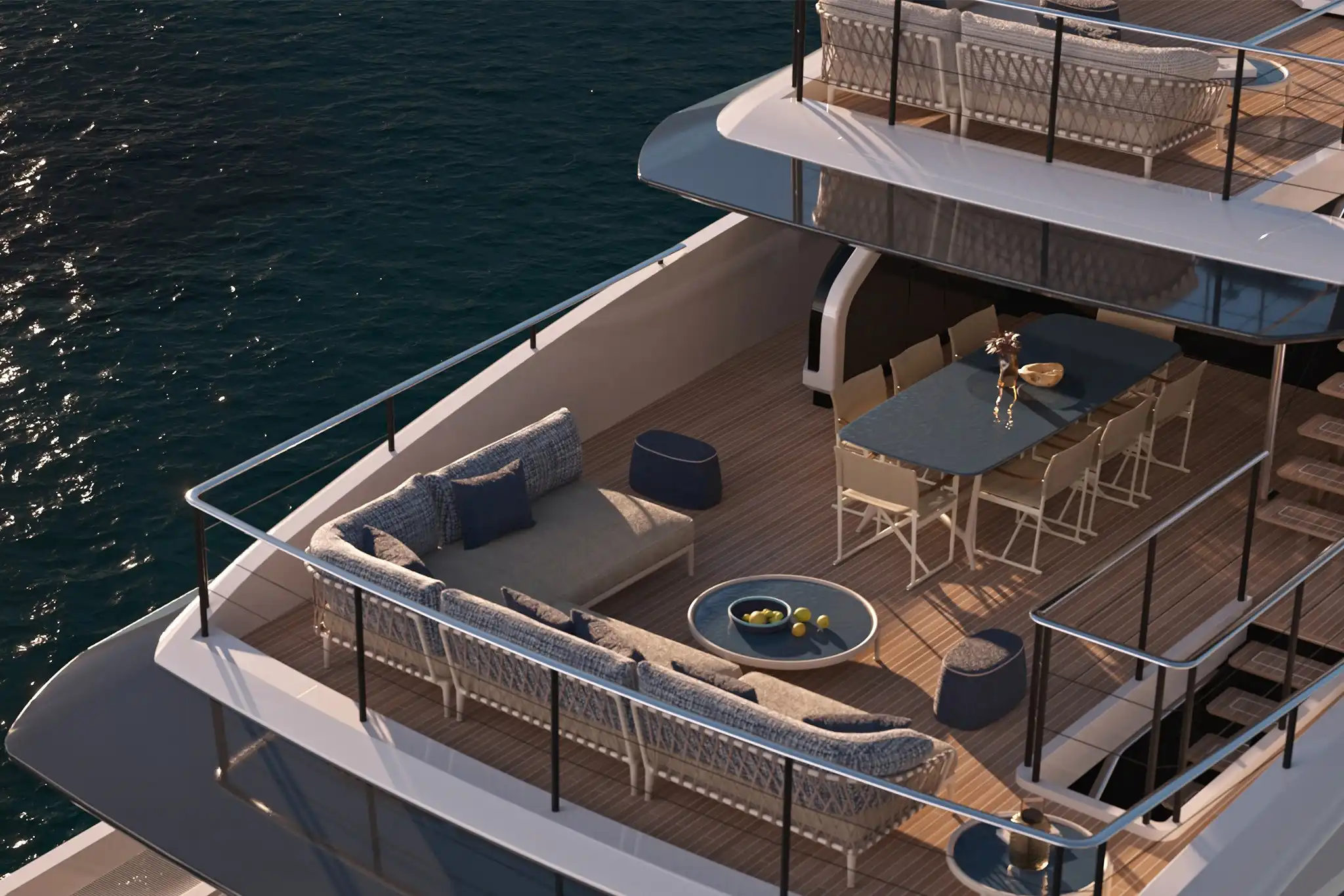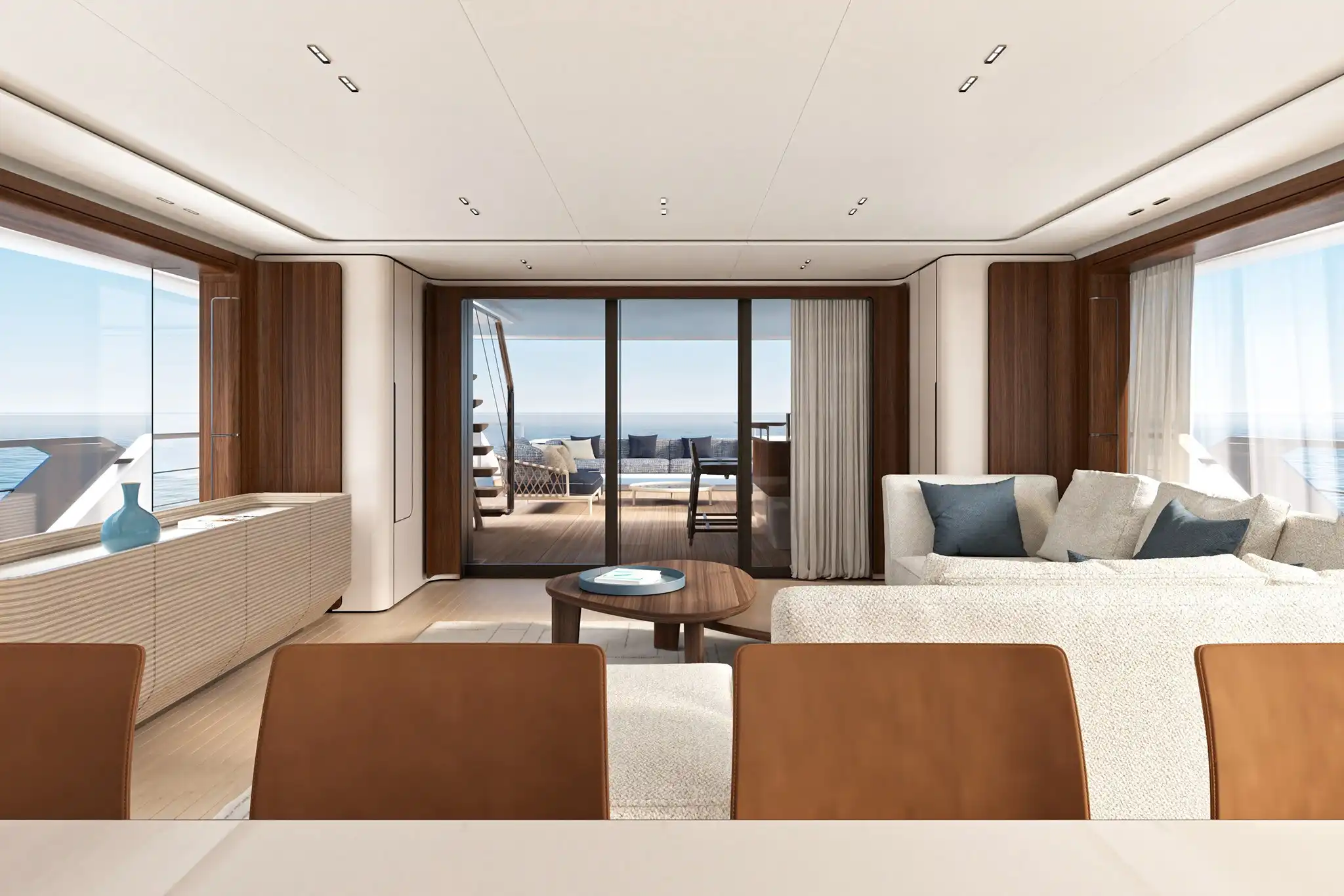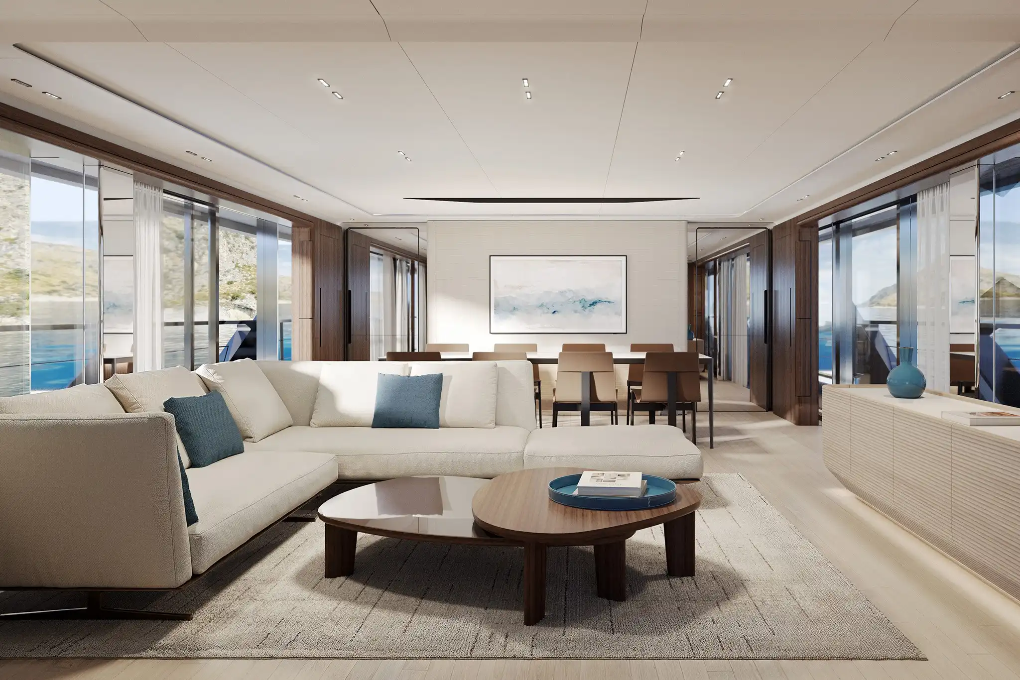 At 30m², the main deck aft accommodates ten for alfresco dining amidst freestanding furniture. A matching 30m² cockpit houses a cocktail bar, while the 10m² stern incorporates a DMT (Dual Mode ‘Transform’) garage system for two water toys.