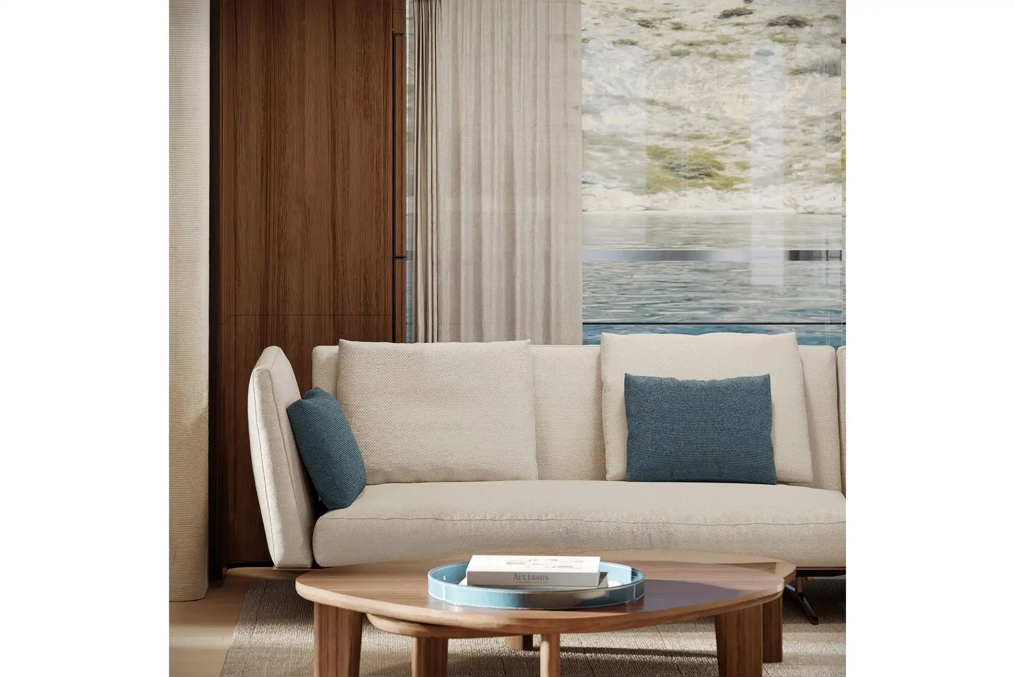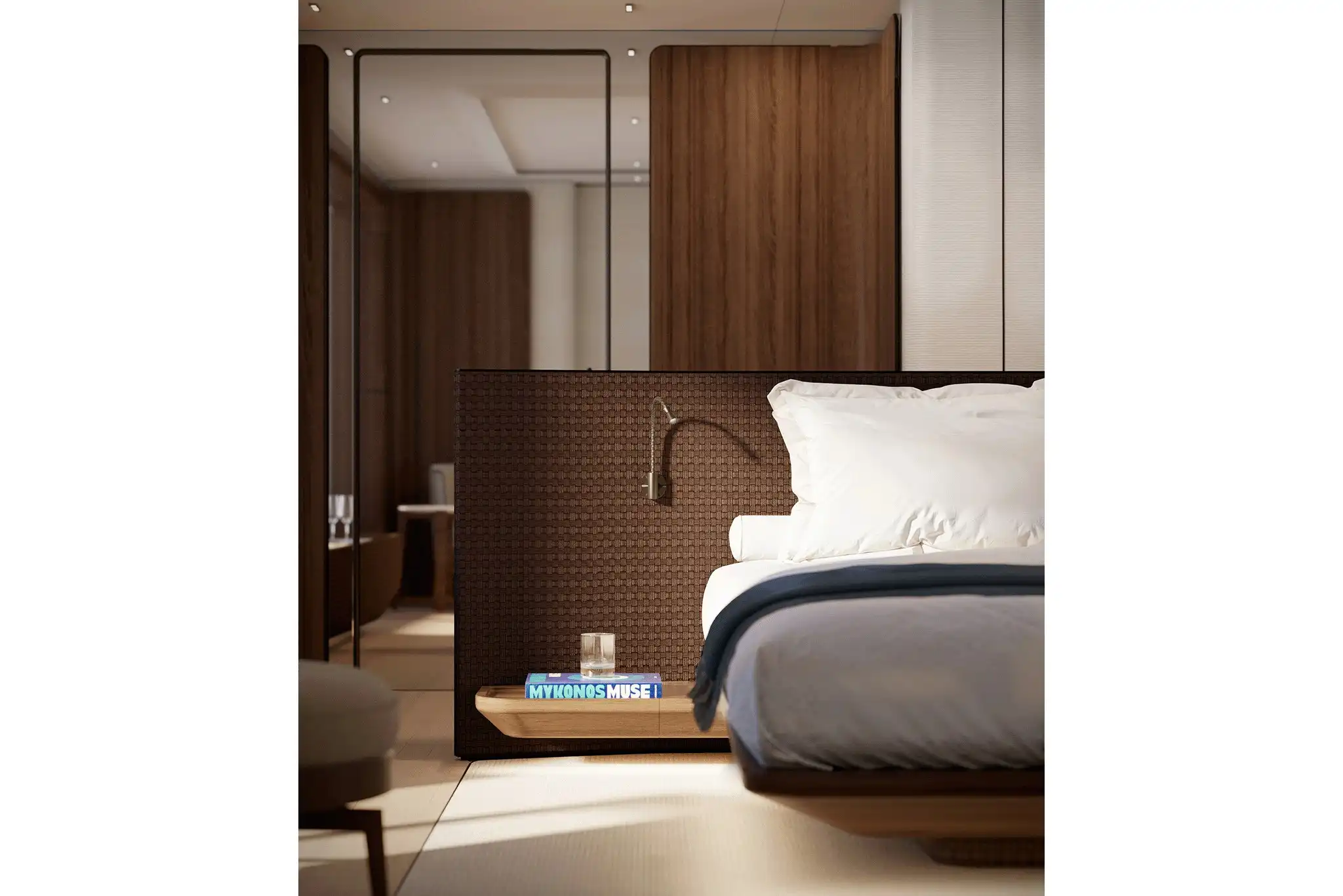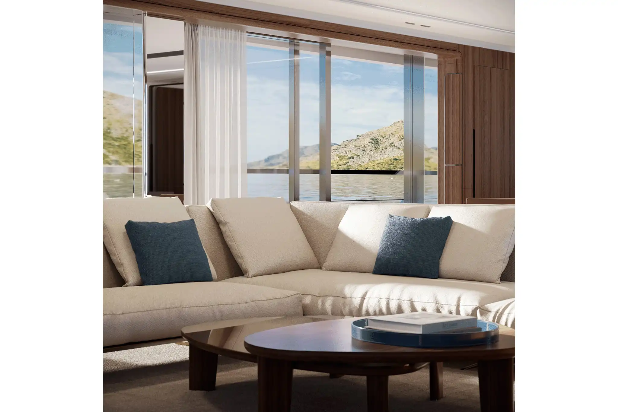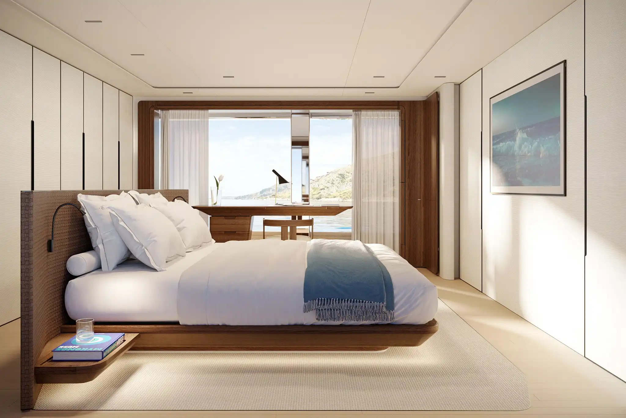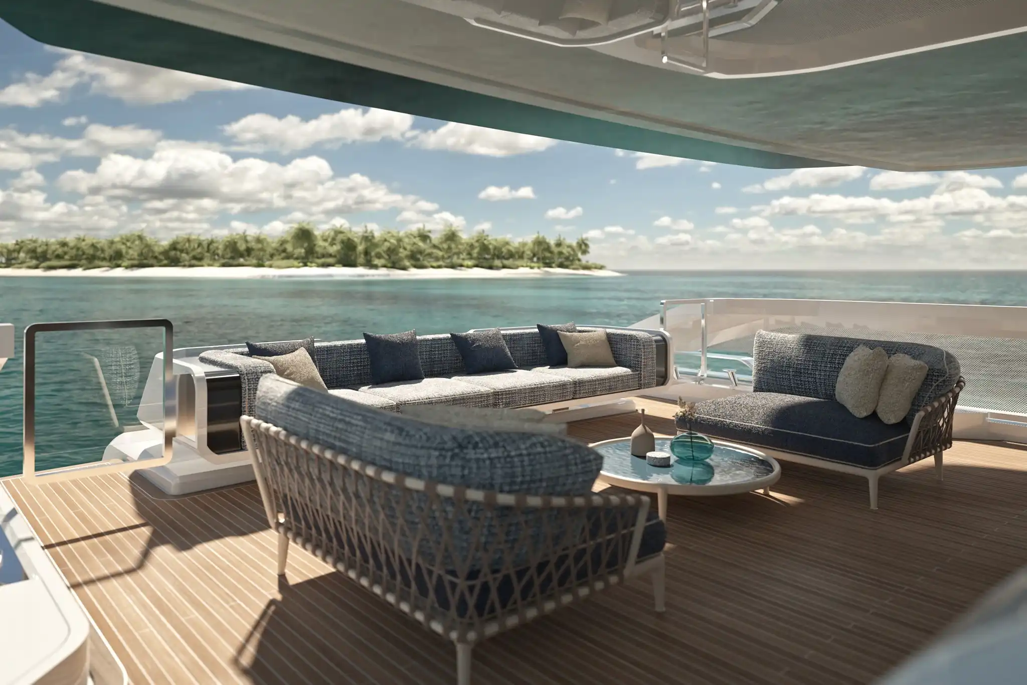 At 30m², the main deck aft accommodates ten for alfresco dining amidst freestanding furniture. A matching 30m² cockpit houses a cocktail bar, while the 10m² stern incorporates a DMT (Dual Mode ‘Transform’) garage system for two water toys.