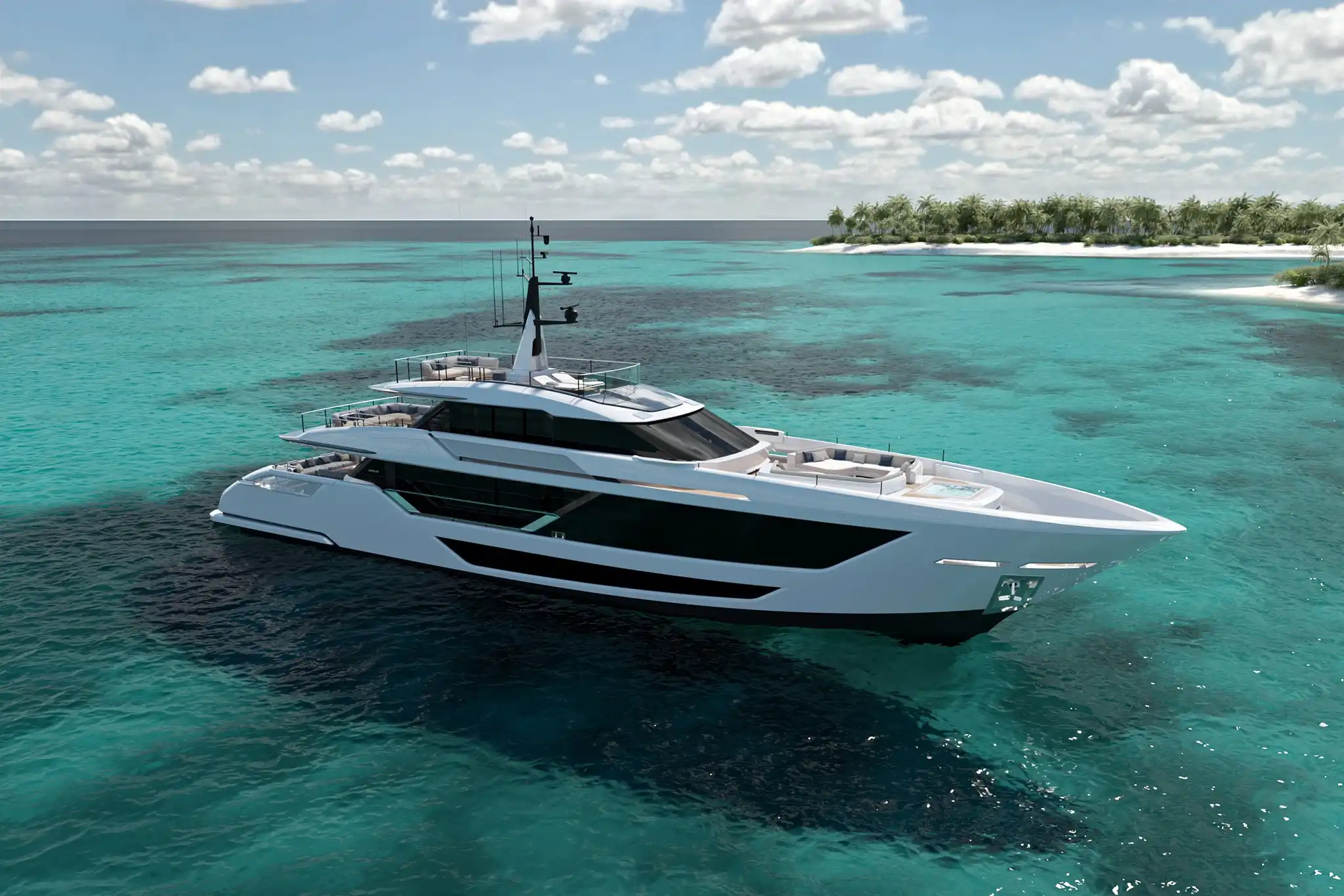 This new model in the Custom Line planing series replaces the existing Saetta 120, completing the new line-up of the range, namely the Saetta 106, Saetta 128 and the flagship Saetta 140. This sleek new 39.75m beauty with all the curves and sweeping lines of her predecessor has a cruise range of around 1000 nm and a top speed of 22.5 knots. The accommodation is impressive too with five guest cabins and another four for crew. The yacht is offered with semi-custom design styles. The overall deck space is phenomenal as can be seen from the overhead renderings.