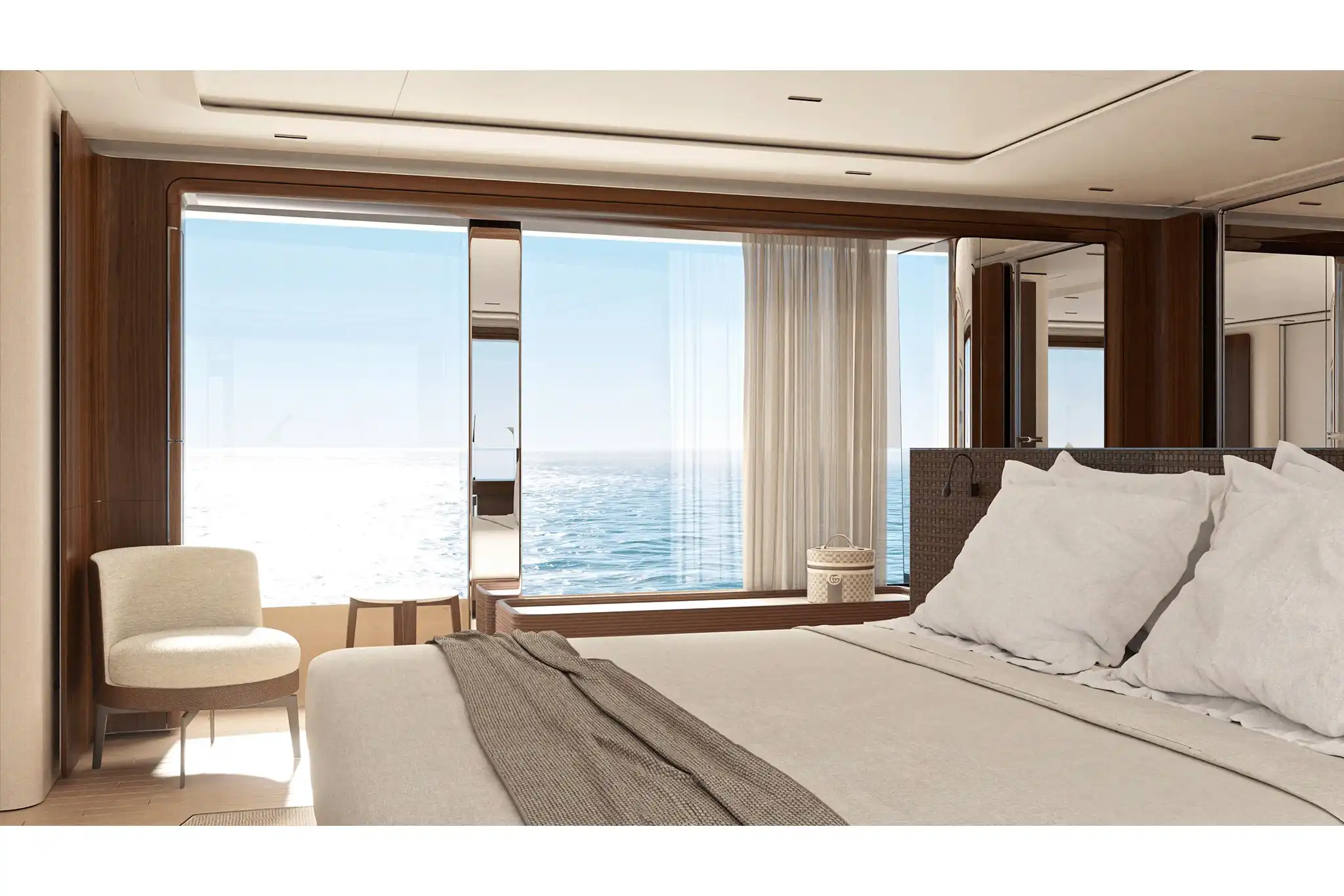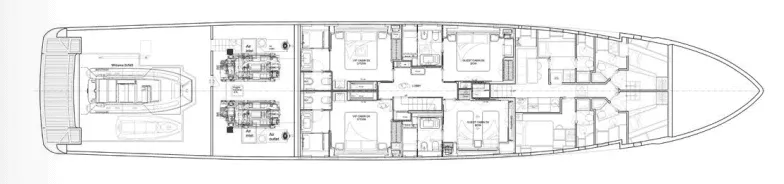 The master suite has been re-designed to include a new wardrobe in the entrance area and larger windows that let in natural light and add more to the panoramic view. Accommodation comprises a sumptuous five double cabin layout for ten plus three crew cabins for five crew. The lower deck is devoted entirely to guests and crew. The guest area has four cabins consisting of two mirror-image VIP cabins aft and two guest cabins forward, one of which fitted with separable and pullman beds. All the suites on the lower deck have an en-suite bathroom.