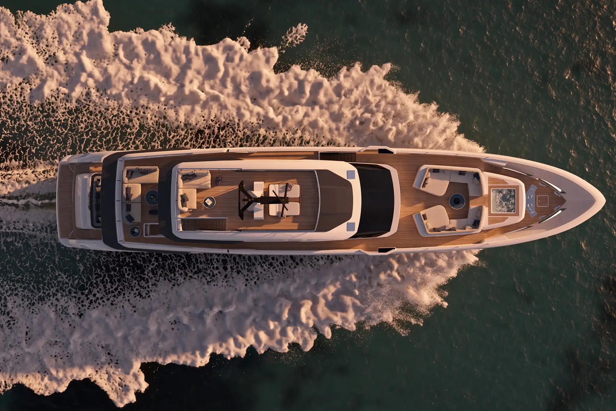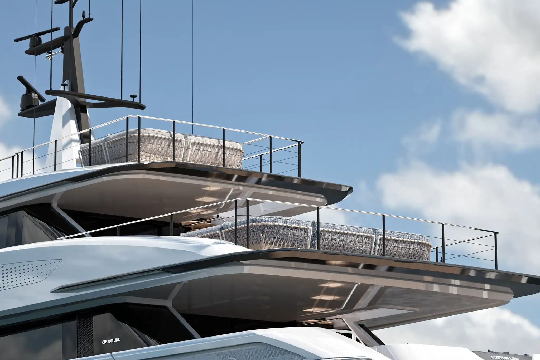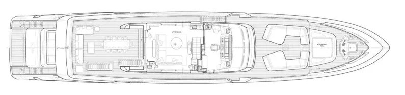 The Custom Line Saetta 128's tri-deck layout showcases intelligent space utilisation throughout. The bow features generous seating and a convertible sunpad-to-jacuzzi area. The flybridge delivers commanding views with forward sunbathing space and multiple seating zones.
