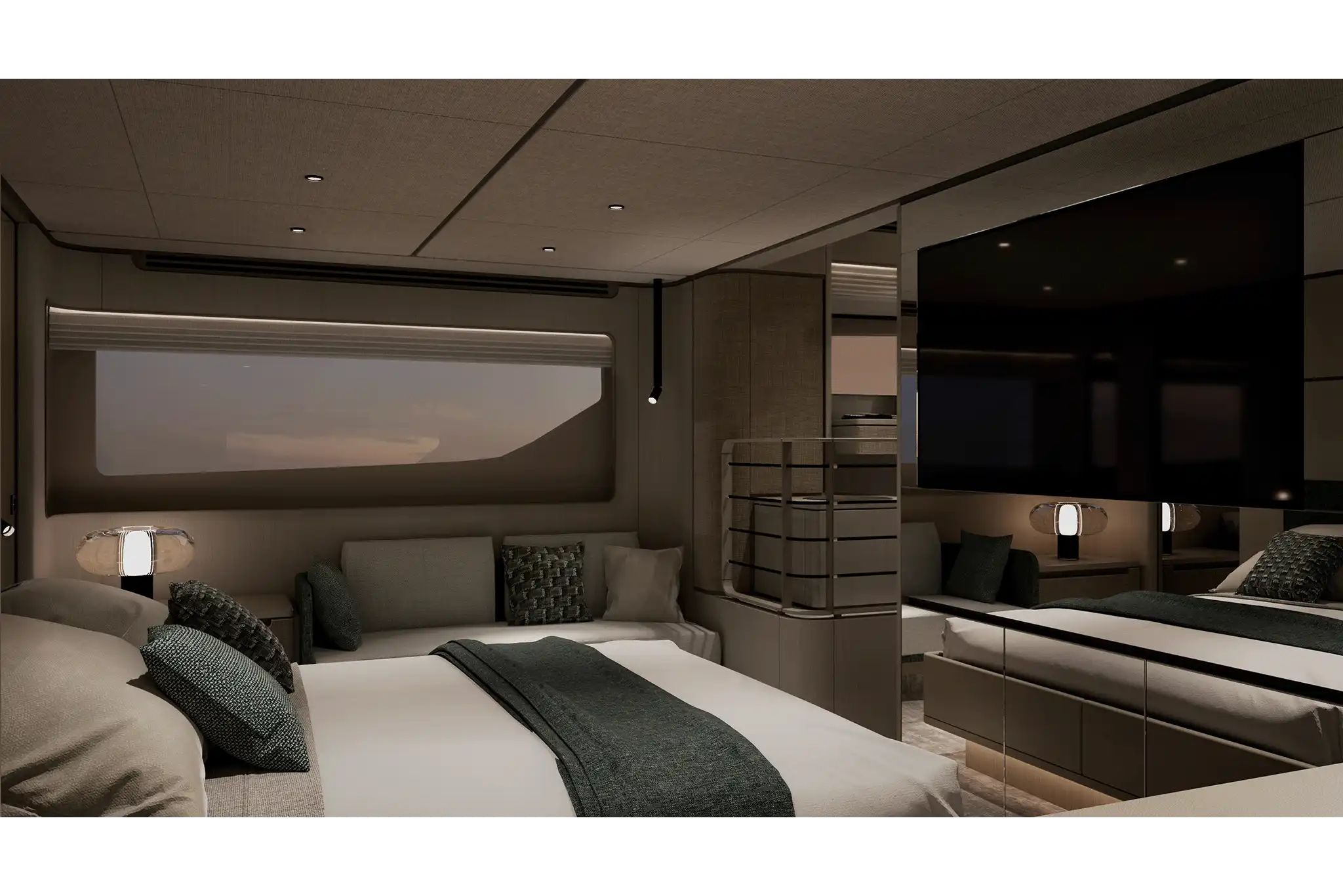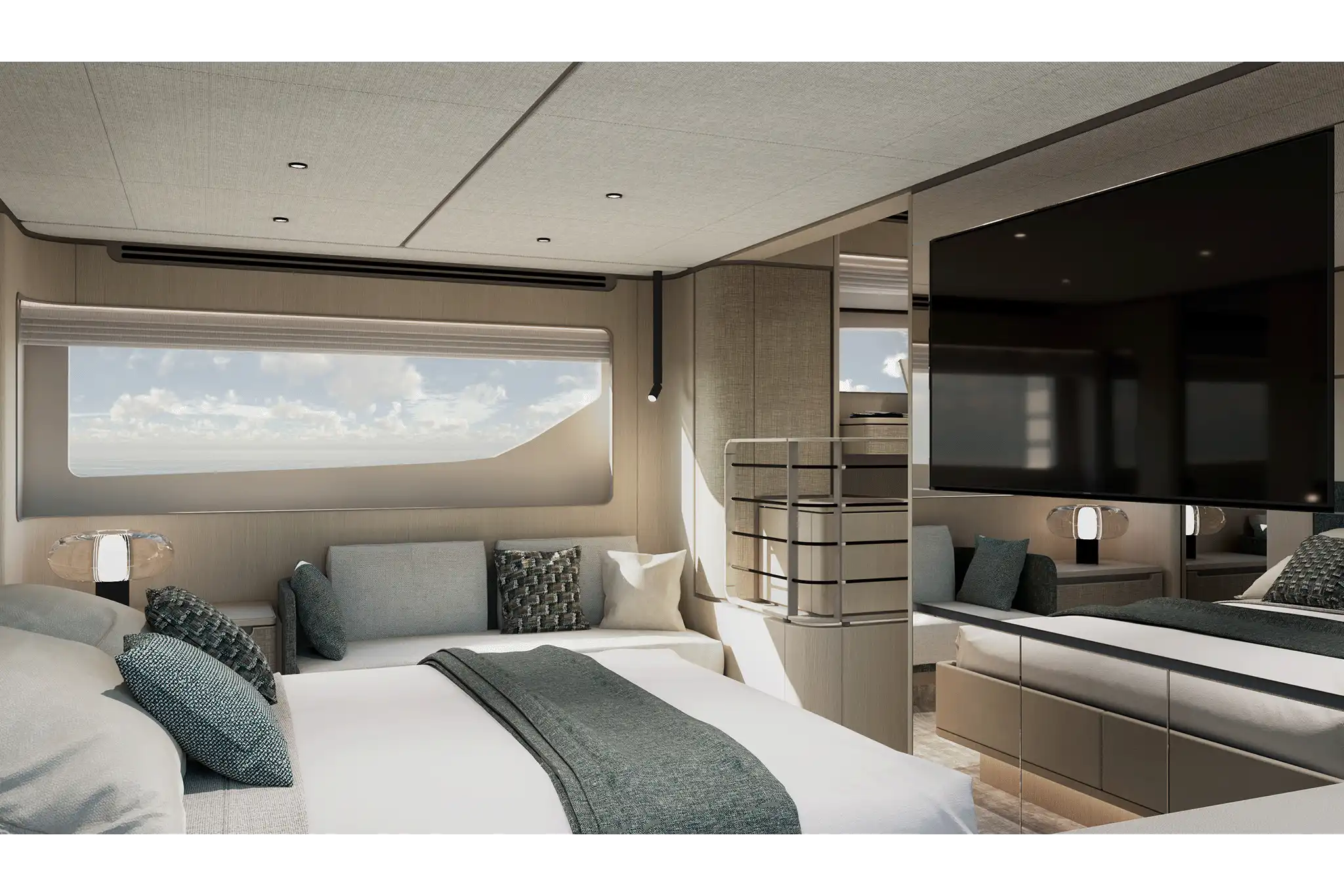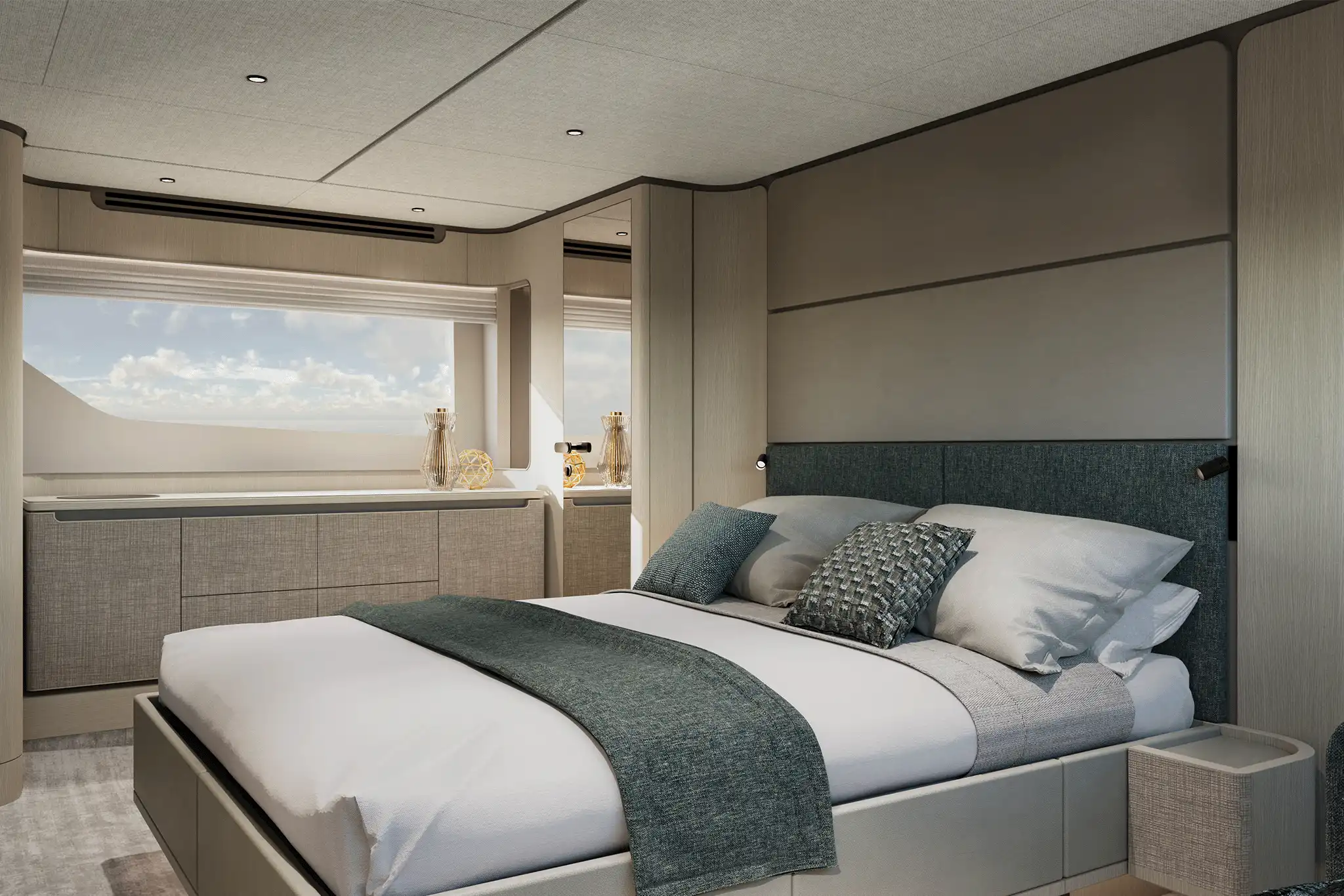 The master suite has been re-designed to include a new wardrobe in the entrance area and larger windows that let in natural light and add more to the panoramic view. Accommodation comprises a sumptuous five double cabin layout for ten plus three crew cabins for five crew. The lower deck is devoted entirely to guests and crew. The guest area has four cabins consisting of two mirror-image VIP cabins aft and two guest cabins forward, one of which fitted with separable and pullman beds. All the suites on the lower deck have an en-suite bathroom.