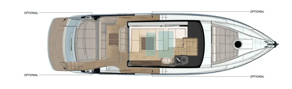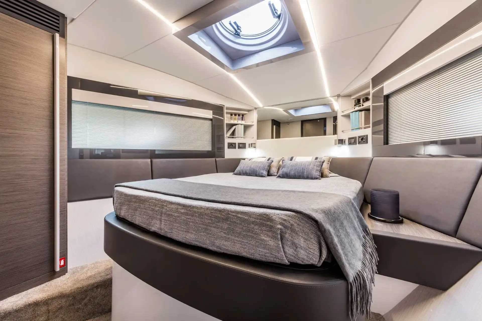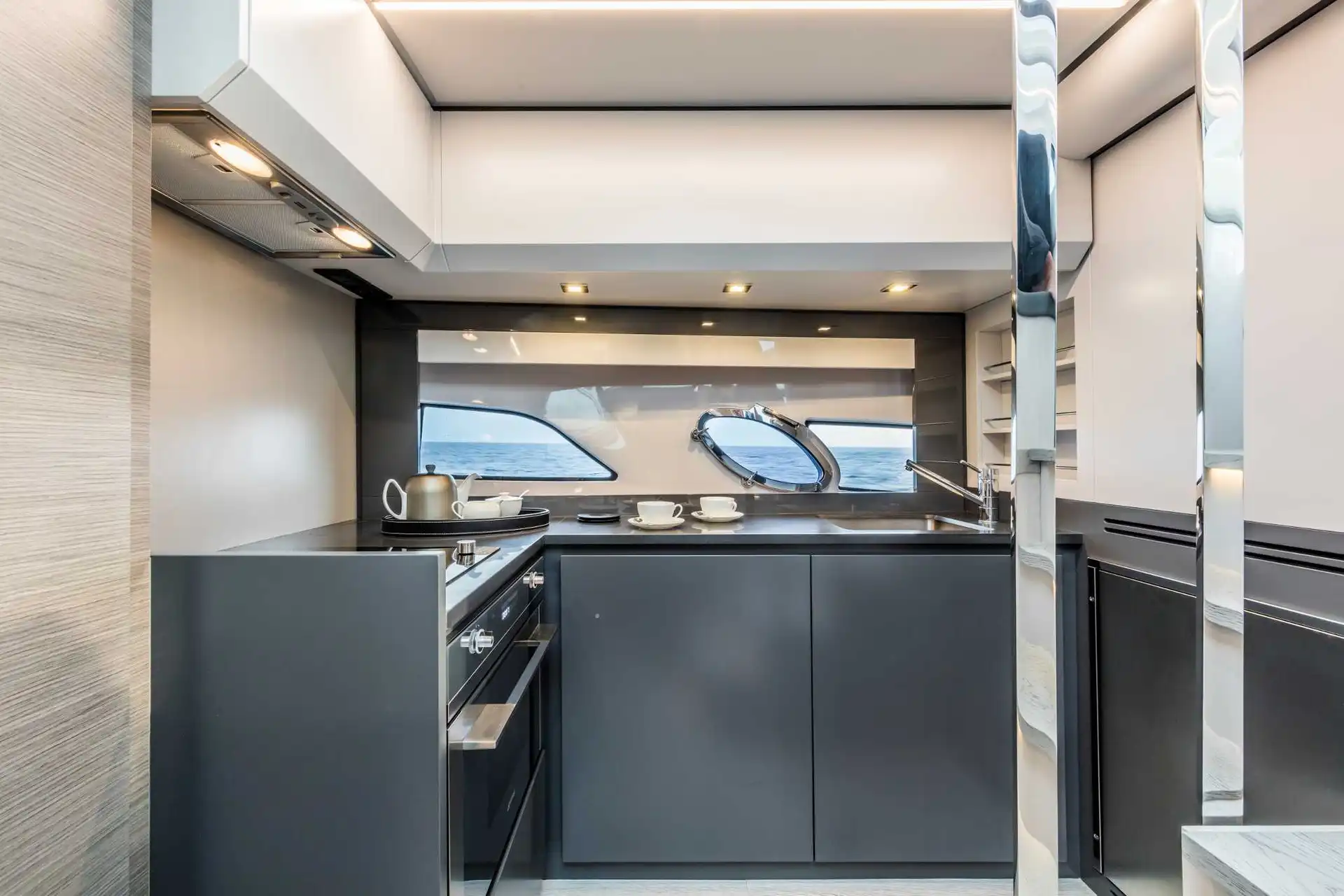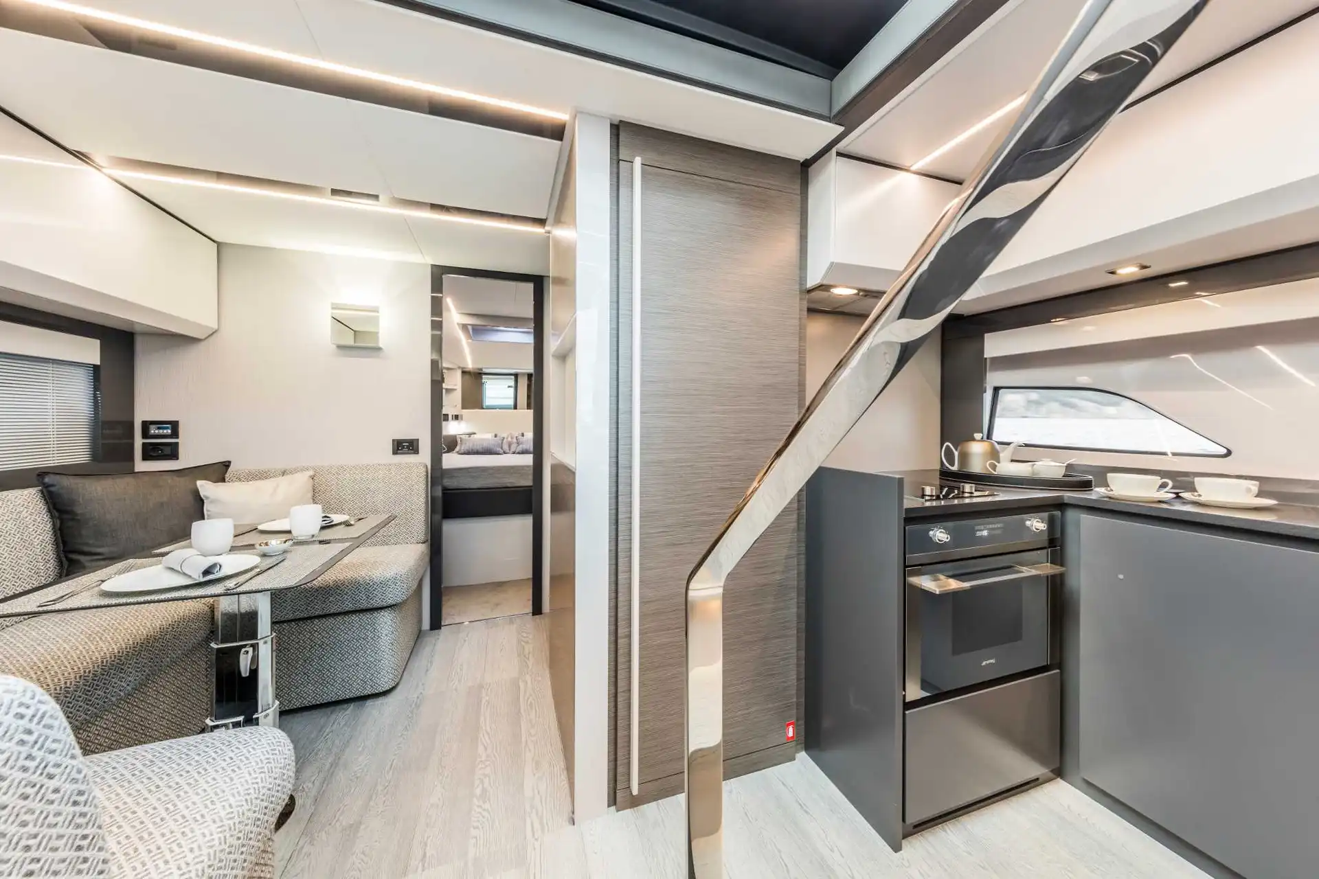 There's plenty of outside space to enjoy, with a foredeck sunbed, seating/dining in the aft cockpit, a huge aft sunbed and a stern platform. A neat stern garage houses a tender up to 2.8m.