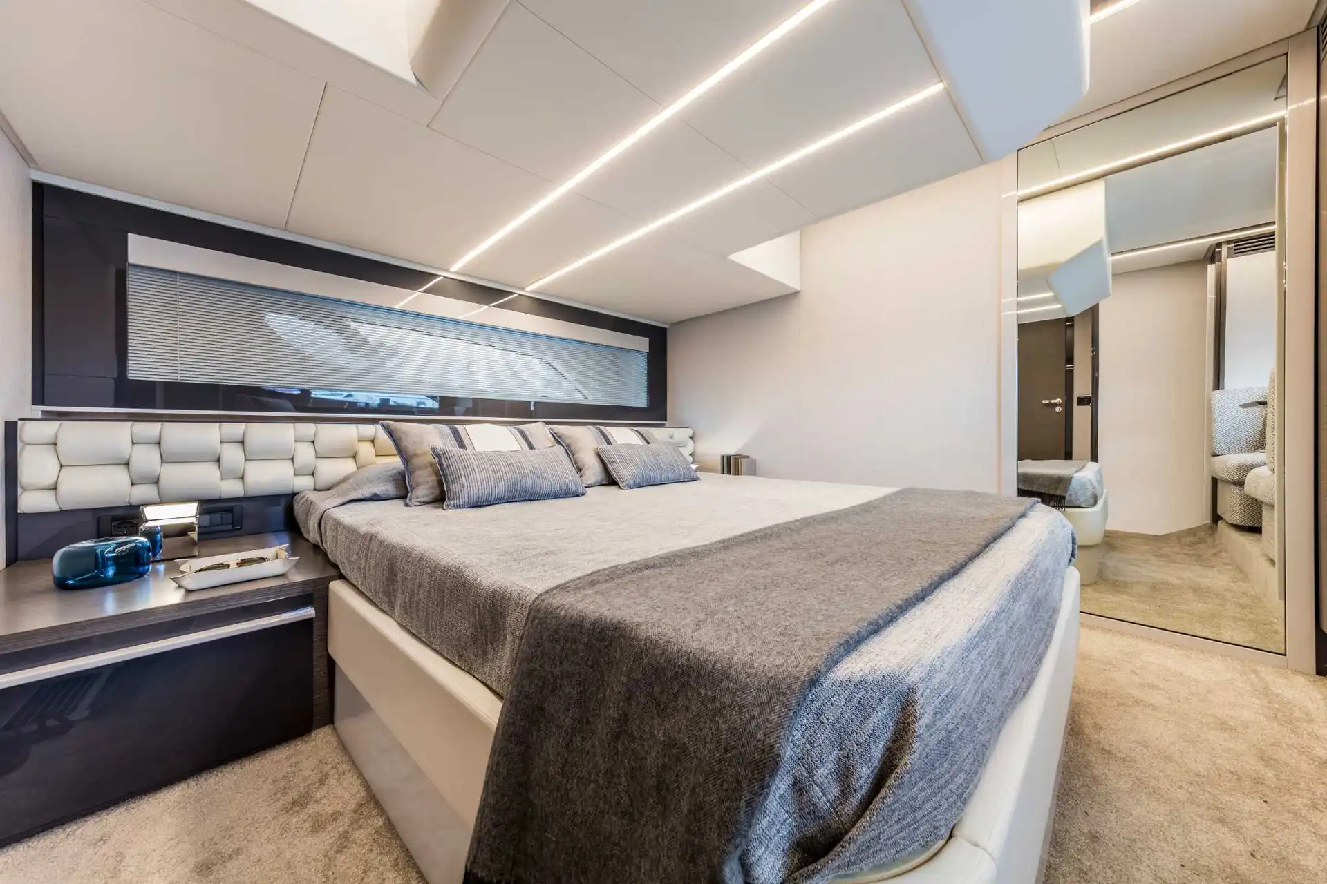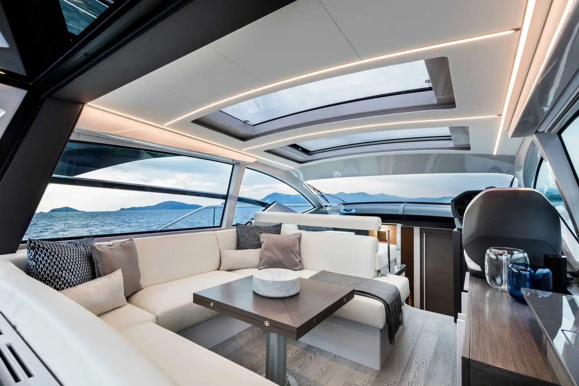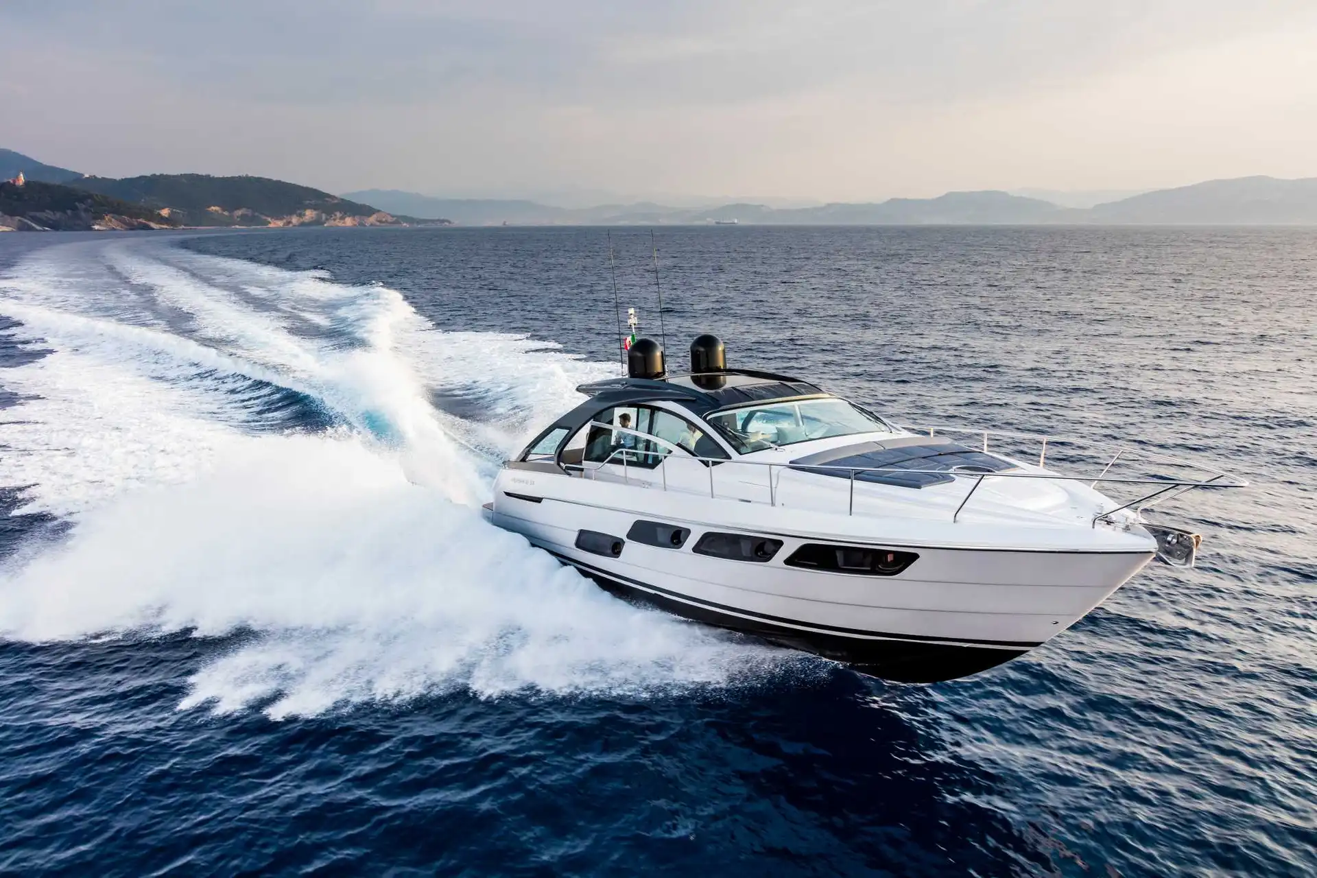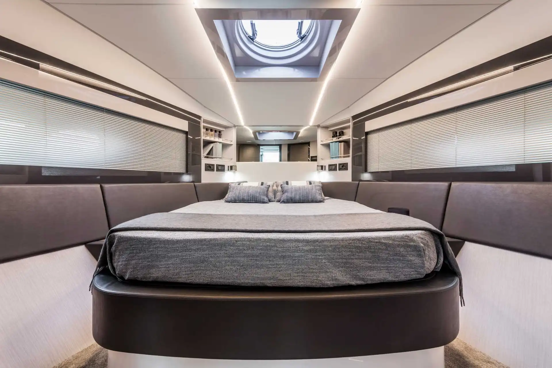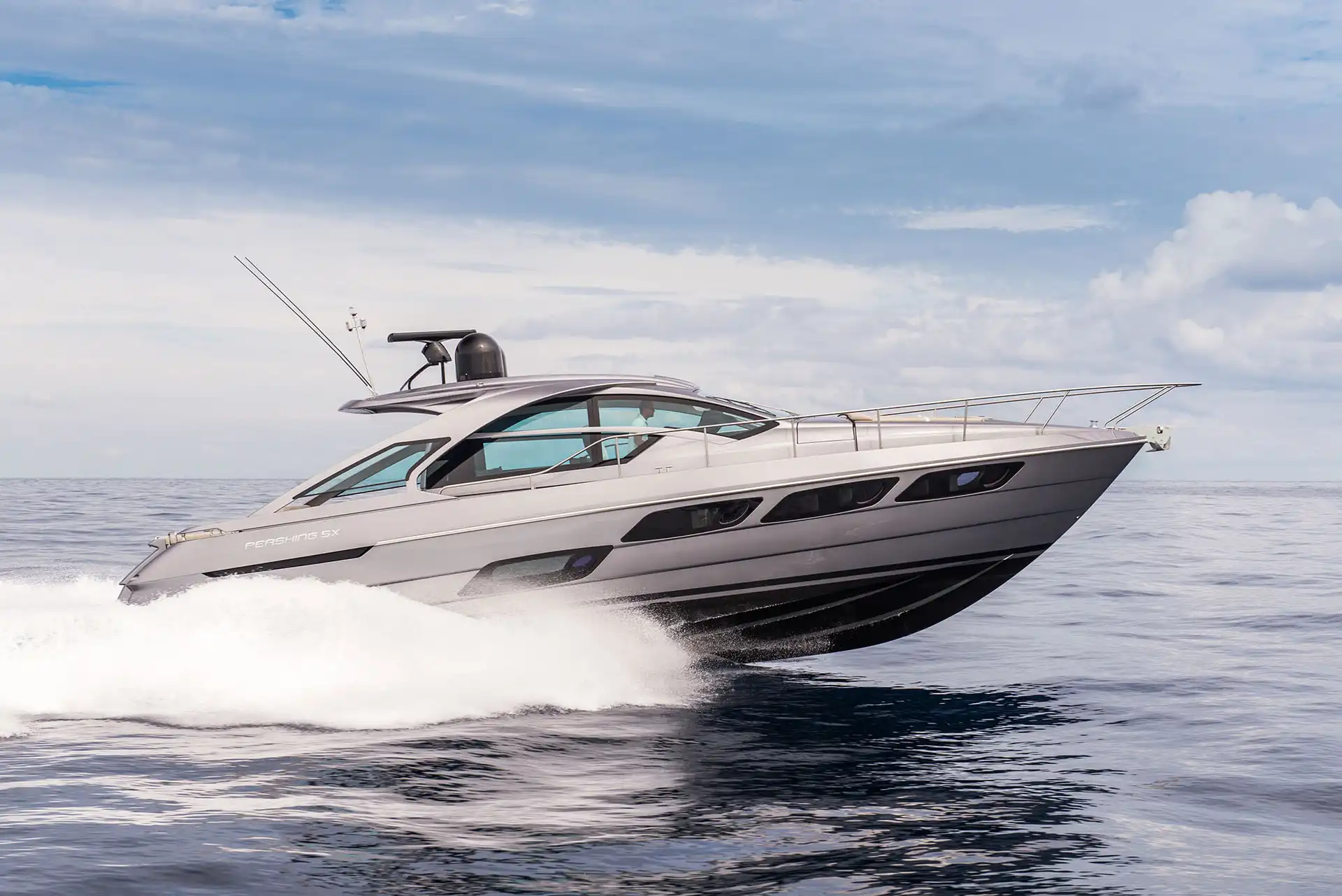 At 54ft overall, the 5x is the smallest, lightest and most nimble of the current Pershing fleet, and the only one powered by IPS drives. She was born of customers’ desire for a smaller, more economical Pershing, under 60ft, with all the usual Pershing style, and which also had the enclosed main deck saloon of the larger boats.
