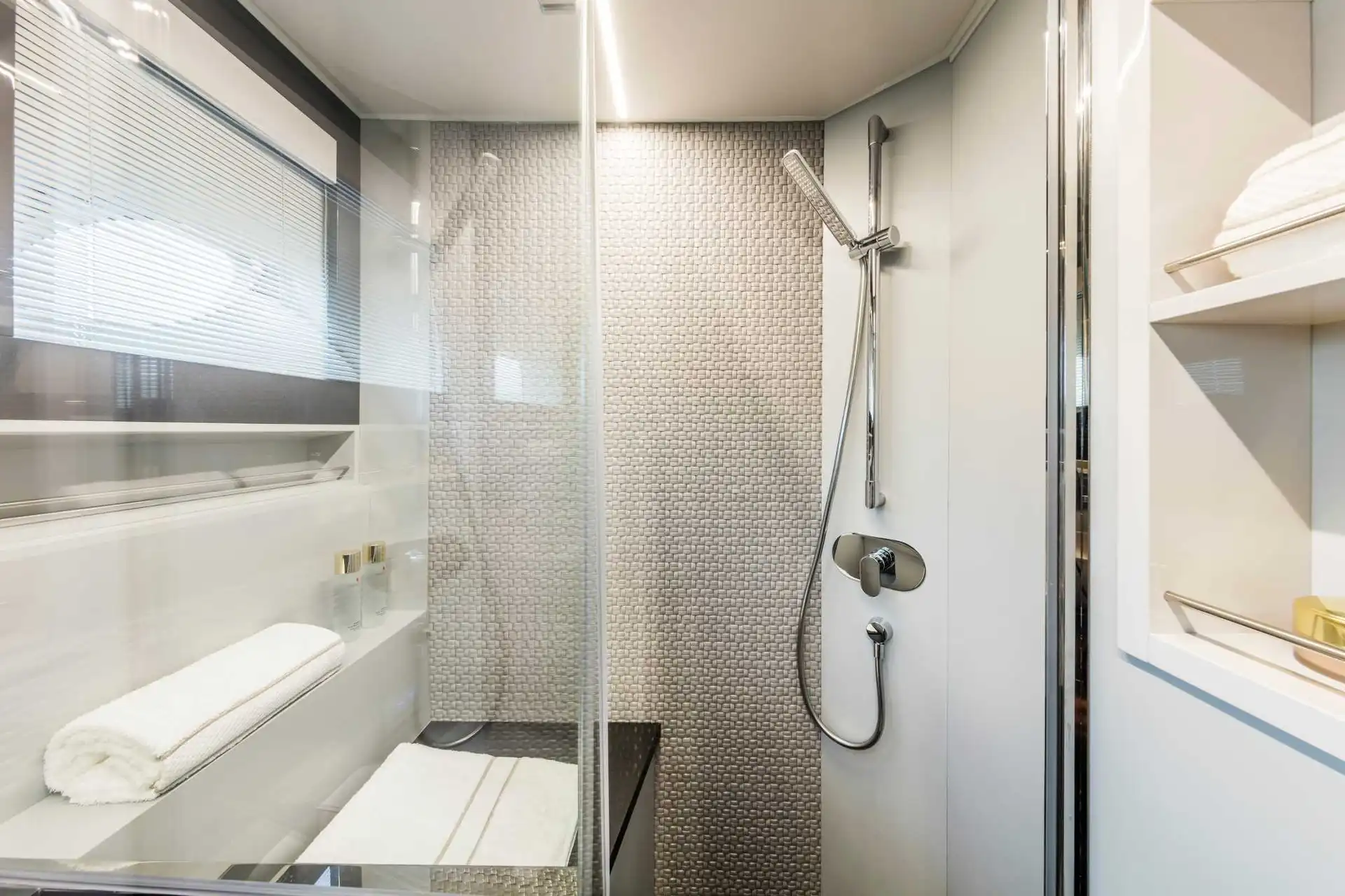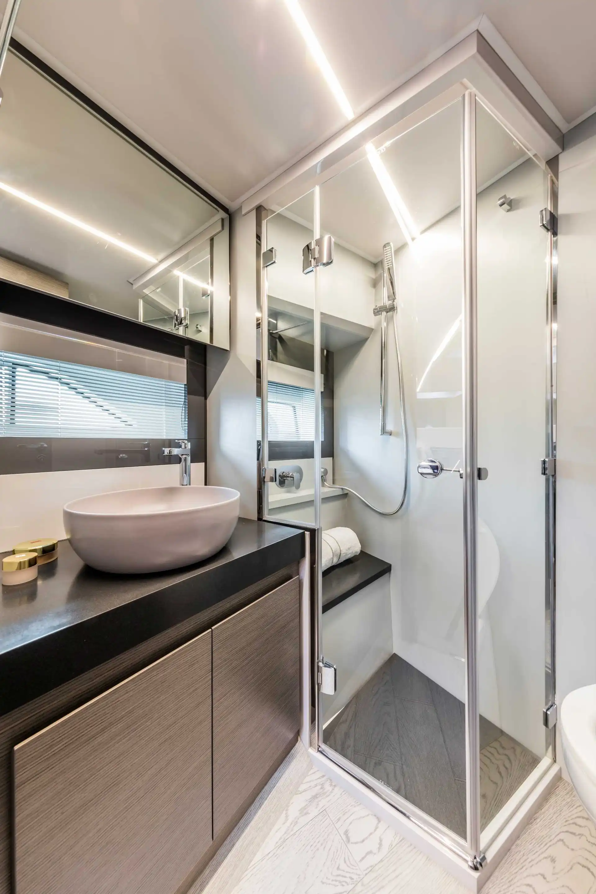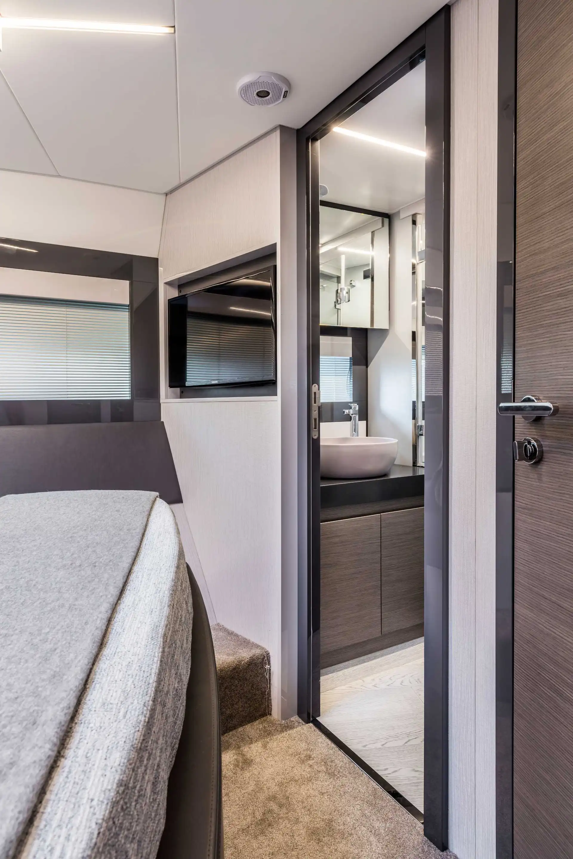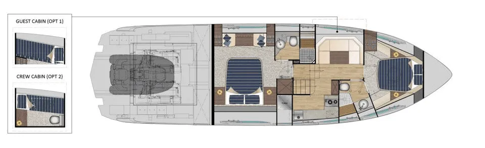 The master suite has been re-designed to include a new wardrobe in the entrance area and larger windows that let in natural light and add more to the panoramic view. Accommodation comprises a sumptuous five double cabin layout for ten plus three crew cabins for five crew. The lower deck is devoted entirely to guests and crew. The guest area has four cabins consisting of two mirror-image VIP cabins aft and two guest cabins forward, one of which fitted with separable and pullman beds. All the suites on the lower deck have an en-suite bathroom.