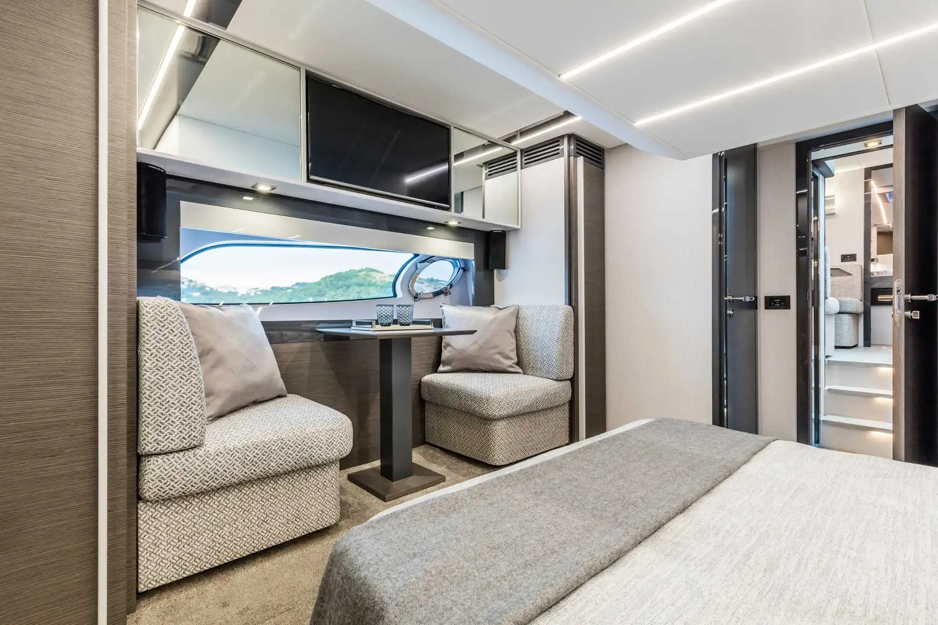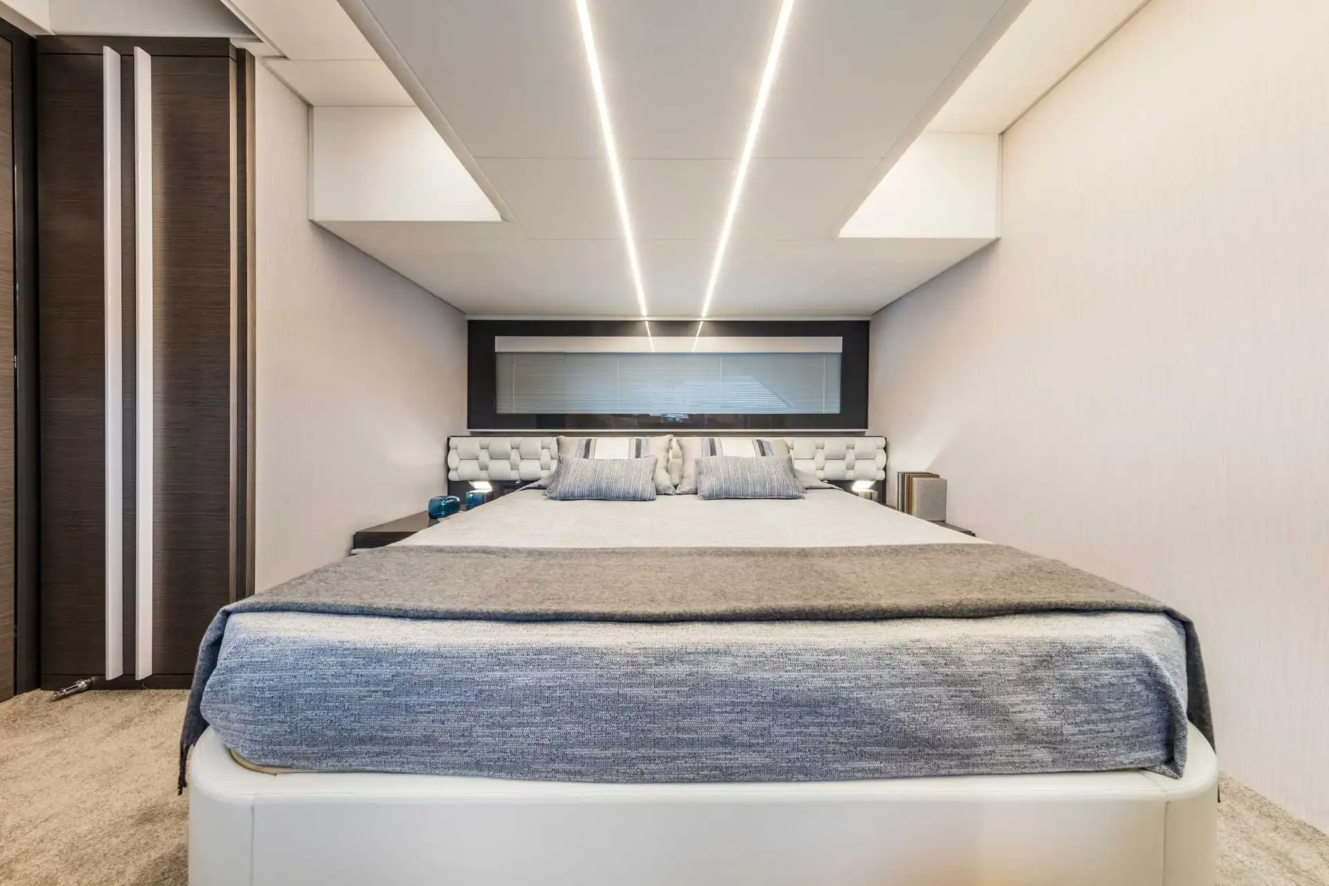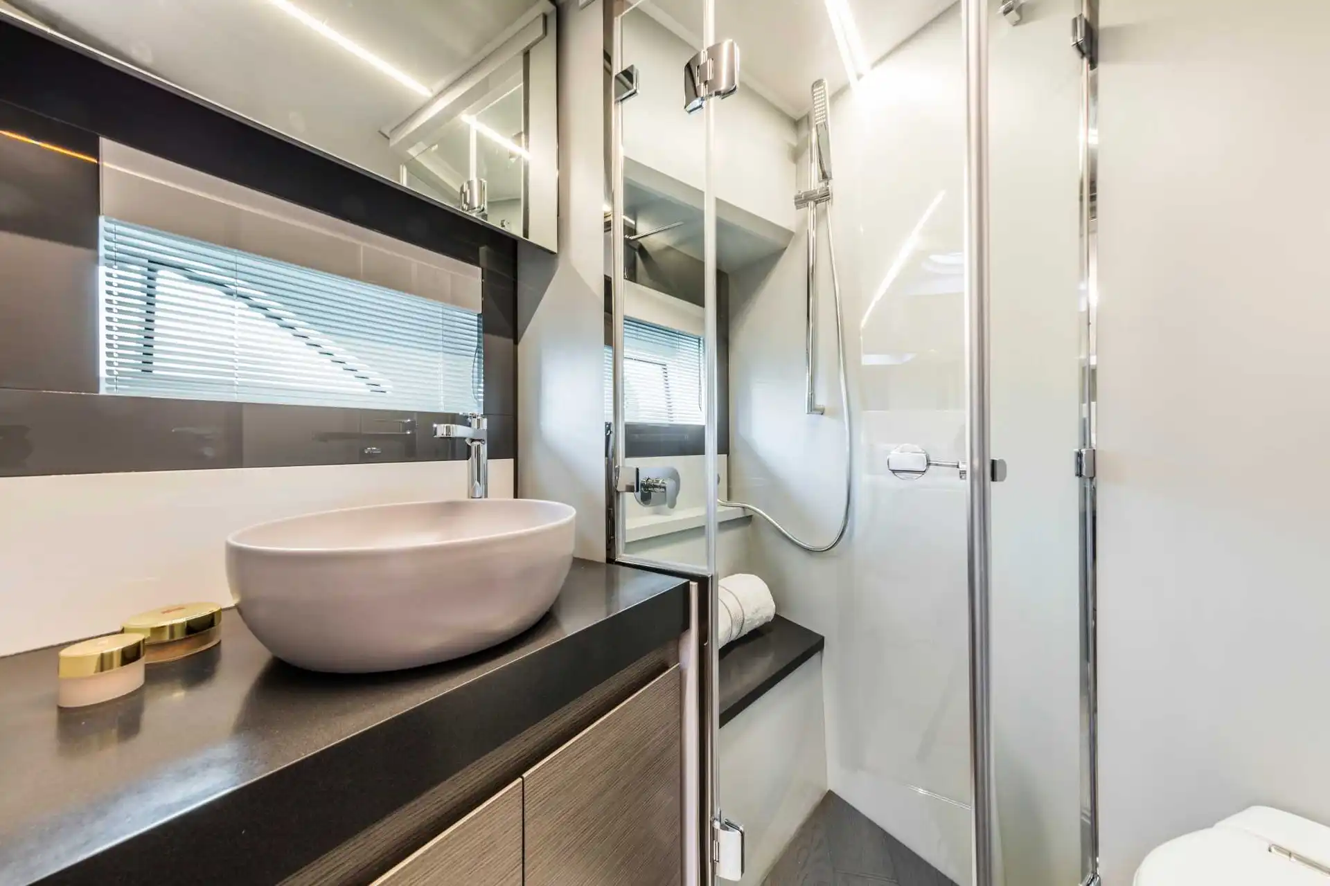 The master suite has been re-designed to include a new wardrobe in the entrance area and larger windows that let in natural light and add more to the panoramic view. Accommodation comprises a sumptuous five double cabin layout for ten plus three crew cabins for five crew. The lower deck is devoted entirely to guests and crew. The guest area has four cabins consisting of two mirror-image VIP cabins aft and two guest cabins forward, one of which fitted with separable and pullman beds. All the suites on the lower deck have an en-suite bathroom.