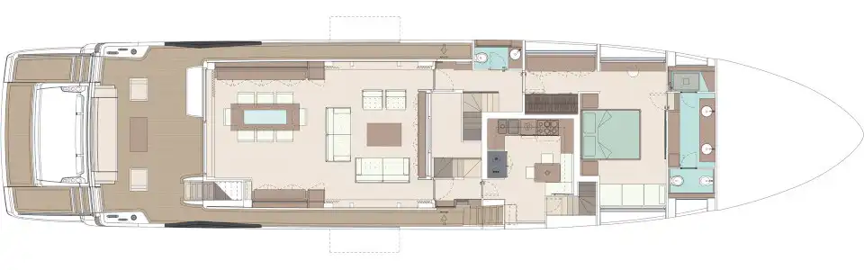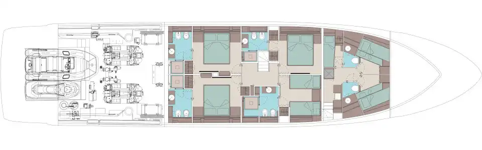The master suite has been re-designed to include a new wardrobe in the entrance area and larger windows that let in natural light and add more to the panoramic view. Accommodation comprises a sumptuous five double cabin layout for ten plus three crew cabins for five crew. The lower deck is devoted entirely to guests and crew. The guest area has four cabins consisting of two mirror-image VIP cabins aft and two guest cabins forward, one of which fitted with separable and pullman beds. All the suites on the lower deck have an en-suite bathroom.