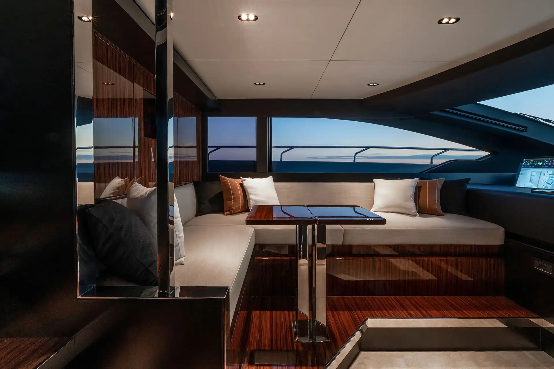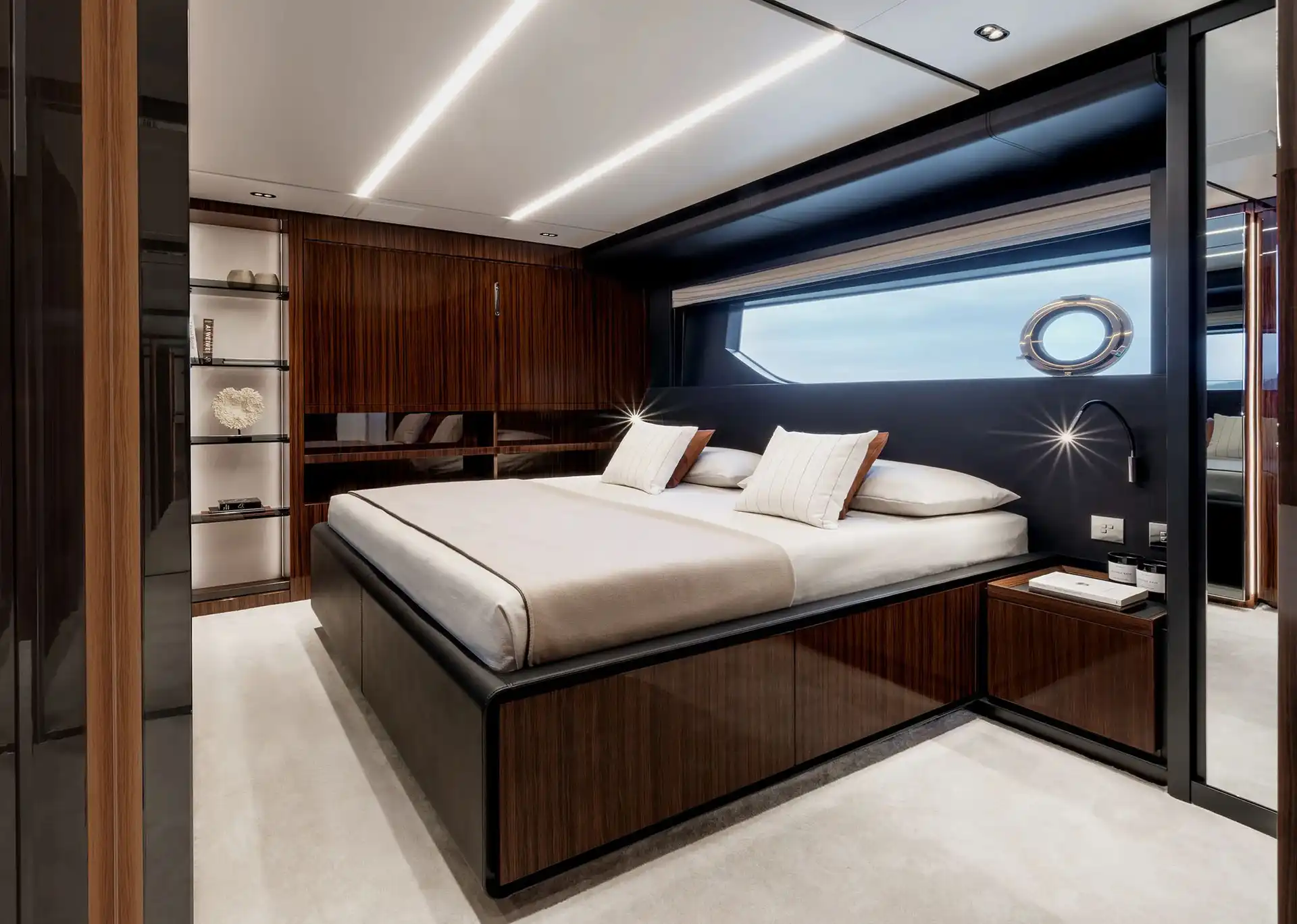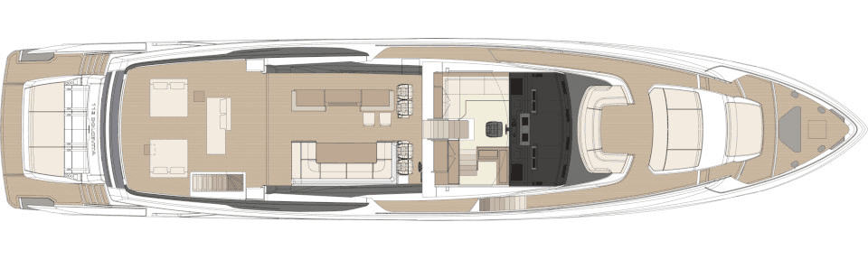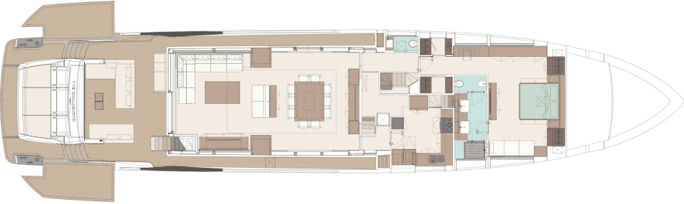 The spacious 24sqm cockpit is designed as a waterfront lounge and can be personalised according to the owner’s requirements and features two large sofas and freestanding furniture. In the bow area there is a large C-shaped sofa and an oversize sun pad with an opportunity for an optional jacuzzi. On the redesigned flybridge the generous living space again features freestanding furniture, a central cocktail bar and seating. A new revised feature is the engine room access from the starboard walkway, a solution that improves operational functionality while ensuring guest privacy.
