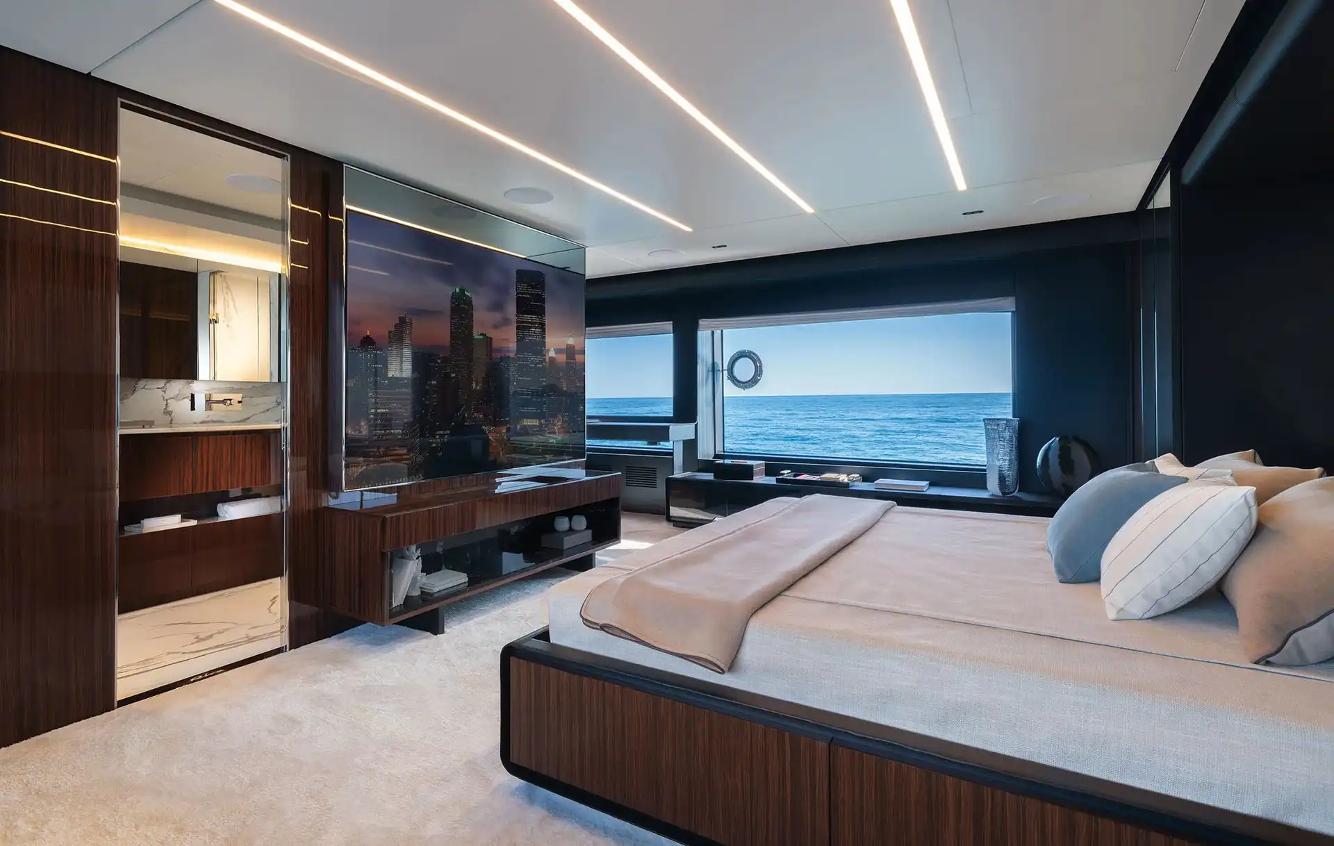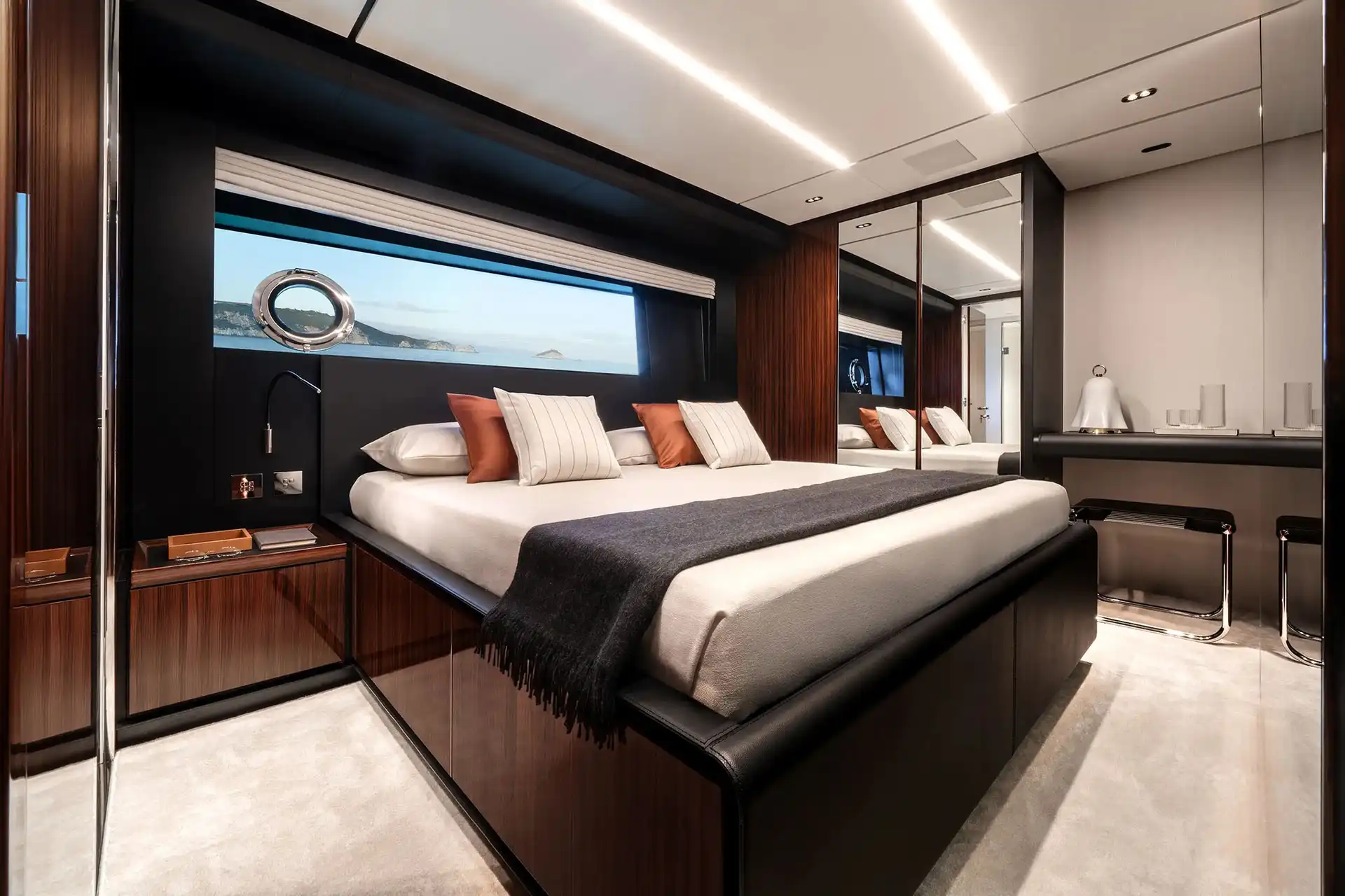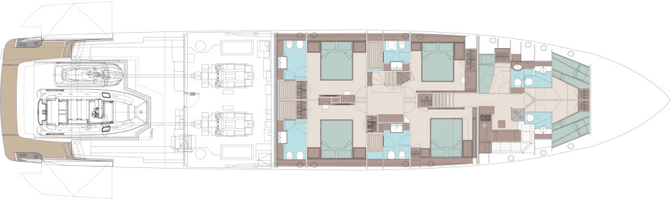 The master suite has been re-designed to include a new wardrobe in the entrance area and larger windows that let in natural light and add more to the panoramic view. Accommodation comprises a sumptuous five double cabin layout for ten plus three crew cabins for five crew. The lower deck is devoted entirely to guests and crew. The guest area has four cabins consisting of two mirror-image VIP cabins aft and two guest cabins forward, one of which fitted with separable and pullman beds. All the suites on the lower deck have an en-suite bathroom.