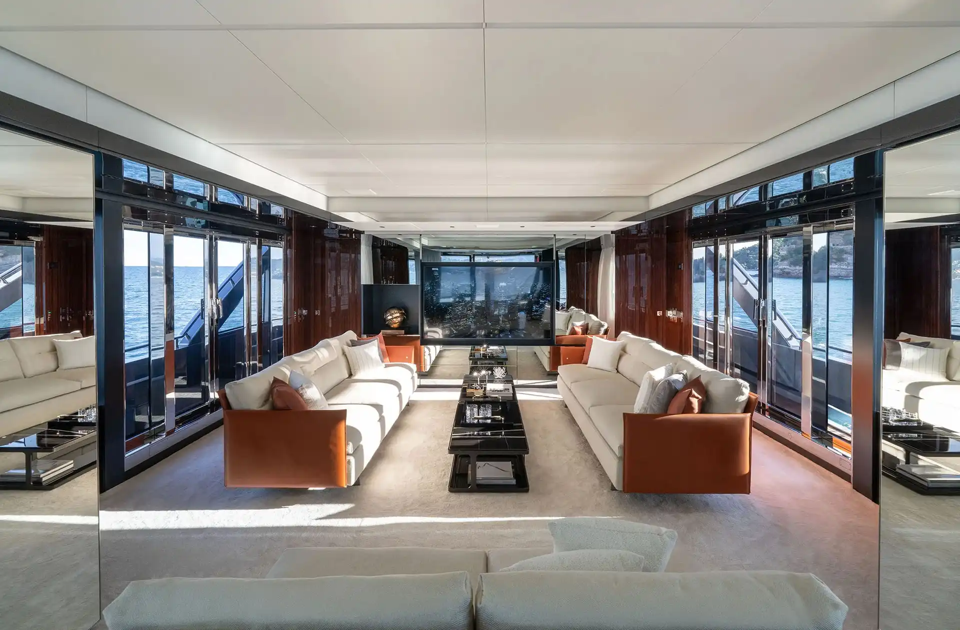 The interior spaces for this substantial upgrade has been created with a radical restyling. The main deck lounge can be configured with two different layouts: one has the dining area aft and the lounge midships, while the alternative layout is more traditional, with the lounge area and generous sofas in the entry area and the dining area in the centre. The large, elegant main salon, which covers over 50m² and has high ceilings, more than 2 metres throughout and over 2.25m at the highest point. High gloss rosewood is the featured wood, paired with black hammered leather elements and lacquered surfaces that reflect the light flooding in through the large side windows