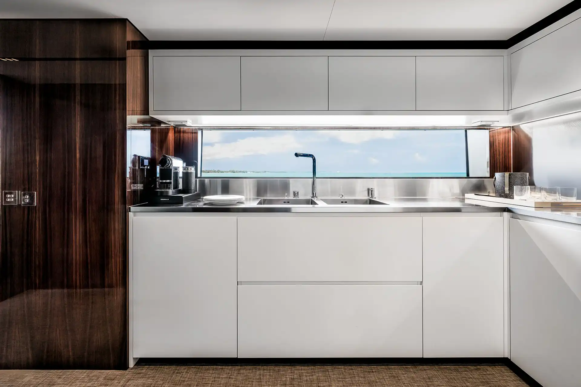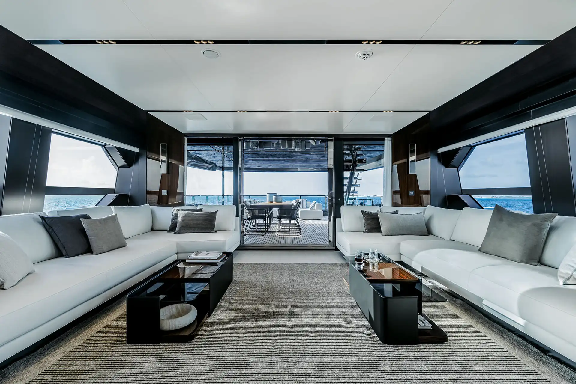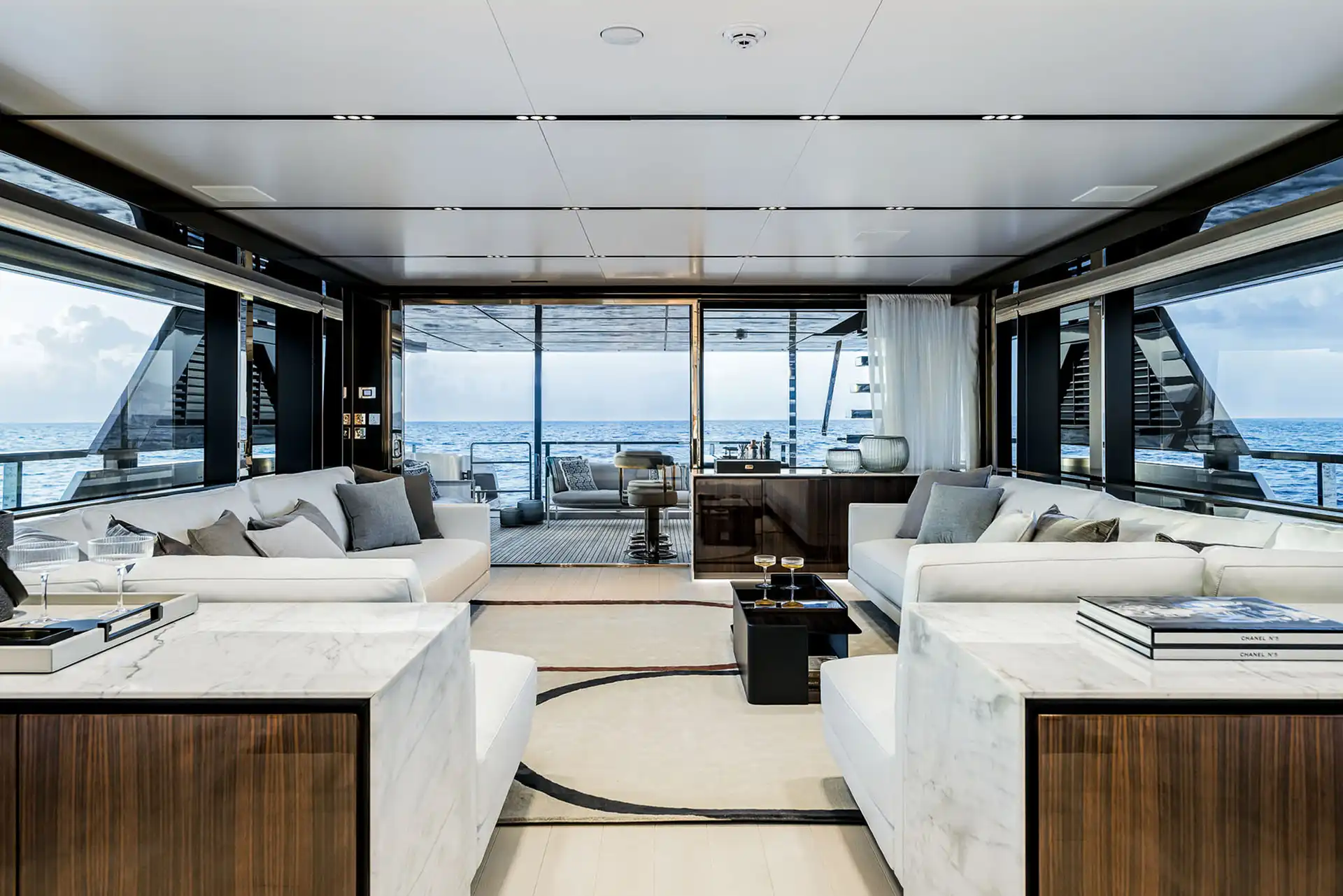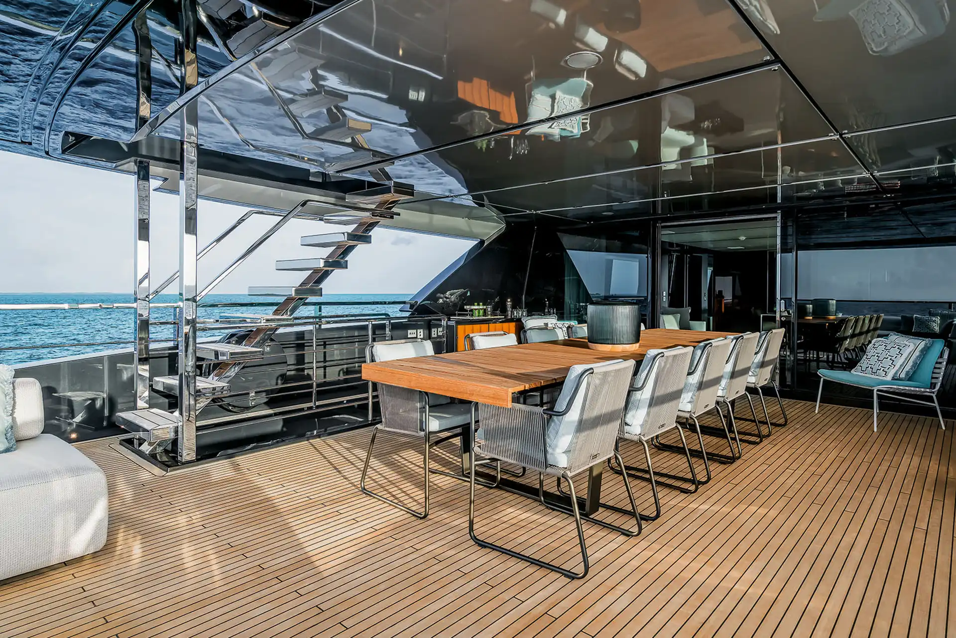 With four sublime decks, the variety of outside spaces is astonishing. Both the upper and sun decks provide 10-person dining areas, as well as open-plan aft spaces with freestanding lounge furniture and spectacular views.