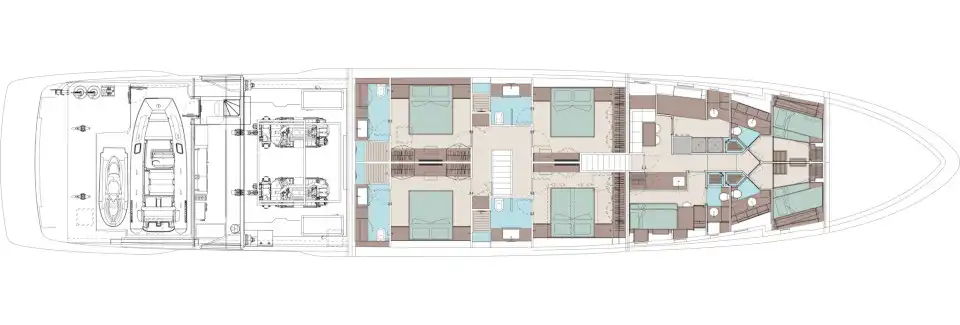 The master suite has been re-designed to include a new wardrobe in the entrance area and larger windows that let in natural light and add more to the panoramic view. Accommodation comprises a sumptuous five double cabin layout for ten plus three crew cabins for five crew. The lower deck is devoted entirely to guests and crew. The guest area has four cabins consisting of two mirror-image VIP cabins aft and two guest cabins forward, one of which fitted with separable and pullman beds. All the suites on the lower deck have an en-suite bathroom.