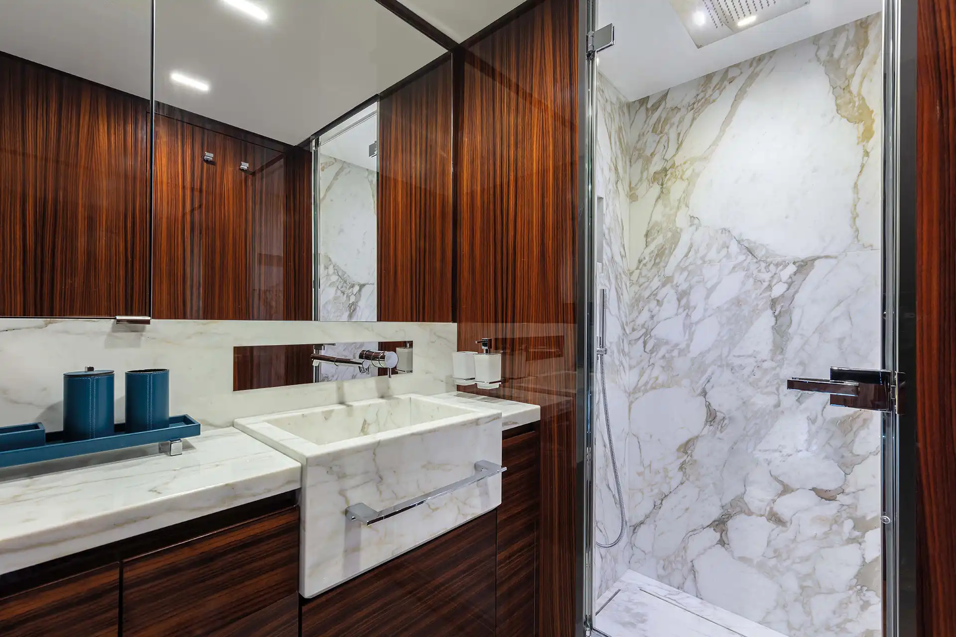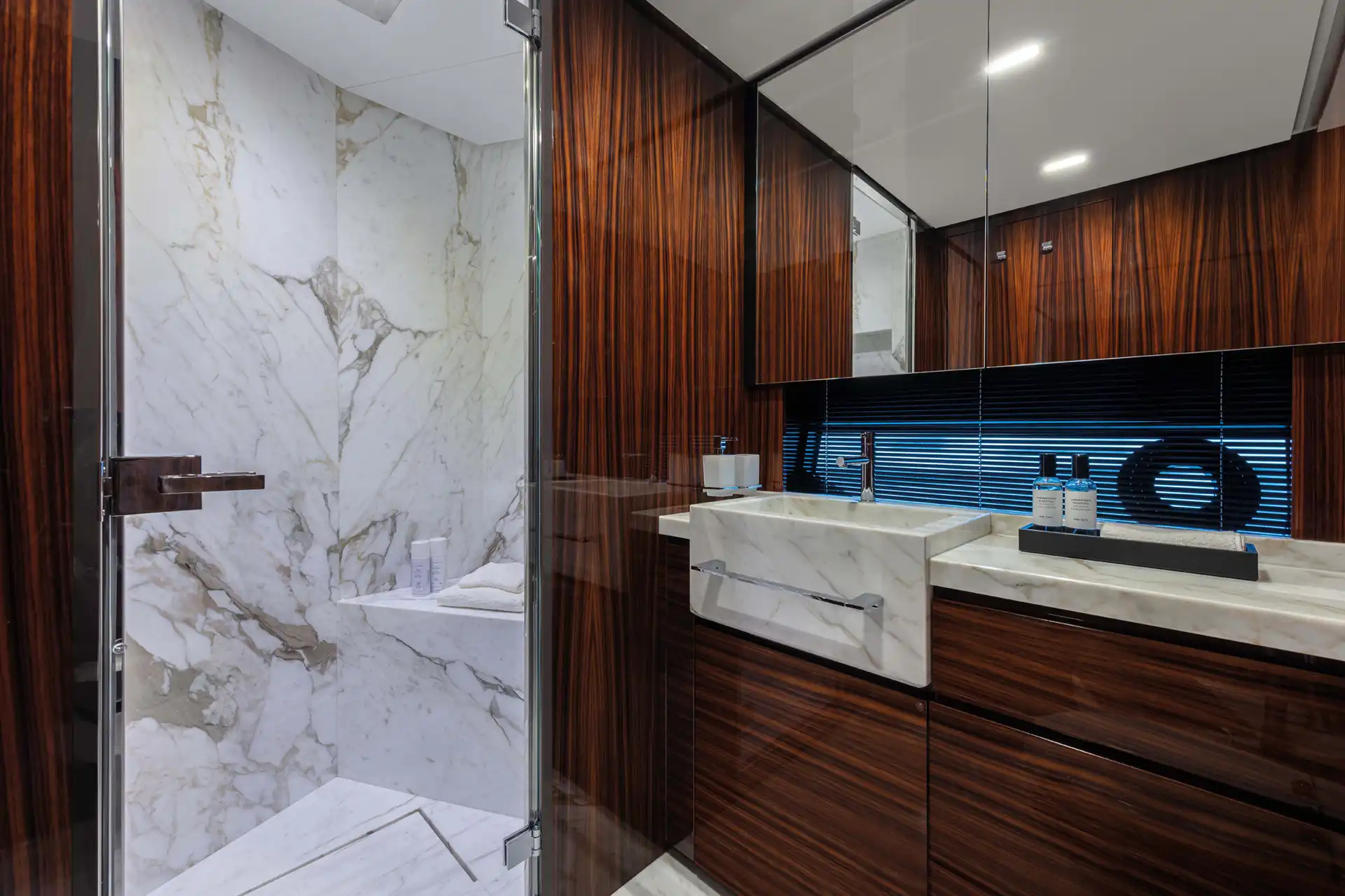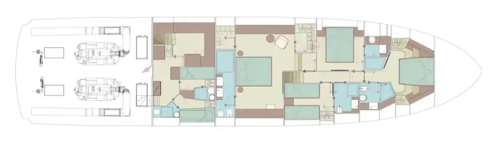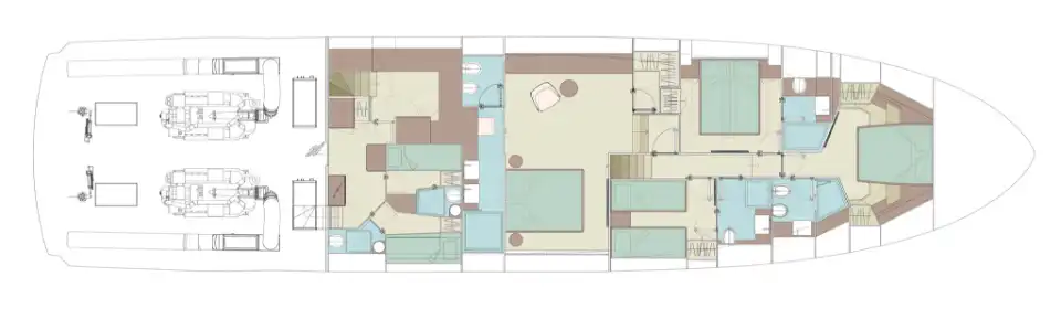 The master suite has been re-designed to include a new wardrobe in the entrance area and larger windows that let in natural light and add more to the panoramic view. Accommodation comprises a sumptuous five double cabin layout for ten plus three crew cabins for five crew. The lower deck is devoted entirely to guests and crew. The guest area has four cabins consisting of two mirror-image VIP cabins aft and two guest cabins forward, one of which fitted with separable and pullman beds. All the suites on the lower deck have an en-suite bathroom.
