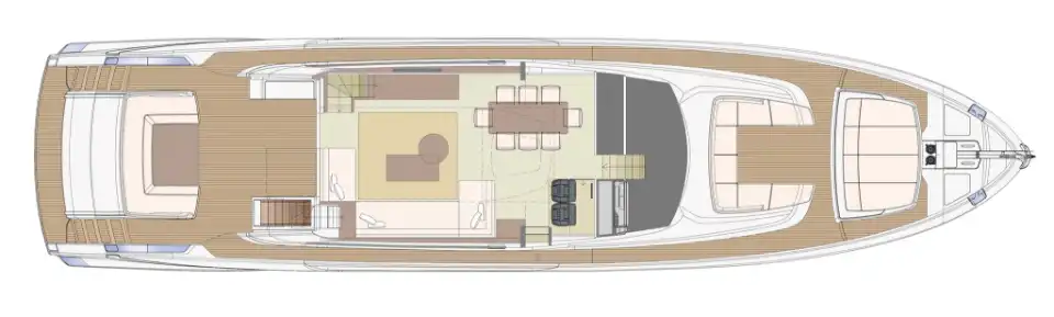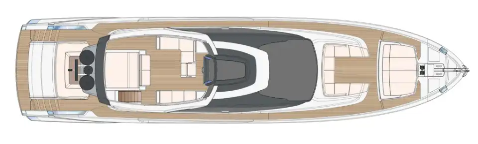 At first glance you would hardly notice that the 88 Folgore is actually a flybridge yacht with a substantial top deck, Riva's designers have done such a good job of concealing the top deck in that beautifully sleek, flowing profile.And the way they have so discretely and elegantly incorporated huge windows, both in the saloon and in the hull for the lower deck, is sheer genius. Every inch of deck space is used to superb effect, including a wonderful aft deck dining area, extensive seating and lounging areas on the flybridge and even more on the foredeck.