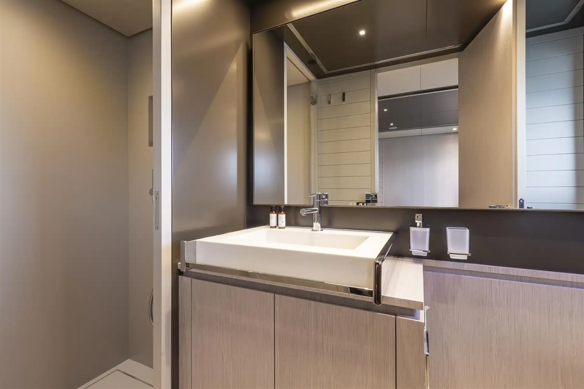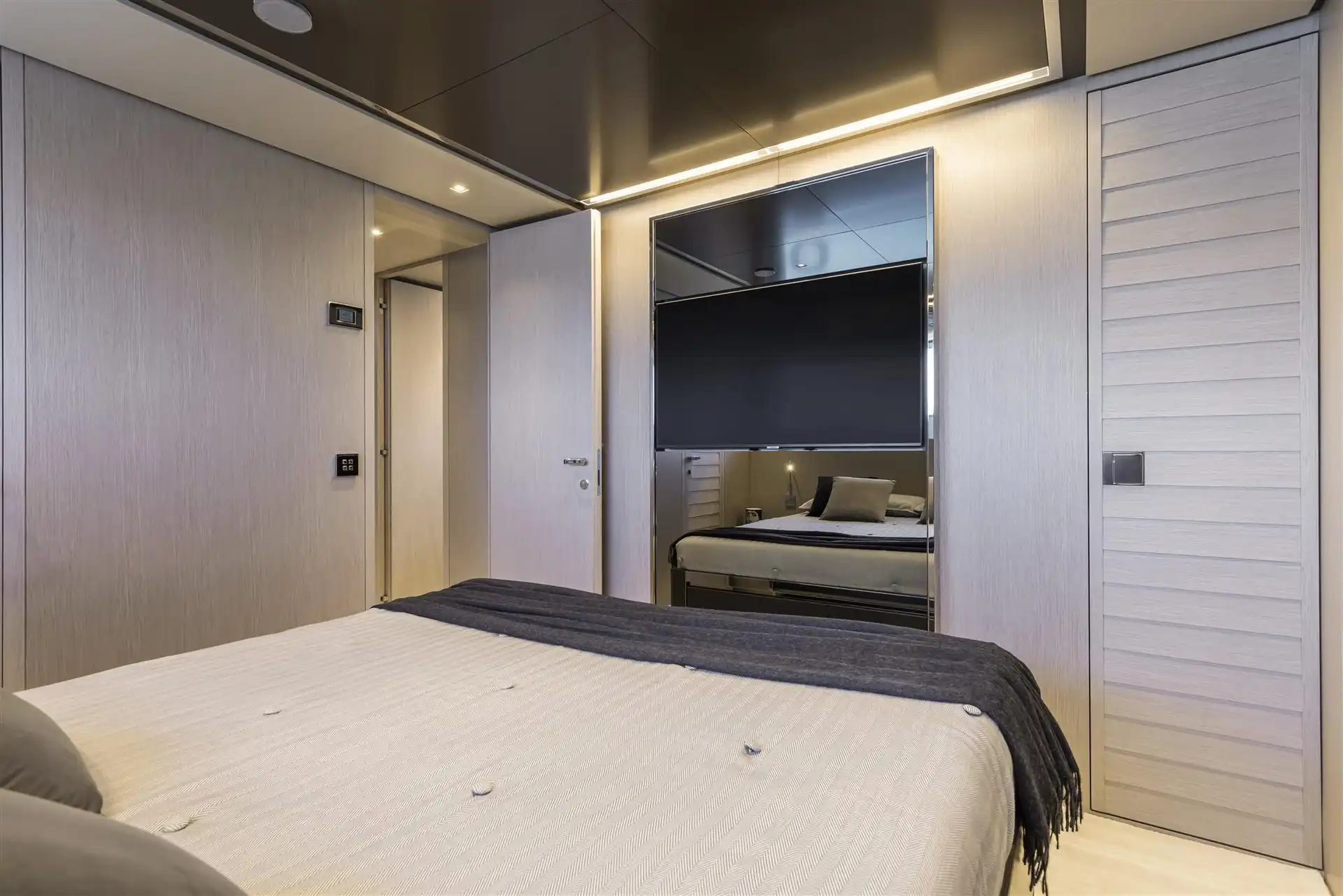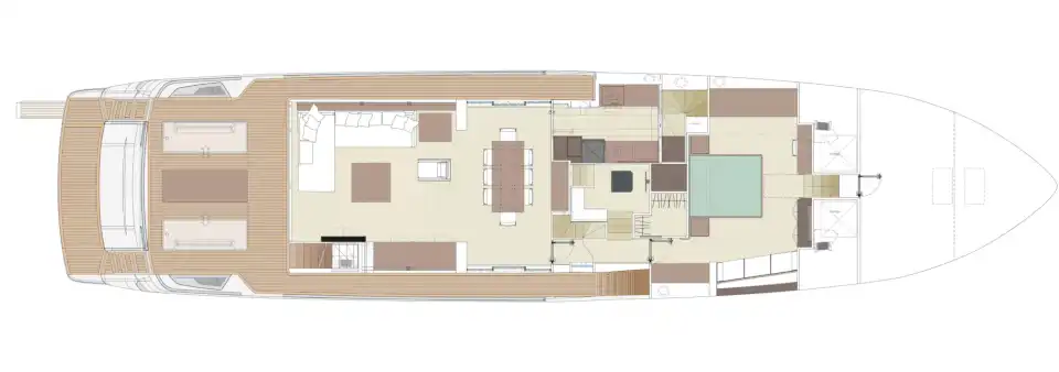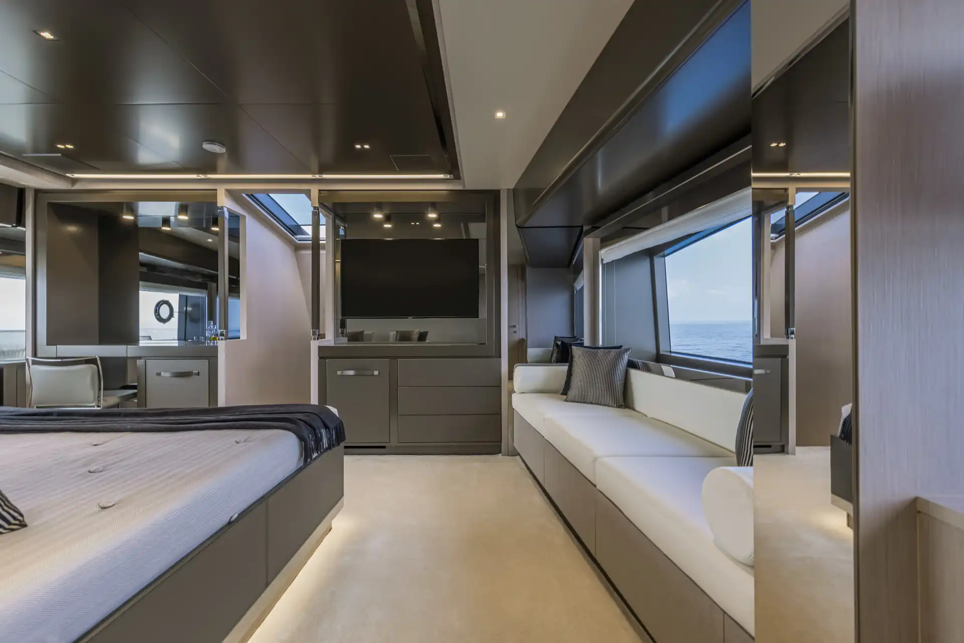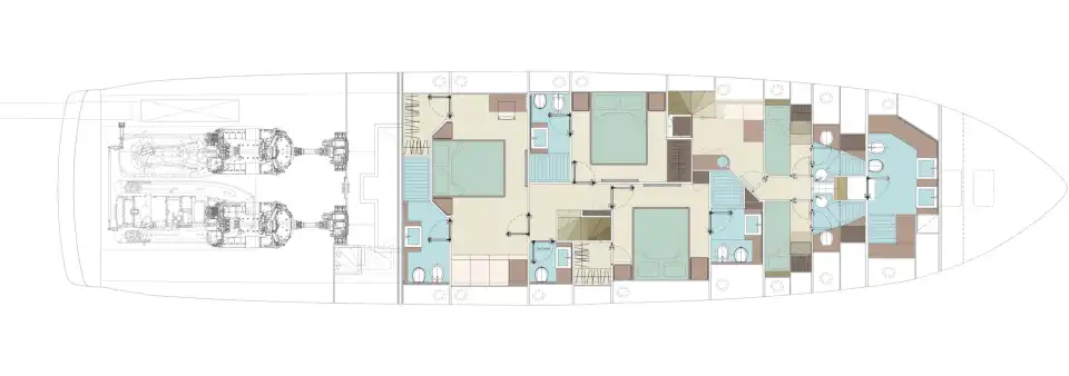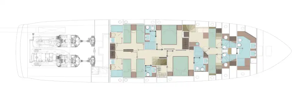 The master suite has been re-designed to include a new wardrobe in the entrance area and larger windows that let in natural light and add more to the panoramic view. Accommodation comprises a sumptuous five double cabin layout for ten plus three crew cabins for five crew. The lower deck is devoted entirely to guests and crew. The guest area has four cabins consisting of two mirror-image VIP cabins aft and two guest cabins forward, one of which fitted with separable and pullman beds. All the suites on the lower deck have an en-suite bathroom.