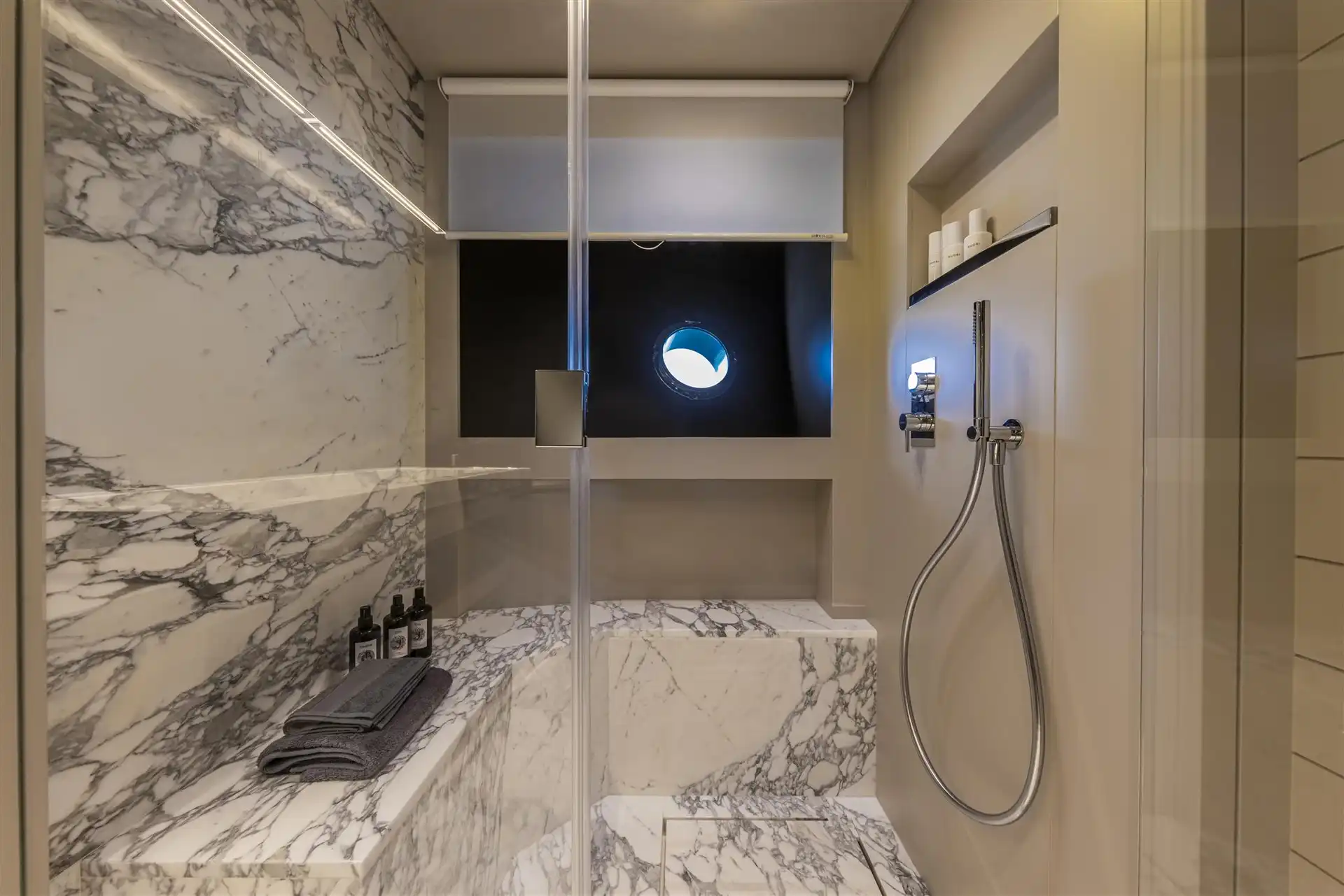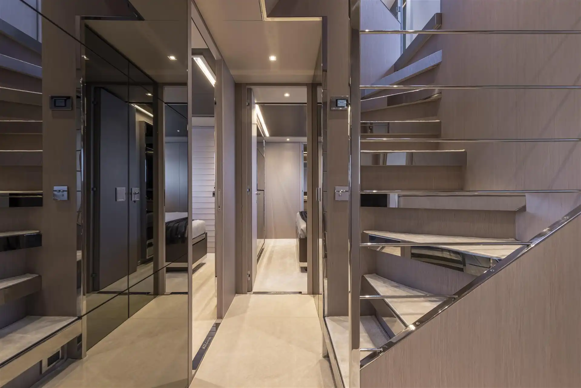 On the aft deck, the dining table sits fore and aft, in superyacht style, so no-one has their back to the views. And right at the stern is Riva's latest slick touch: steps that retract when not in use. The garage will accommodate a Williams 395 jet tender and a PWC.