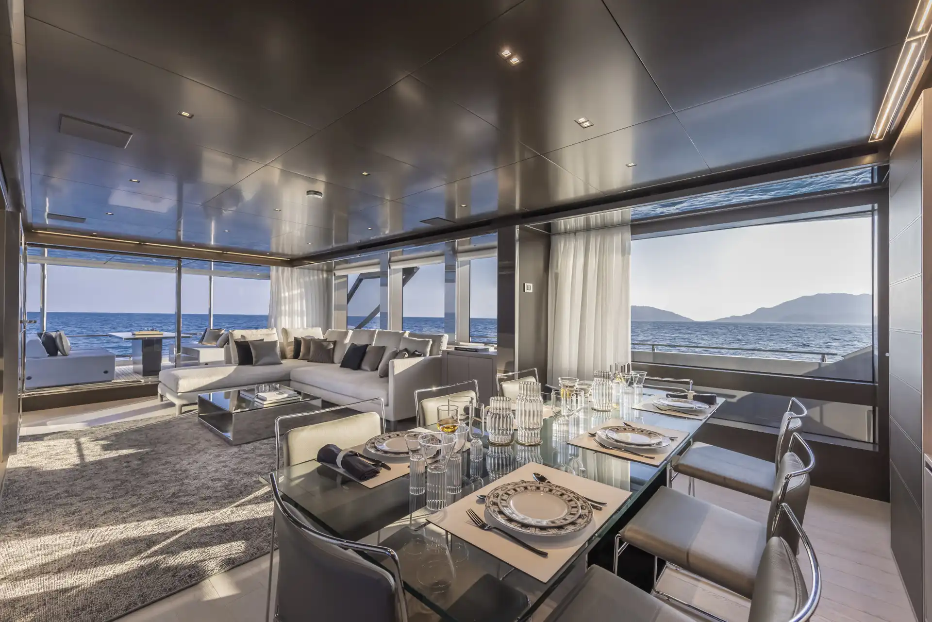 The interior spaces for this substantial upgrade has been created with a radical restyling. The main deck lounge can be configured with two different layouts: one has the dining area aft and the lounge midships, while the alternative layout is more traditional, with the lounge area and generous sofas in the entry area and the dining area in the centre. The large, elegant main salon, which covers over 50m² and has high ceilings, more than 2 metres throughout and over 2.25m at the highest point. High gloss rosewood is the featured wood, paired with black hammered leather elements and lacquered surfaces that reflect the light flooding in through the large side windows