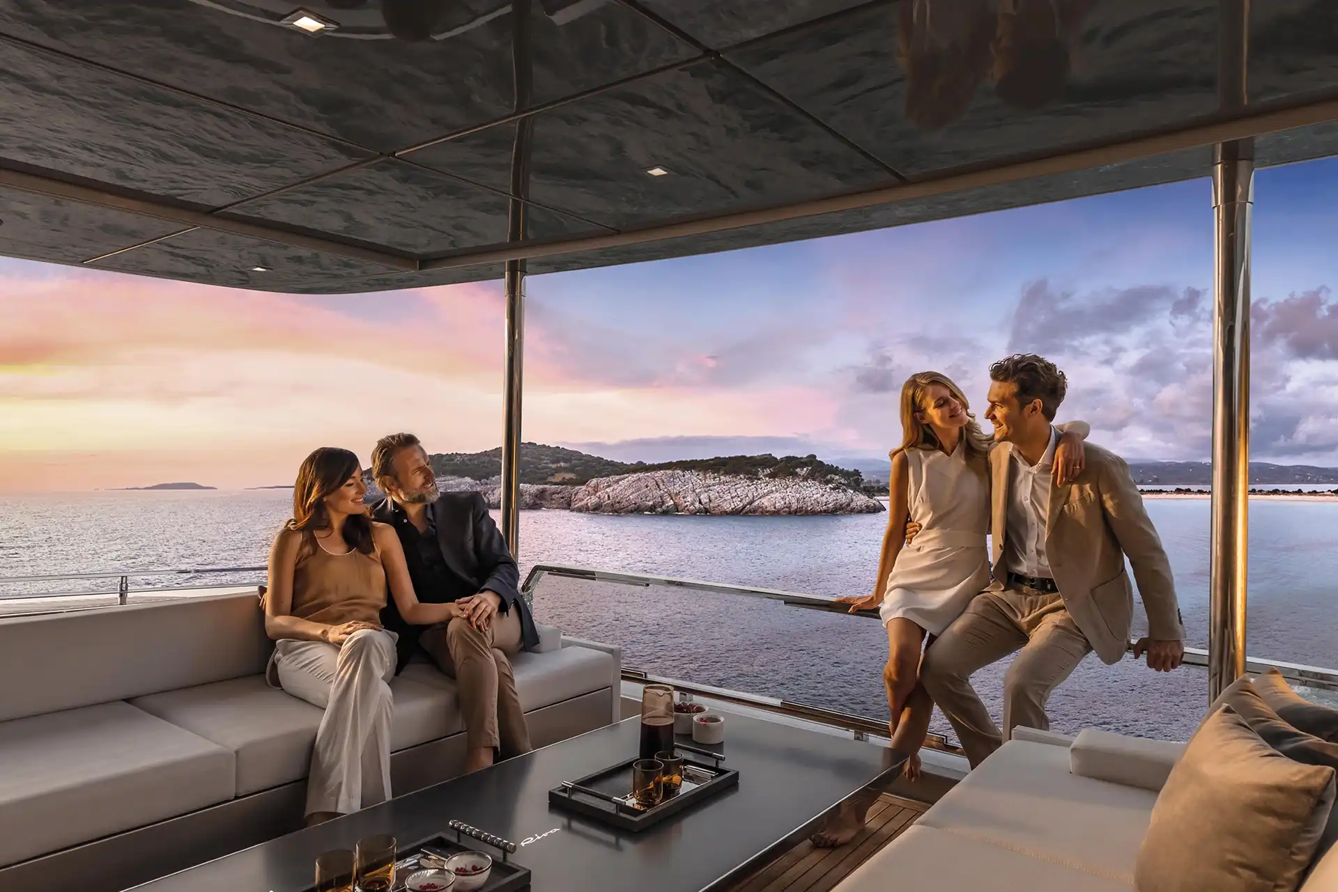 'Delightfully secluded and discreet' sums up the outside spaces on the Riva 90 Argo. Raised sides and a partial hardtop provide screening and protection for the lovely flybridge sundeck.